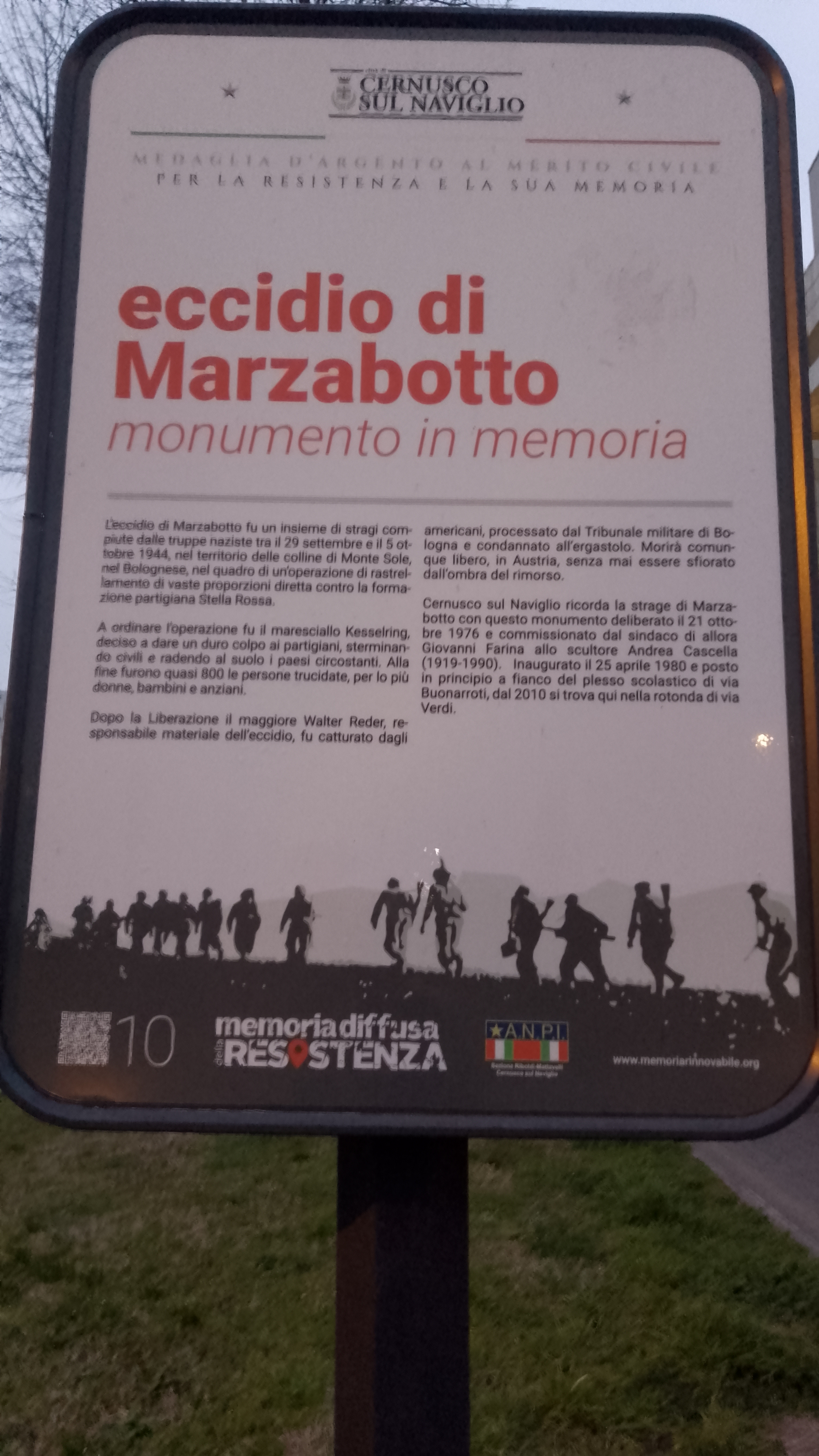 Monumento dei caduti di Santa Maria del Giudice Lucca (LU) Lapide ai ferrovieri caduti Firenze (FI) Monumento per il massacro di Monte Sole Marzabotto (BO) Monumento a Fornasini ed altri Marzabotto (BO) Vecchi sepolcri del cimitero di San Martino Marzabotto (BO) Lapide del cimitero di San Martino Marzabotto (BO) Lapide a Fornasini Marzabotto (BO) Croci al Casone di Riomoneta Monzuno (BO) Monumento agli uccisi di Ca' di Beguzzi Marzabotto (BO) Podere di Canovetta Marzabotto (BO) Monumento ai Martiri di Marzabotto Marzabotto (BO) Sacrario dei Martiri di Marzabotto Marzabotto (BO) Monumento agli uccisi della Botte di Pioppe Grizzana Morandi (BO) Murale di Pioppe Grizzana Morandi (BO) Monumento ai martiri della Creda Grizzana Morandi (BO) Sacrario dei caduti della Creda Grizzana Morandi (BO) Monumento per il 50° dell'eccidio di Monte Sole Marzabotto (BO) Rovine dell'oratorio di Cerpiano Monzuno (BO) Rovine di Caprara di Sopra Marzabotto (BO) Poderi Casetta e Podella Marzabotto (BO) Percorso degli eccidi della Creda, di Maccagnano e della Botte Grizzana Morandi (BO) Statua ai caduti di Monte Sole Marzabotto (BO) Podere il Poggiolo Marzabotto (BO) Monumento a Comini Grizzana Morandi (BO) Lapide a Comini Grizzana Morandi (BO) Lapide ai martiri della Creda Grizzana Morandi (BO) L'angelo in bicicletta Marzabotto (BO) Rovine della chiesa di Casaglia Marzabotto (BO) Via Crucis di Casaglia Marzabotto (BO) Cimitero di Casaglia Marzabotto (BO) Rovine di San Martino Marzabotto (BO) Monumento ai caduti di San Giovanni di Sotto Marzabotto (BO) Monumento alla Stella Rossa e ai caduti di Monte Sole Marzabotto (BO) Monumento dell'eccidio di San Martino Marzabotto (BO) Rovine di Caprara di Sotto Marzabotto (BO) Sepolcro della famiglia Paselli Marzabotto (BO) Monumento ai caduti di Ca' Boschetto Grizzana Morandi (BO) Lapide ai caduti per la libertà di Calvenzano Vergato (BO) Lapide agli Angiolini Marzabotto (BO) Lapidi agli uccisi di Sperticano Marzabotto (BO) Urna della terra di Marzabotto Roma (RM) Monumento per i caduti di Monte Sole Monzuno (BO) Lapide ai caduti di Calderara di Reno Calderara di Reno (BO) Monumento delle 128 partigiane Bologna (BO) Il Faro Marzabotto (BO) Lastre per l'eccidio di Roncadelli Marzabotto (BO) Lapide ai caduti Bagnacavallo (RA)
