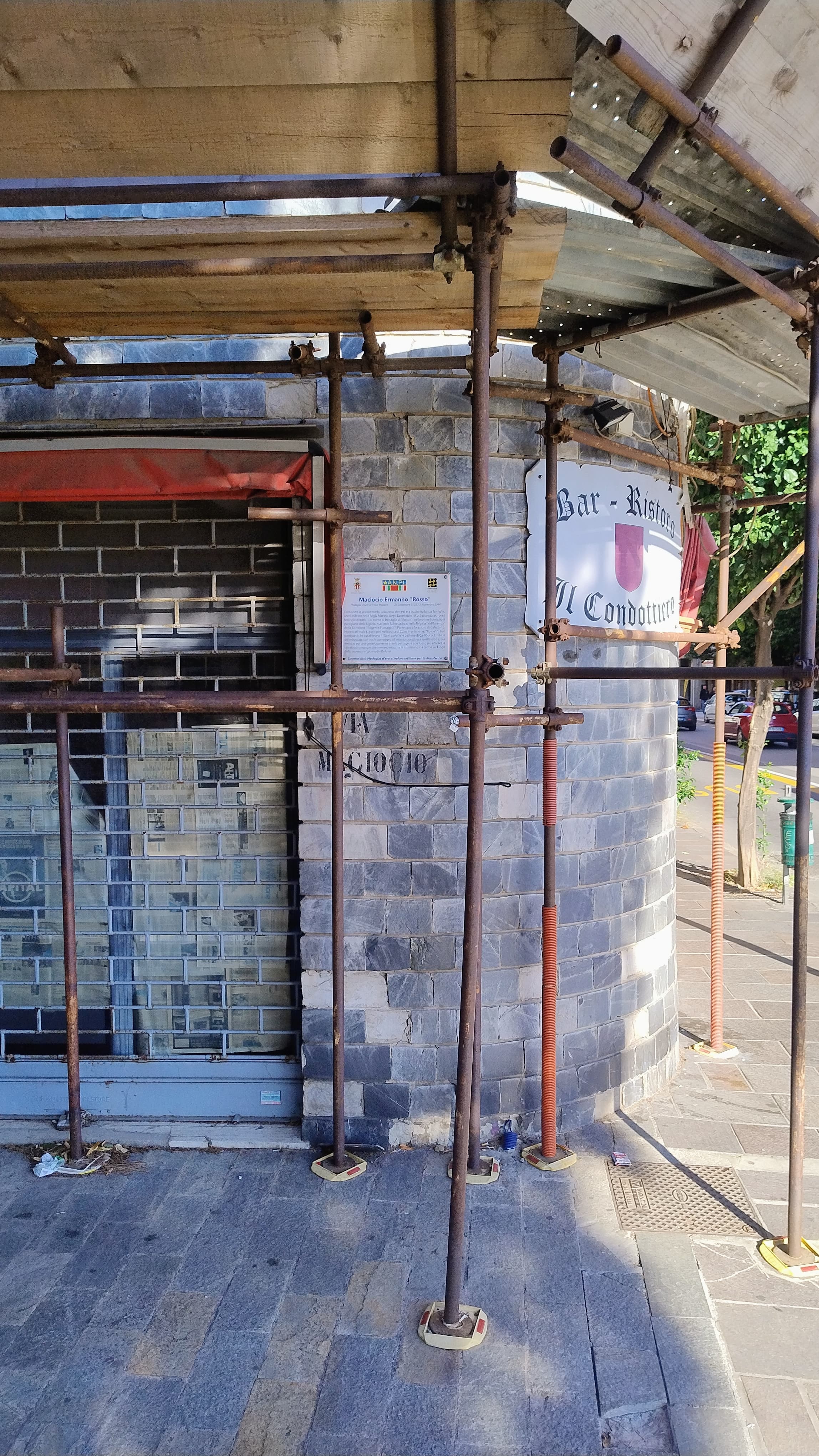 Targa rettangolare in metallo smaltato bianco con bordo tricolore, fissata con quattro viti su muro in pietra grigia. In alto presenta stemmi e loghi a colori; il resto è occupato da testo stampato su più righe. È posta sullo spigolo arrotondato di un edificio.