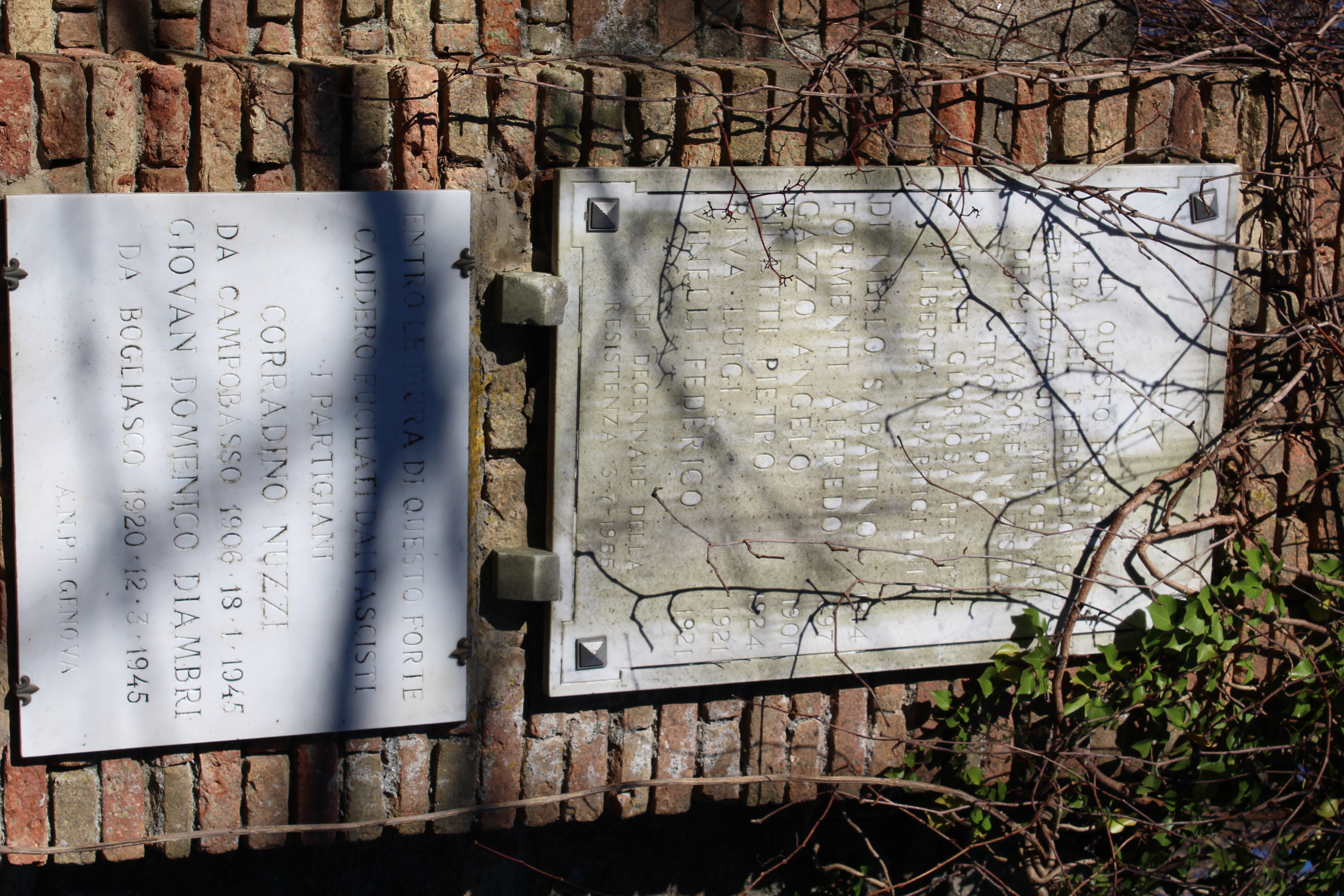 entro le mura di questo forte caddero fucilati dai fascisti i partigiani CORRADINO NUZZI da campobasso 1906 - 18.1.1945 GIOVAN DOMENICO DIAMBRI da bogliasco 1929 - 12.3.1945 anpi genova