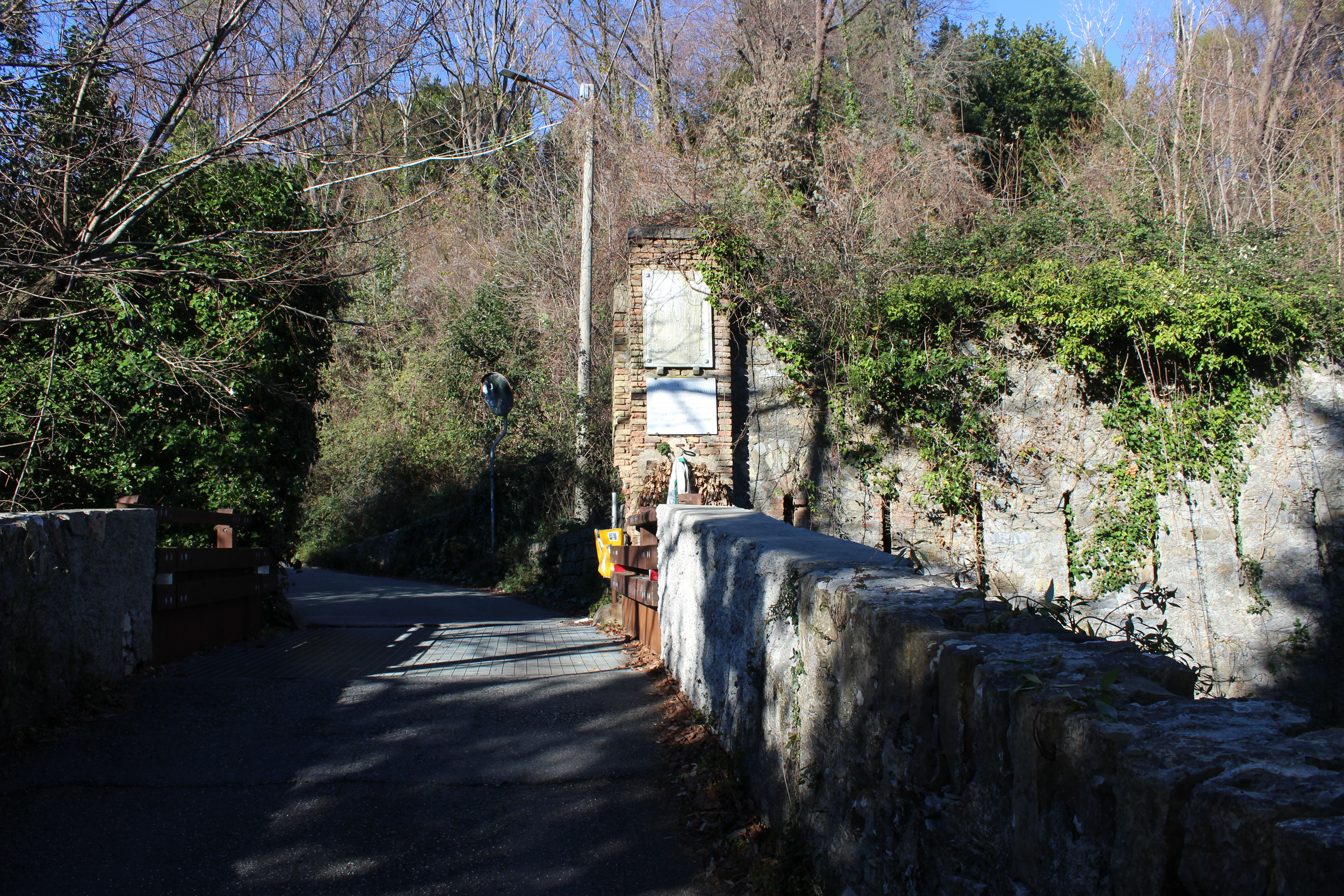 in questo fossato l'alba del 1º febbraio 1945 trucidati da mercenari dell'invasore nazista trovarono morte gloriosamente la libertà i partigiani DI NELLO SABATINO 1914 FORMENTI ALFREDO 1897 GAZZO ANGELO 1901 PINETTI PIETRO 1924 RIVA LUIGI 1921 VINELLI FEDERICO 1921 nel decennale della resistenza 7-3-1955