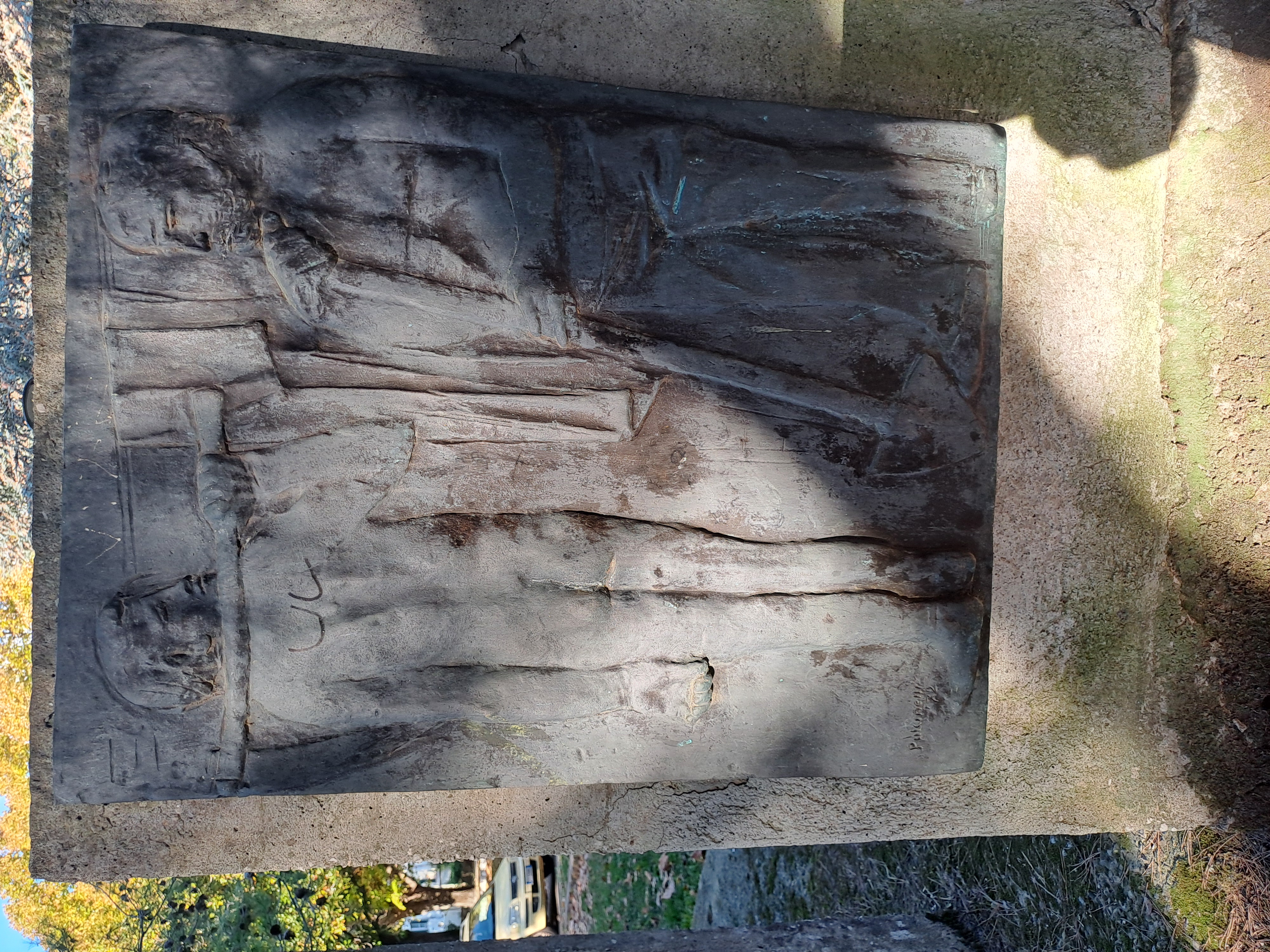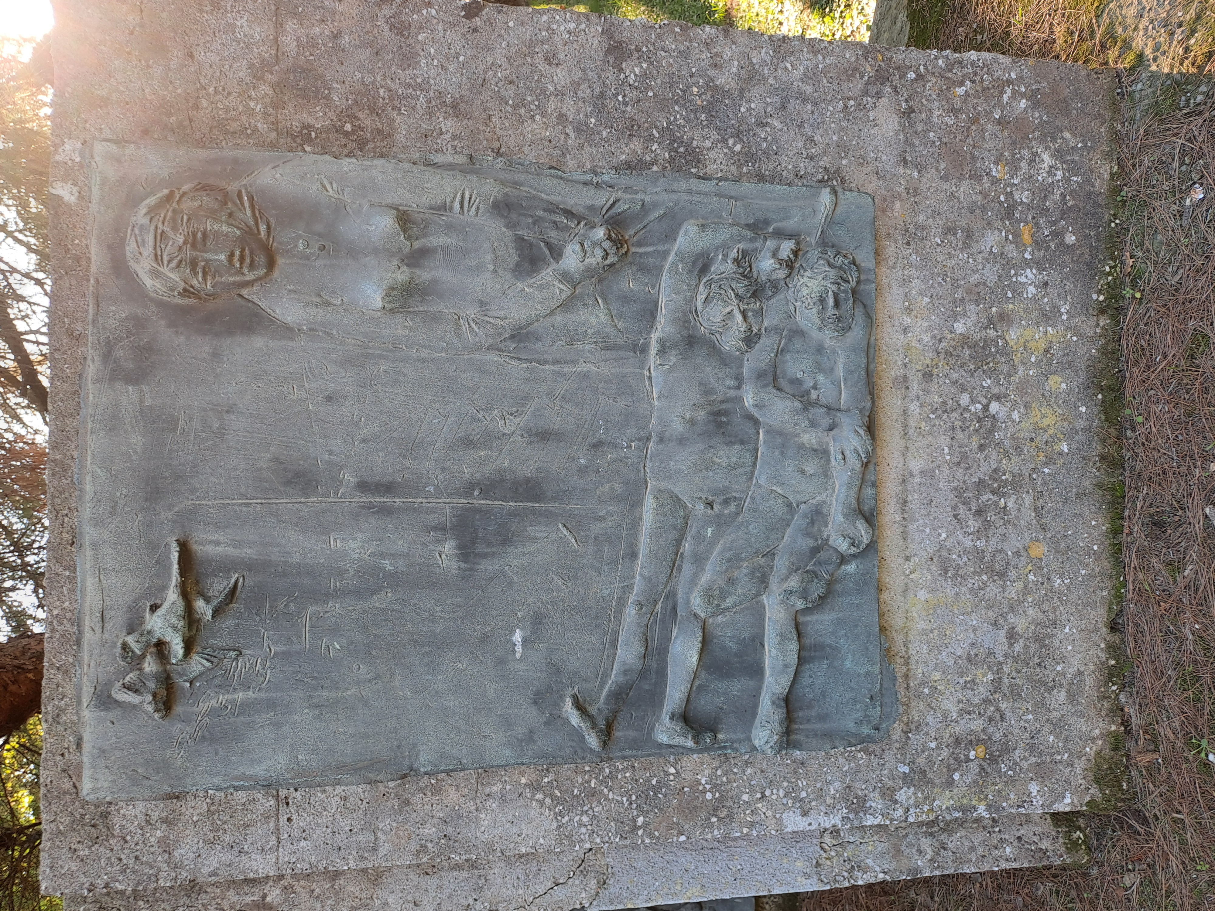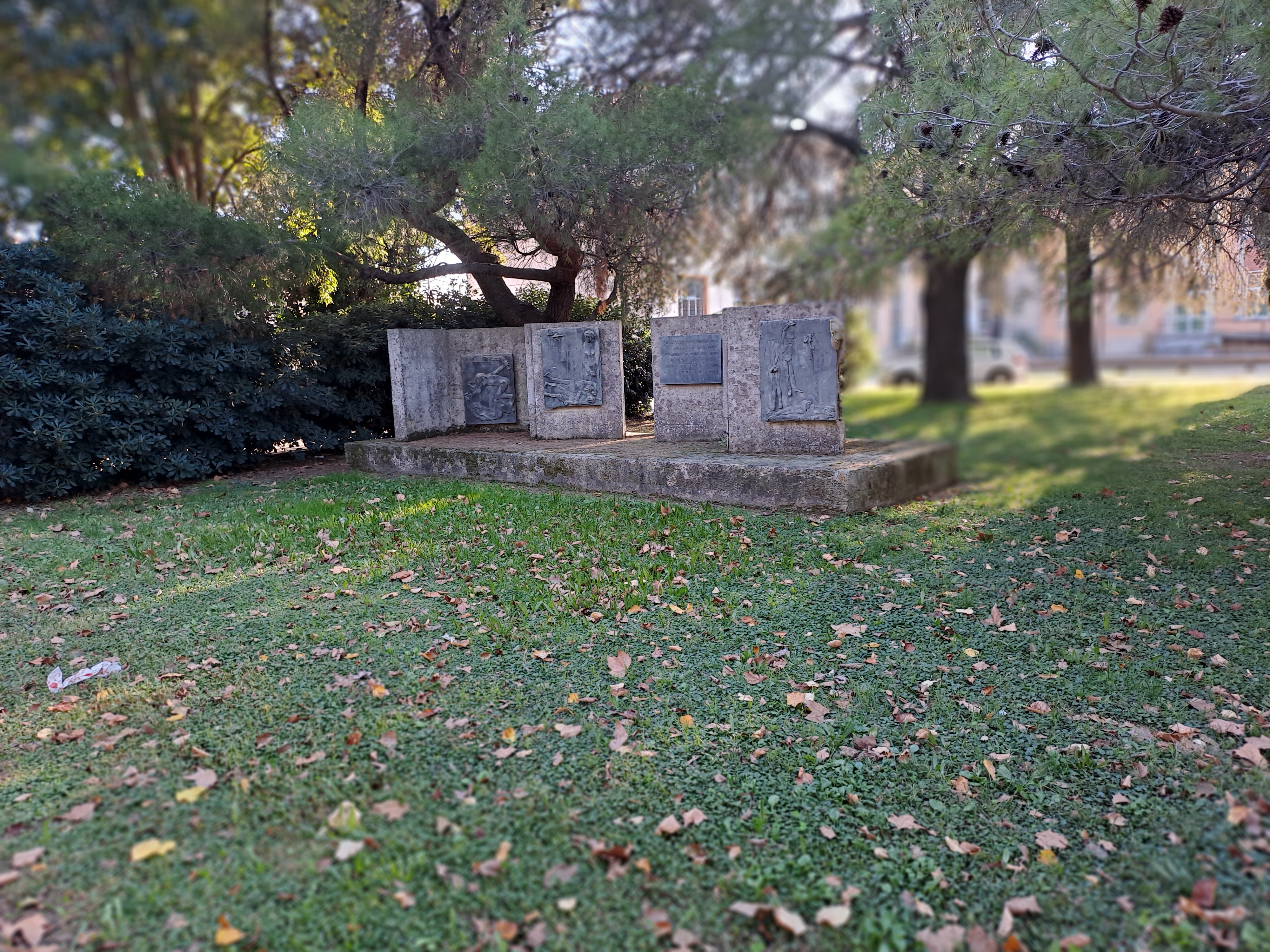Complesso scultoreo su basamento rettangolare in calcestruzzo, con più setti verticali in cemento grezzo, alcuni disposti ad angolo. Su di essi sono fissati pannelli metallici a rilievo con figure umane, patinati in tono scuro, affiancati da targhe con iscrizioni. Le superfici mostrano segni di usura, macchie e abrasioni; alcuni pannelli presentano scritte. L’insieme è collocato su un prato alberato, in uno spazio pubblico.