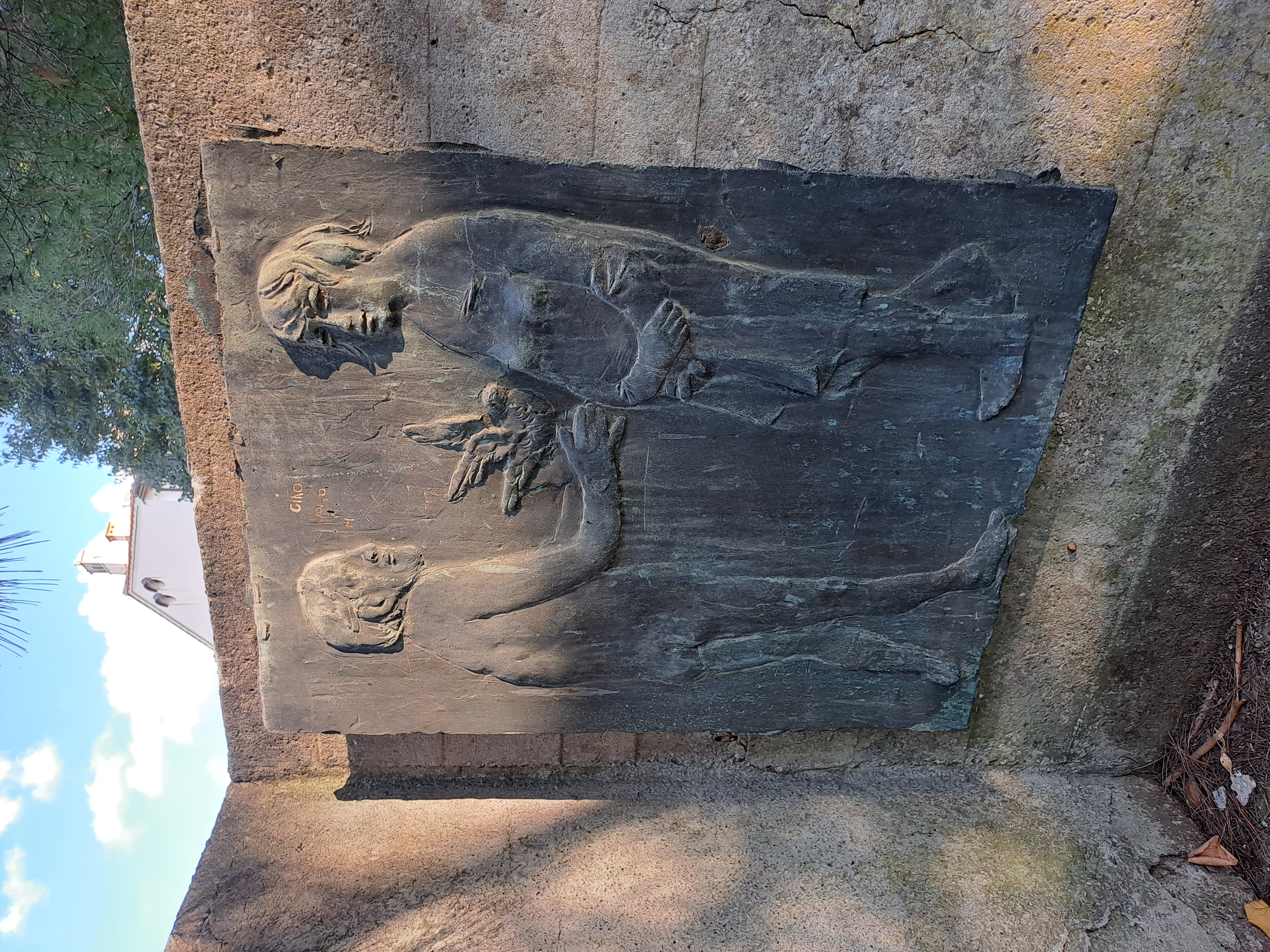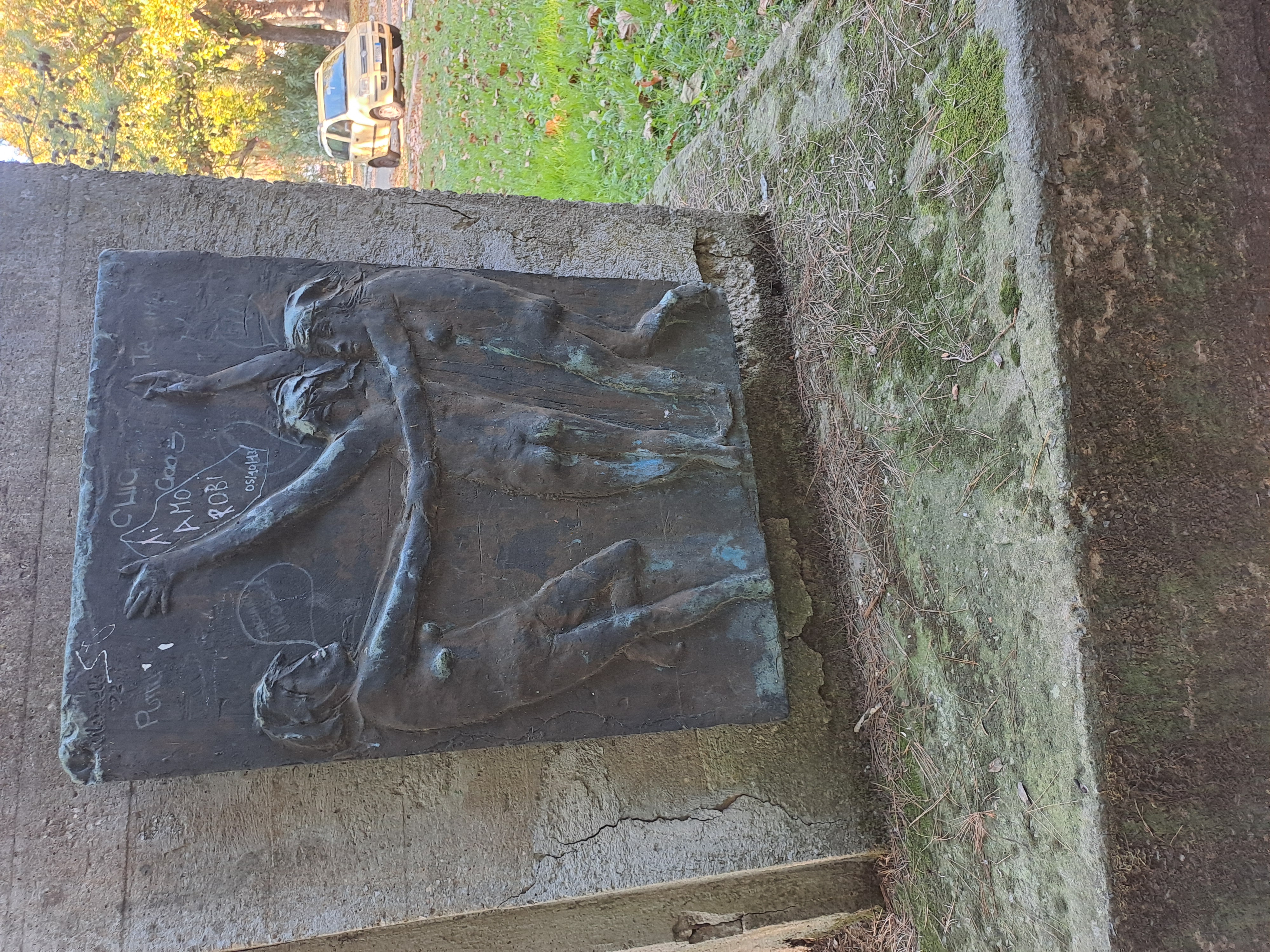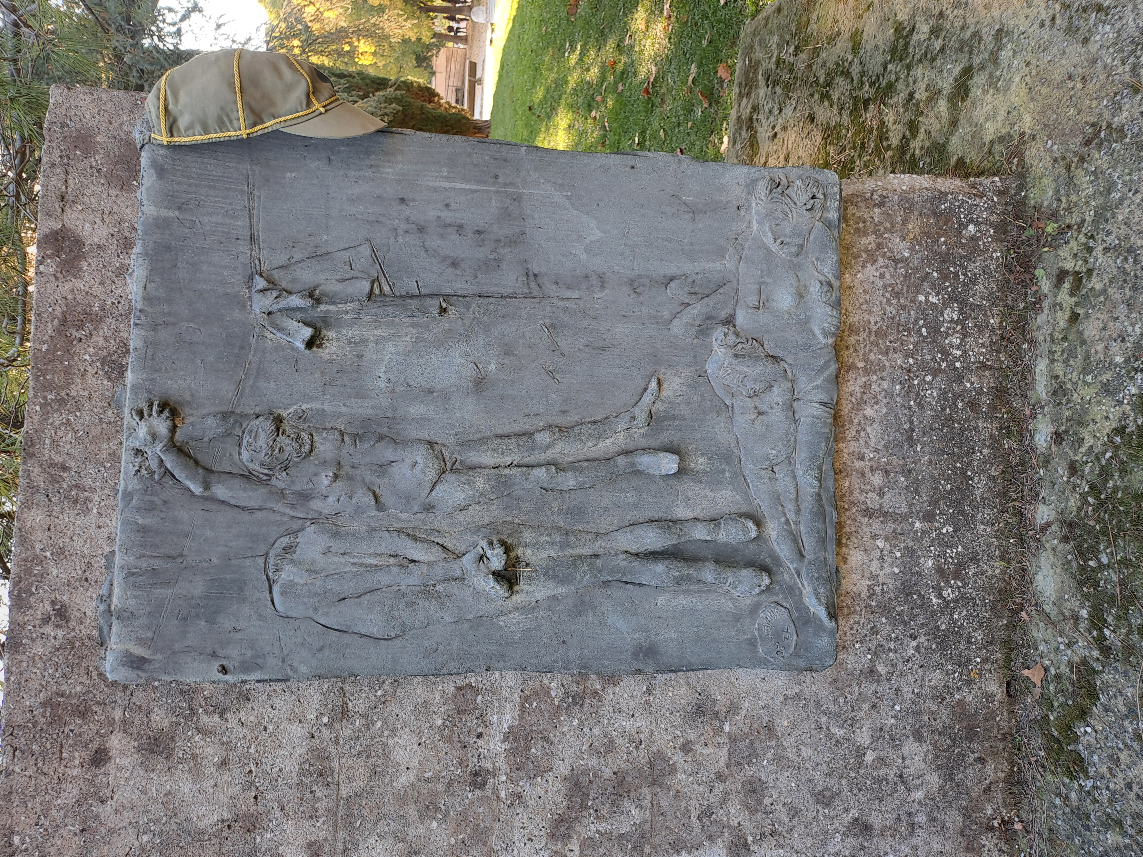 Complesso scultoreo su basamento rettangolare in calcestruzzo, con più setti verticali in cemento grezzo, alcuni disposti ad angolo. Su di essi sono fissati pannelli metallici a rilievo con figure umane, patinati in tono scuro, affiancati da targhe con iscrizioni. Le superfici mostrano segni di usura, macchie e abrasioni; alcuni pannelli presentano scritte. L’insieme è collocato su un prato alberato, in uno spazio pubblico.