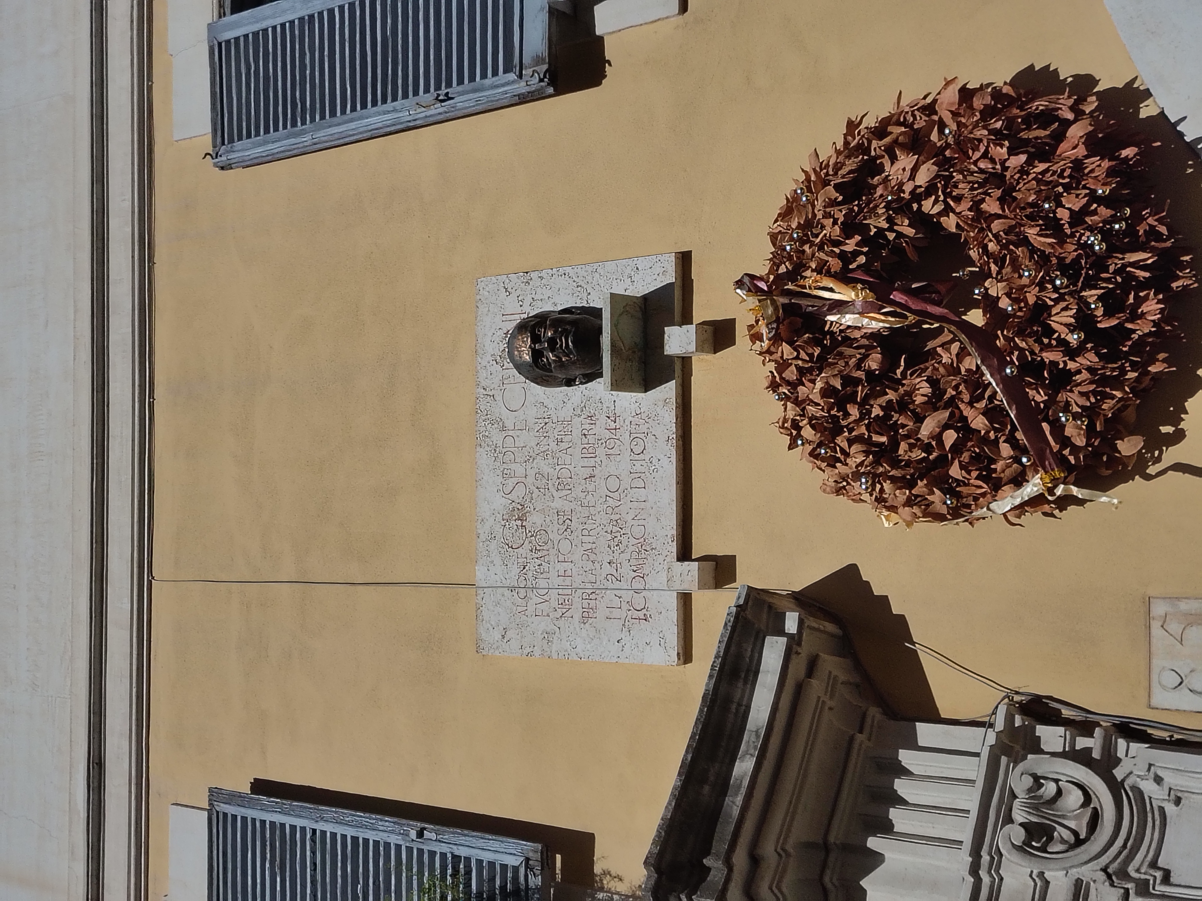 Una lapide rettangolare in pietra chiara con iscrizione incisa è fissata a una facciata intonacata color ocra. Sopra la lapide, su una mensolina aggettante, è collocato un busto in metallo scuro