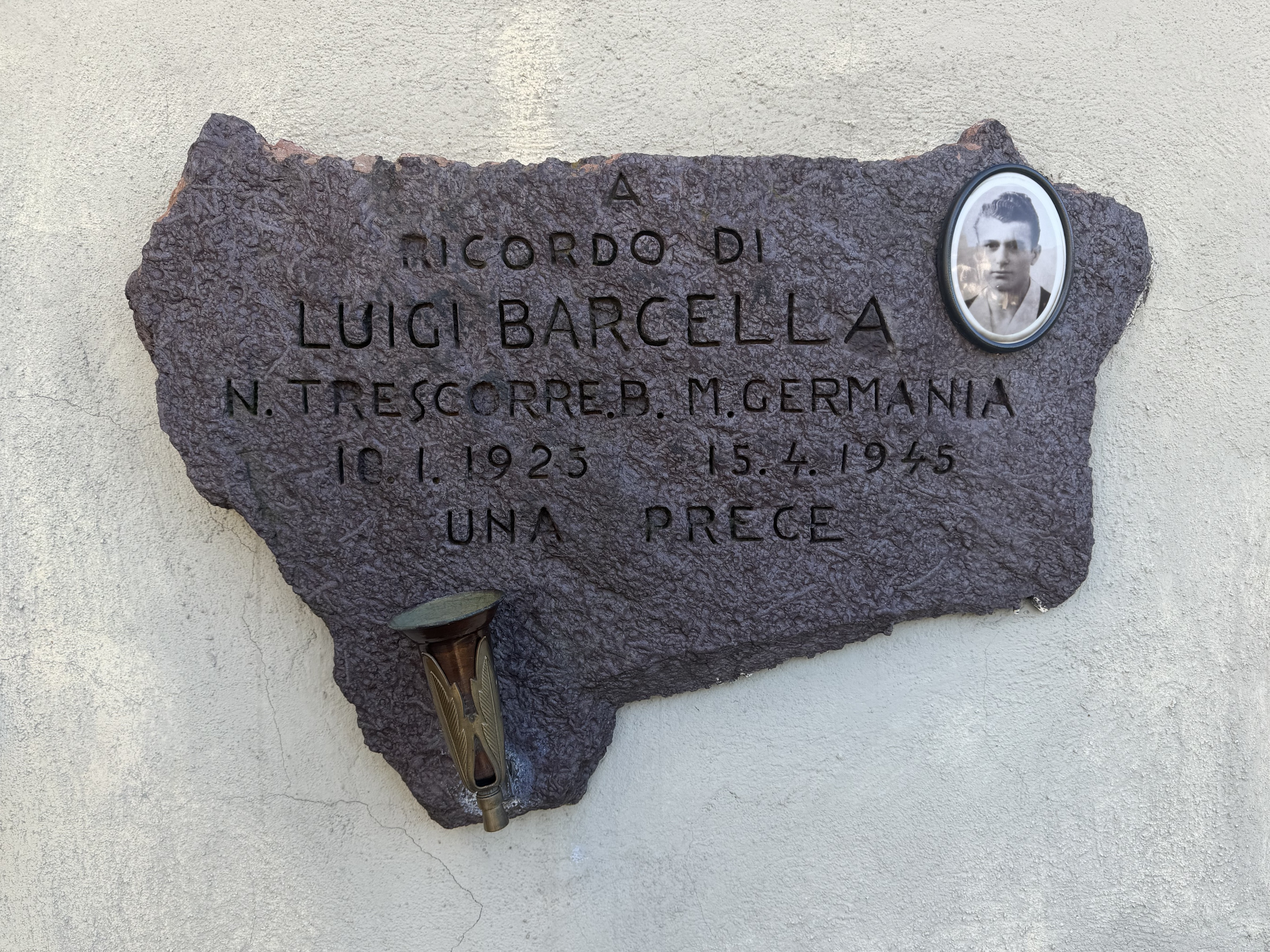 Lastra commemorativa in pietra scura, irregolare e ruvida, fissata a una parete. Presenta iscrizioni e un piccolo portacero metallico in basso a sinistra e, a destra, un medaglione ovale con ritratto fotografico in bianco e nero.