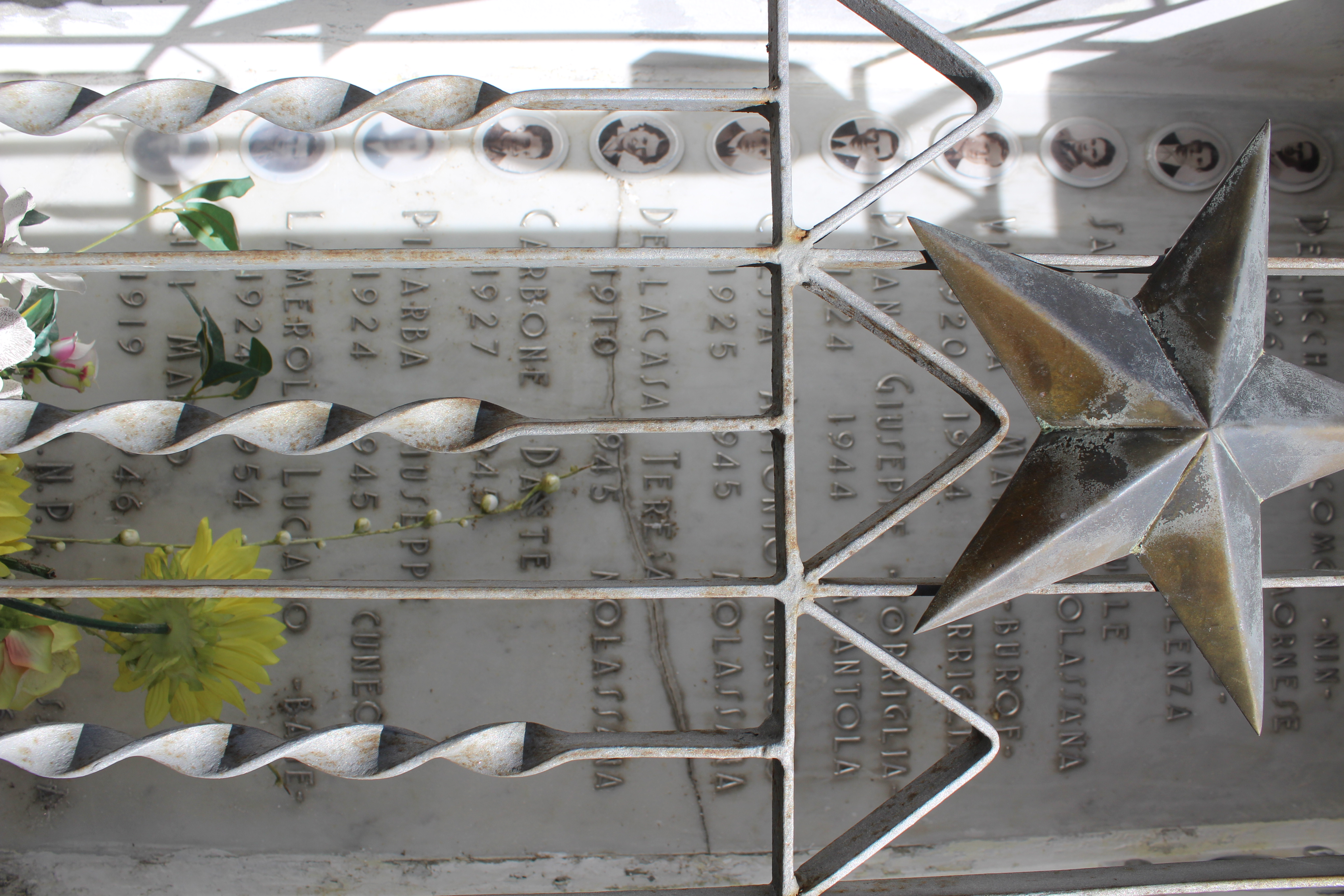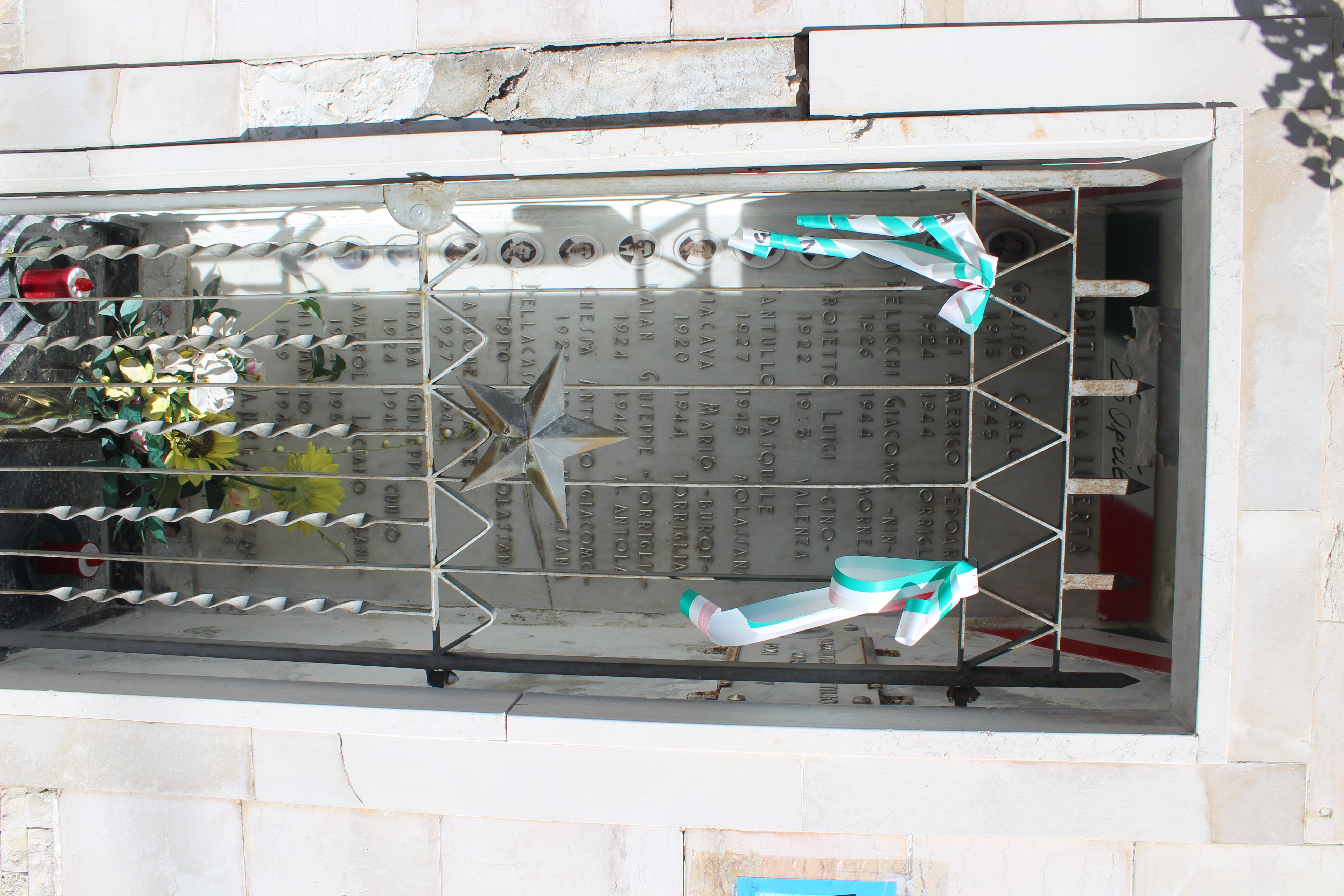 Piccola edicola memoriale incassata in un muro, con facciata in pietra chiara e coronamento a timpano. L’accesso è chiuso da un cancello metallico decorato da una stella centrale, barre ritorte e nastri tricolori. All’interno si vede una lastra in marmo con iscrizioni incise e piccoli ritratti. Ai lati del vano ci sono due stelle metalliche e vaschette porta-fiori. Si trova all’aperto, lungo una strada, delimitata da una catena e un piccolo parapetto.