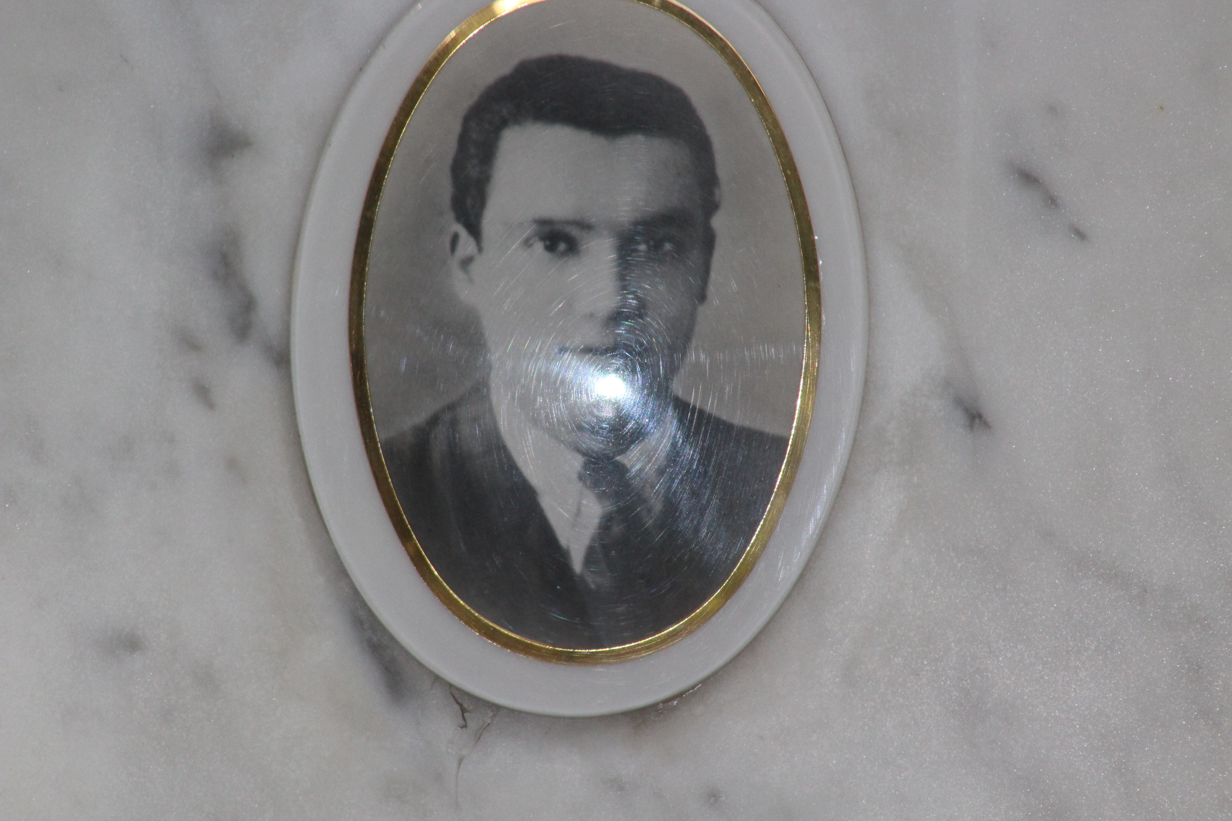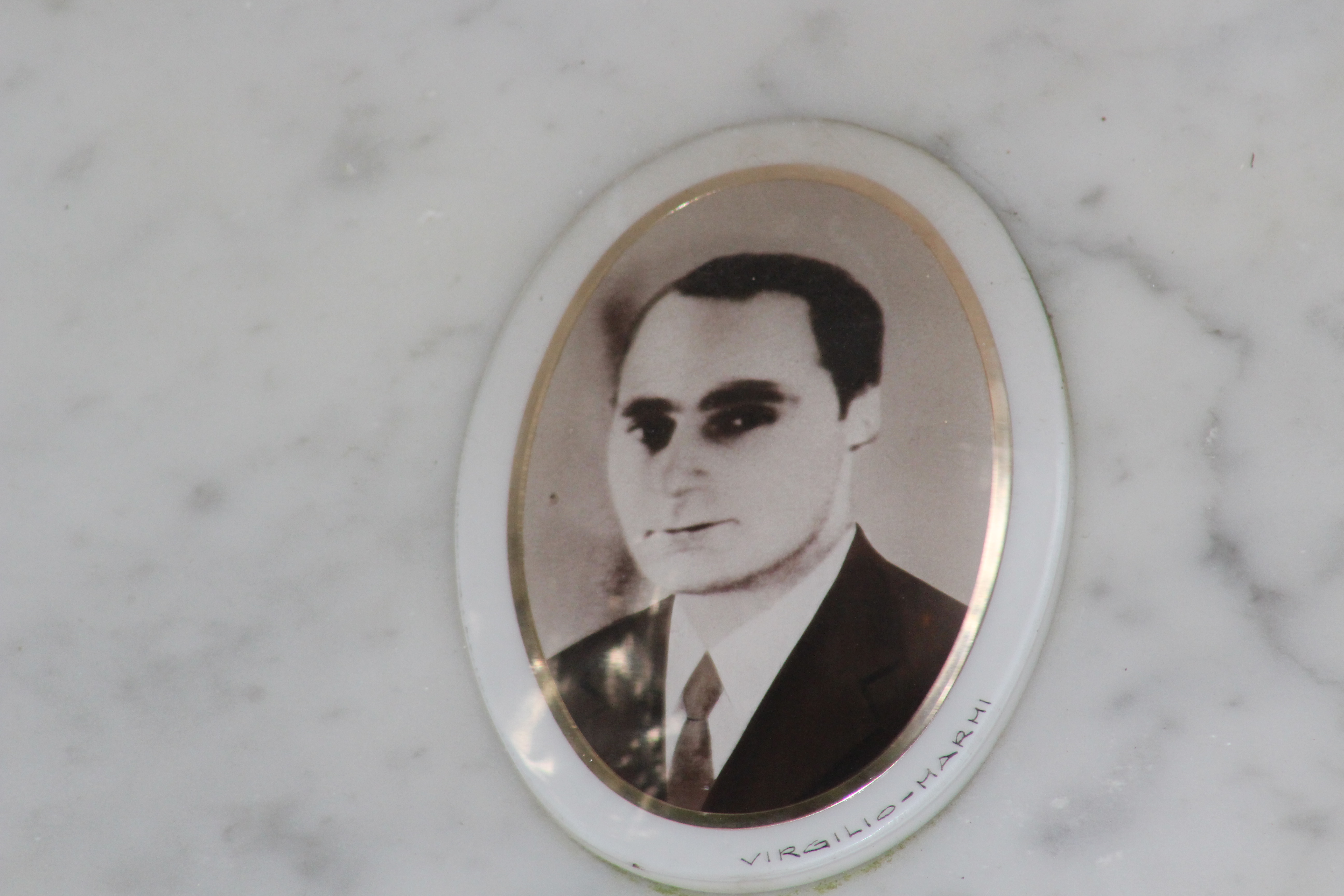 Struttura commemorativa a portico in pietra e cemento, di colore grigio, con trabeazione orizzontale e pilastri squadrati che incorniciano una parete di nicchie rivestite da lastre marmoree chiare. Sulla trabeazione corre un’iscrizione in rilievo. Al centro, su un basamento, una piccola statua in bronzo. Le lapidi presentano testi incisi e piccoli ritratti ovali. Collocato in ambito cimiteriale tra alberi alti.