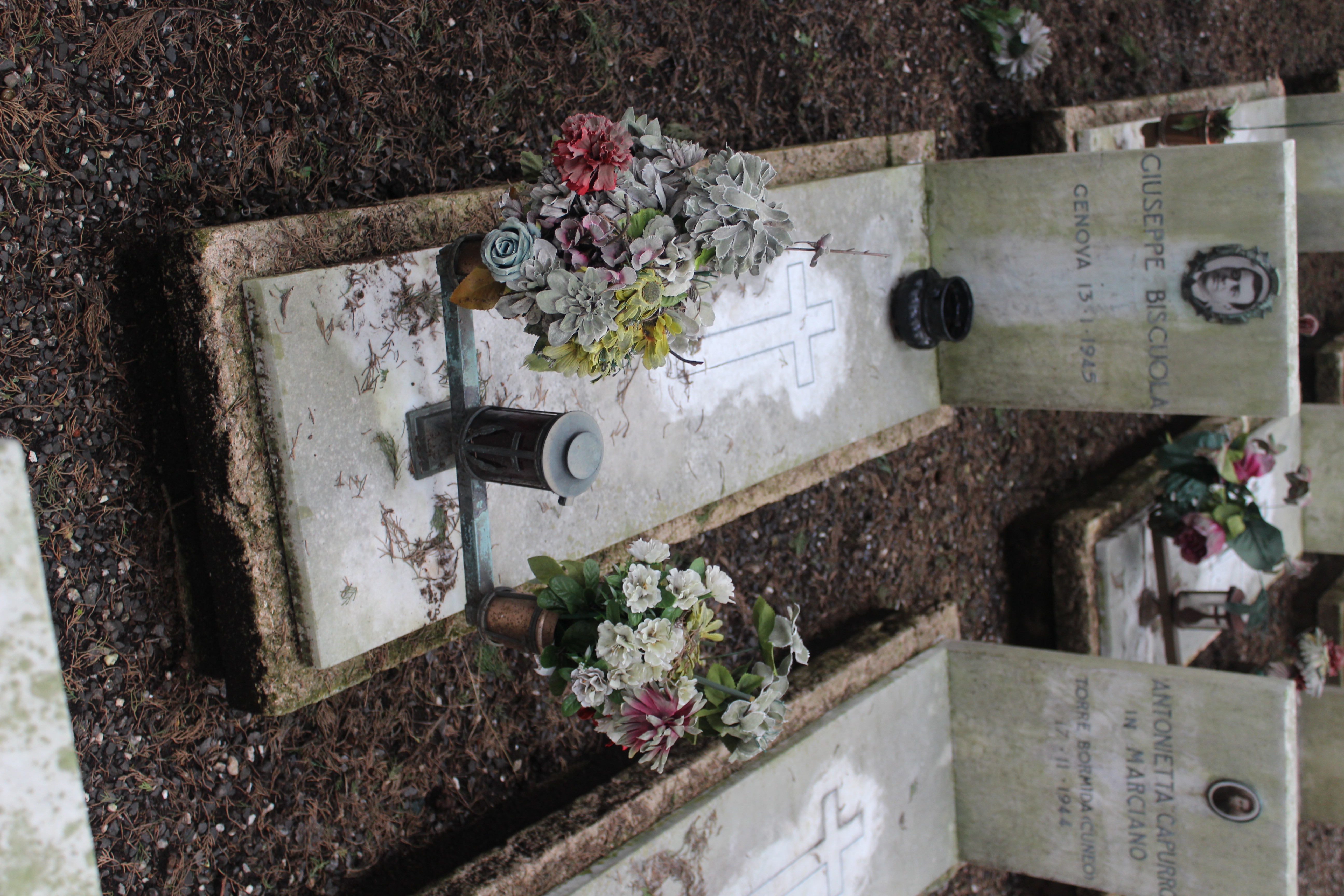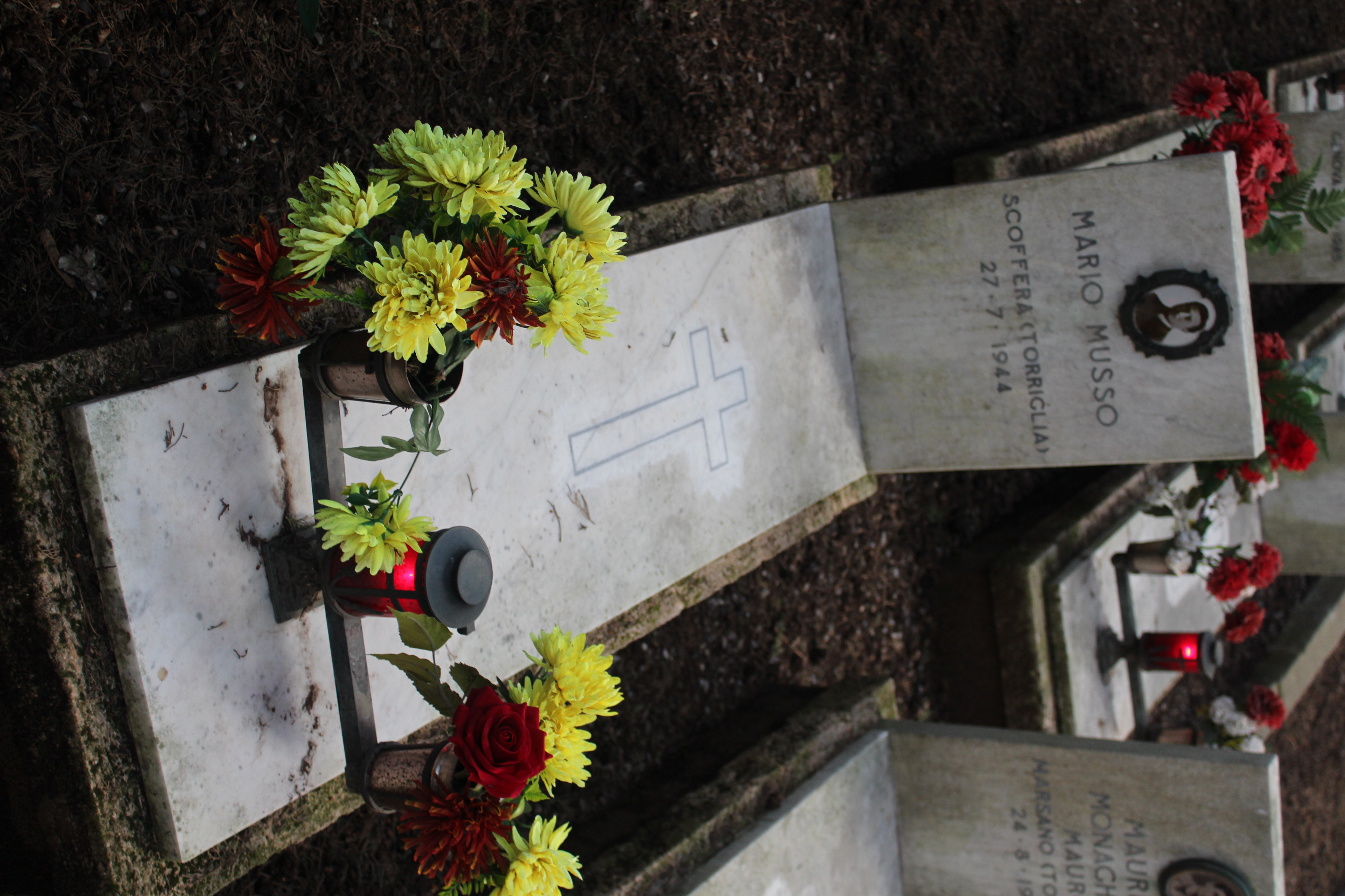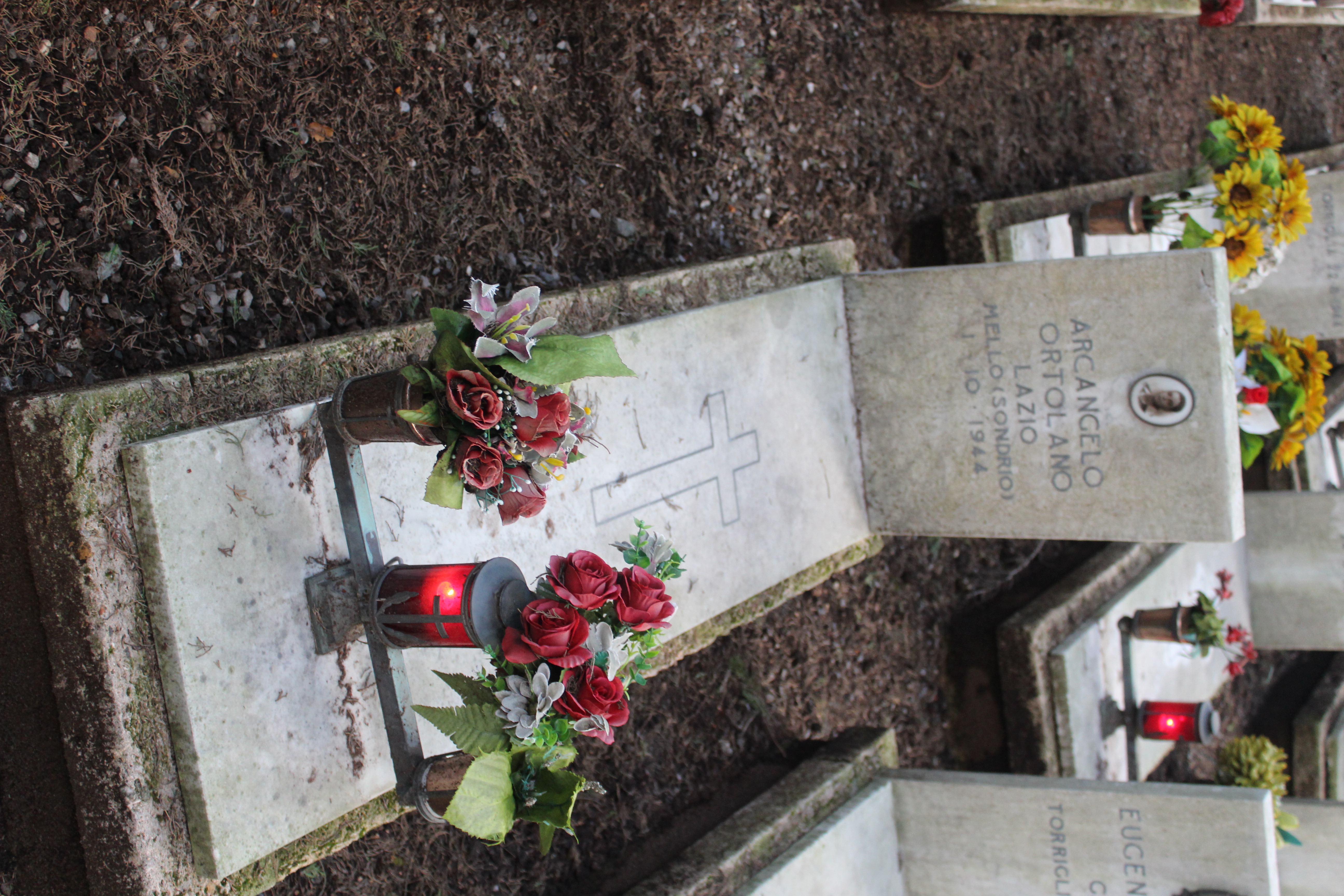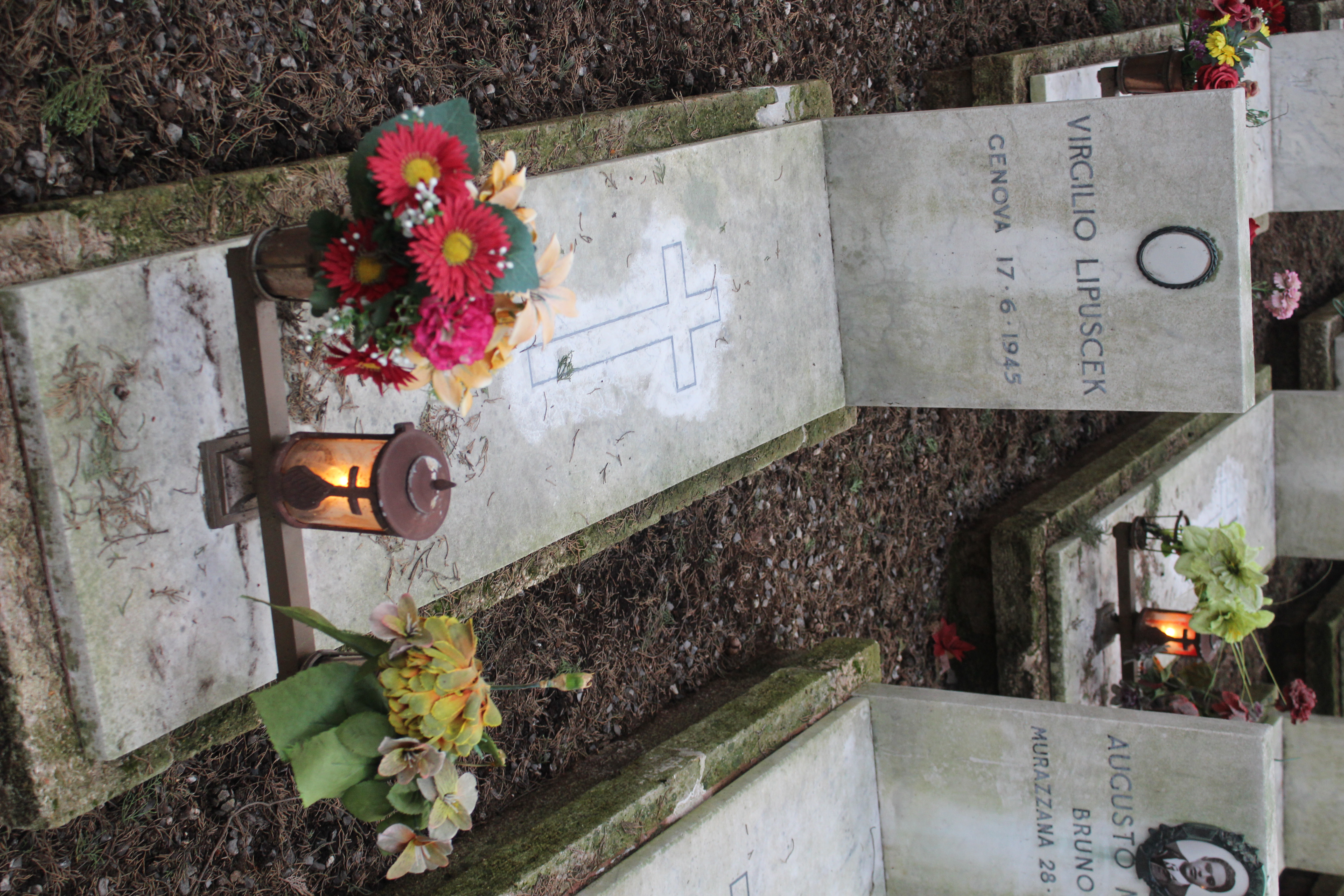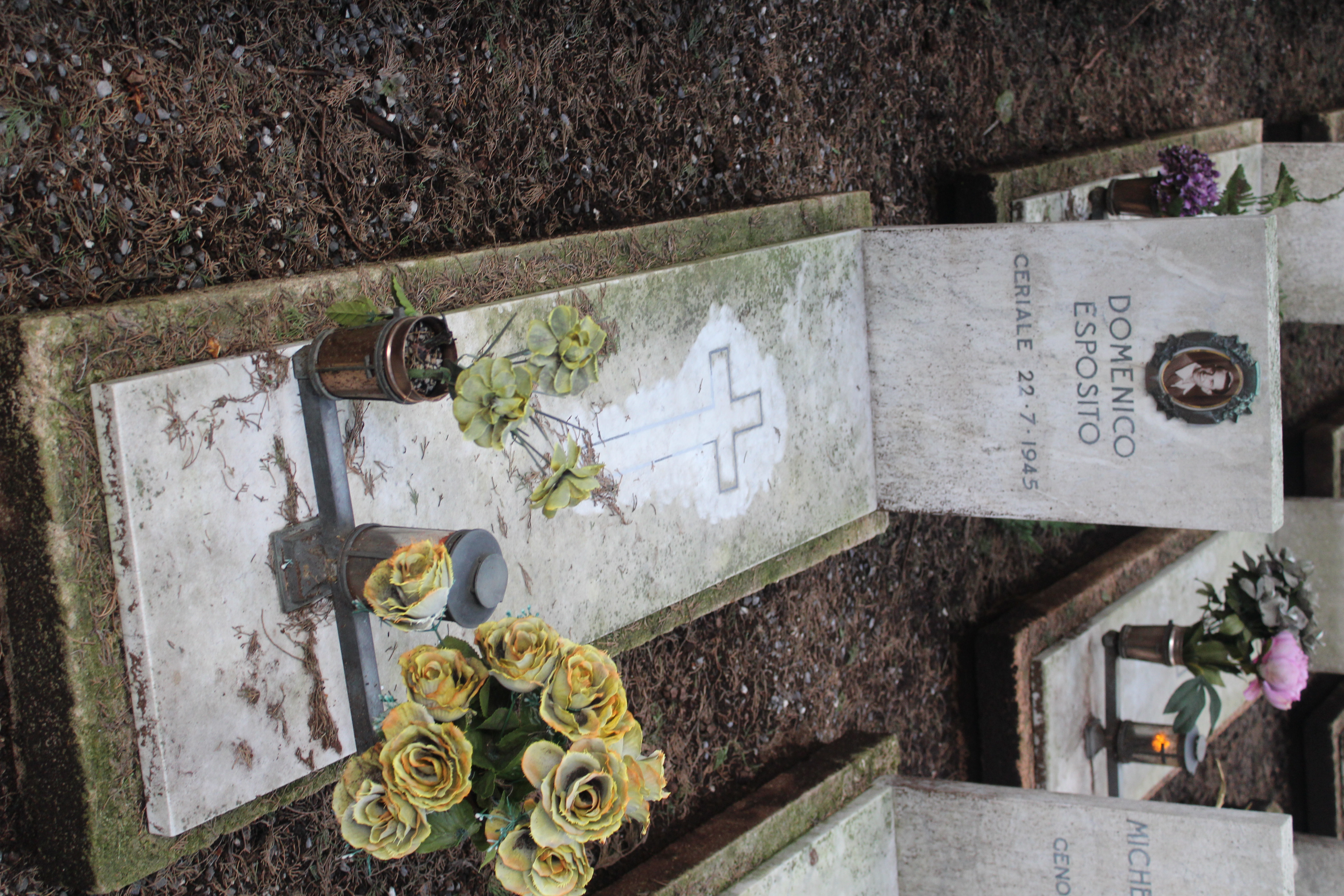 Complesso sepolcrale allineato in fitte file di lapidi e lastre rettangolari in pietra chiara, patinate dal tempo. Ogni sepoltura presenta una stele verticale con medaglione e iscrizioni. Tra gli alberi ad alto fusto spicca una targa commemorativa su supporto.