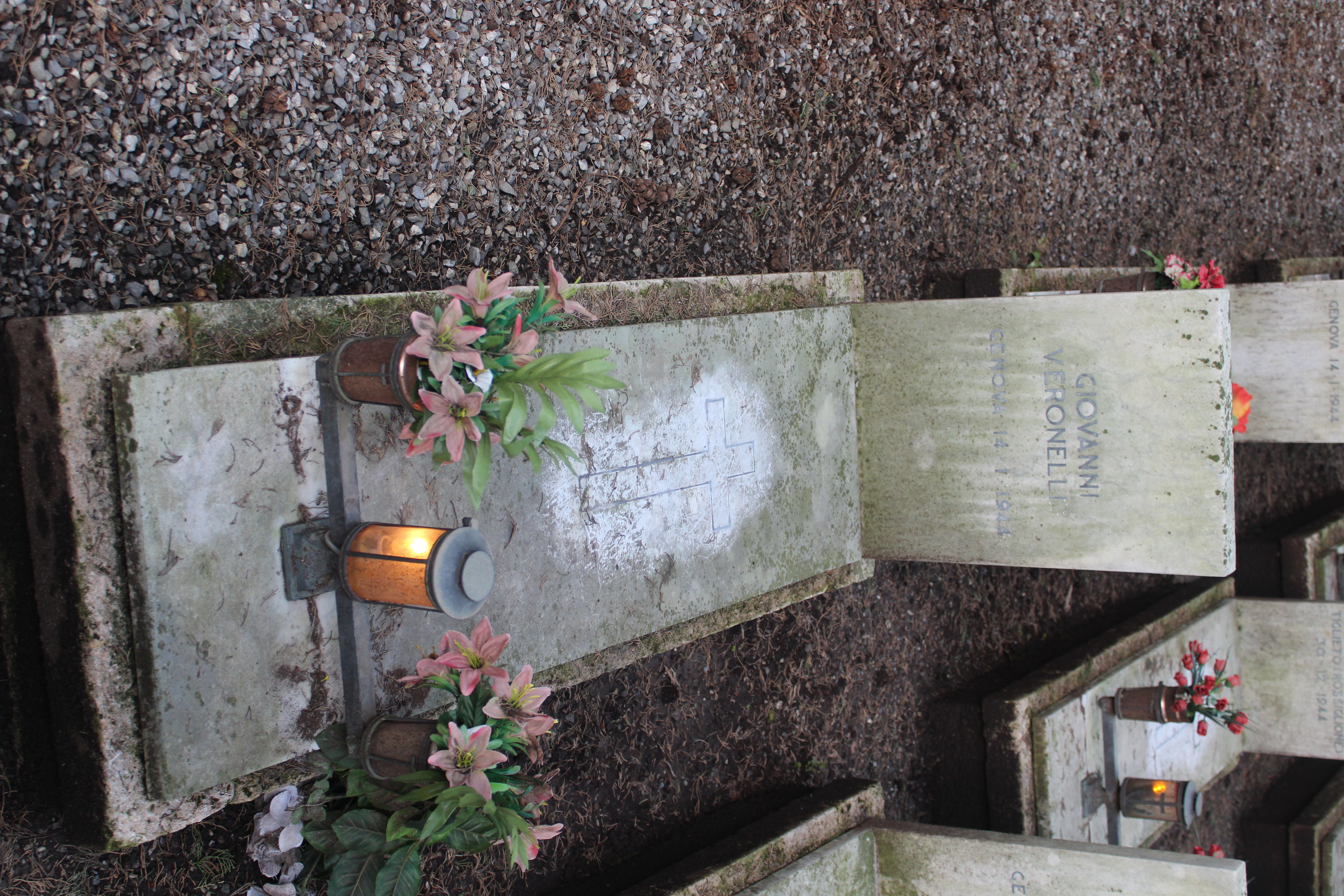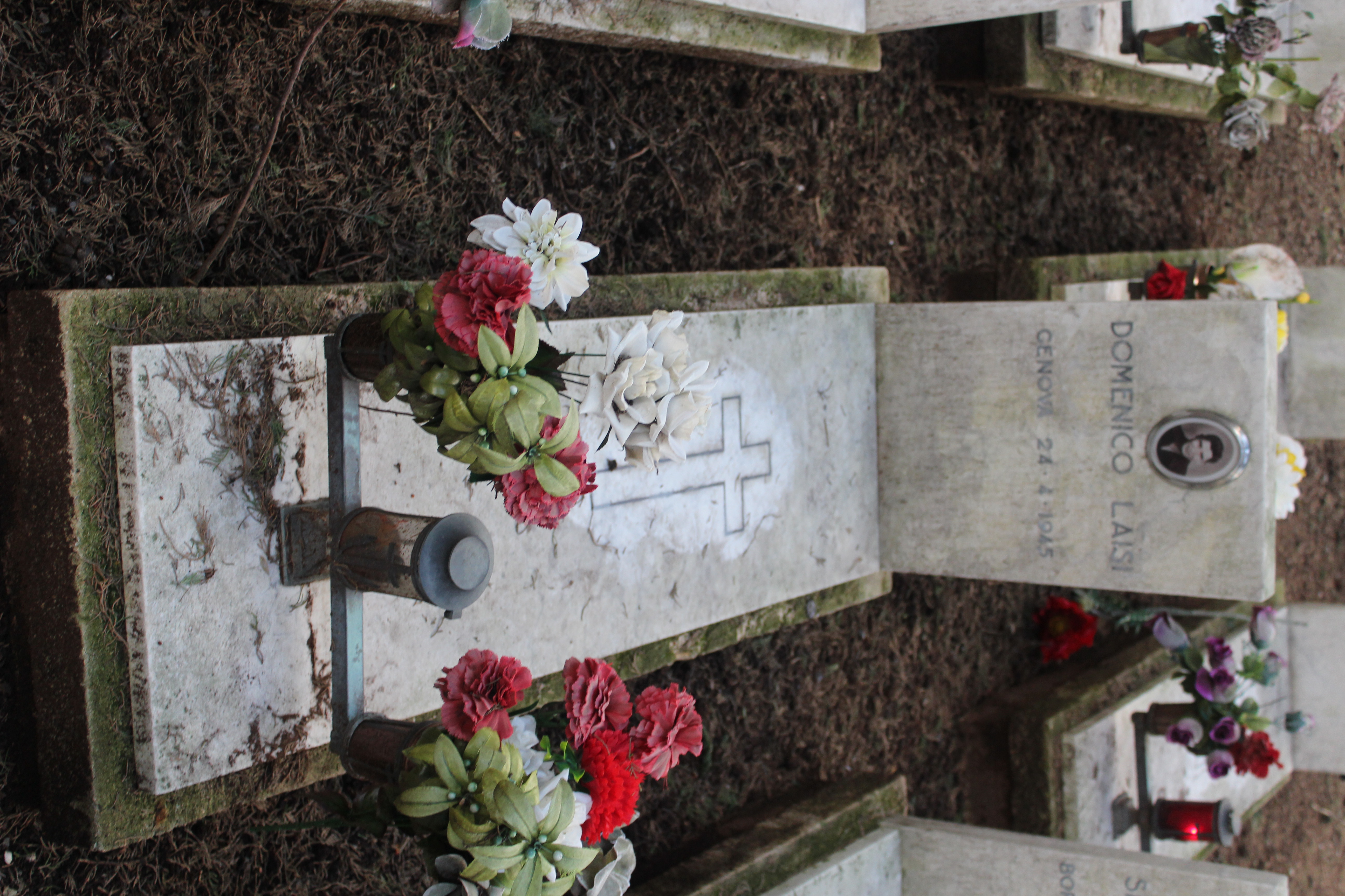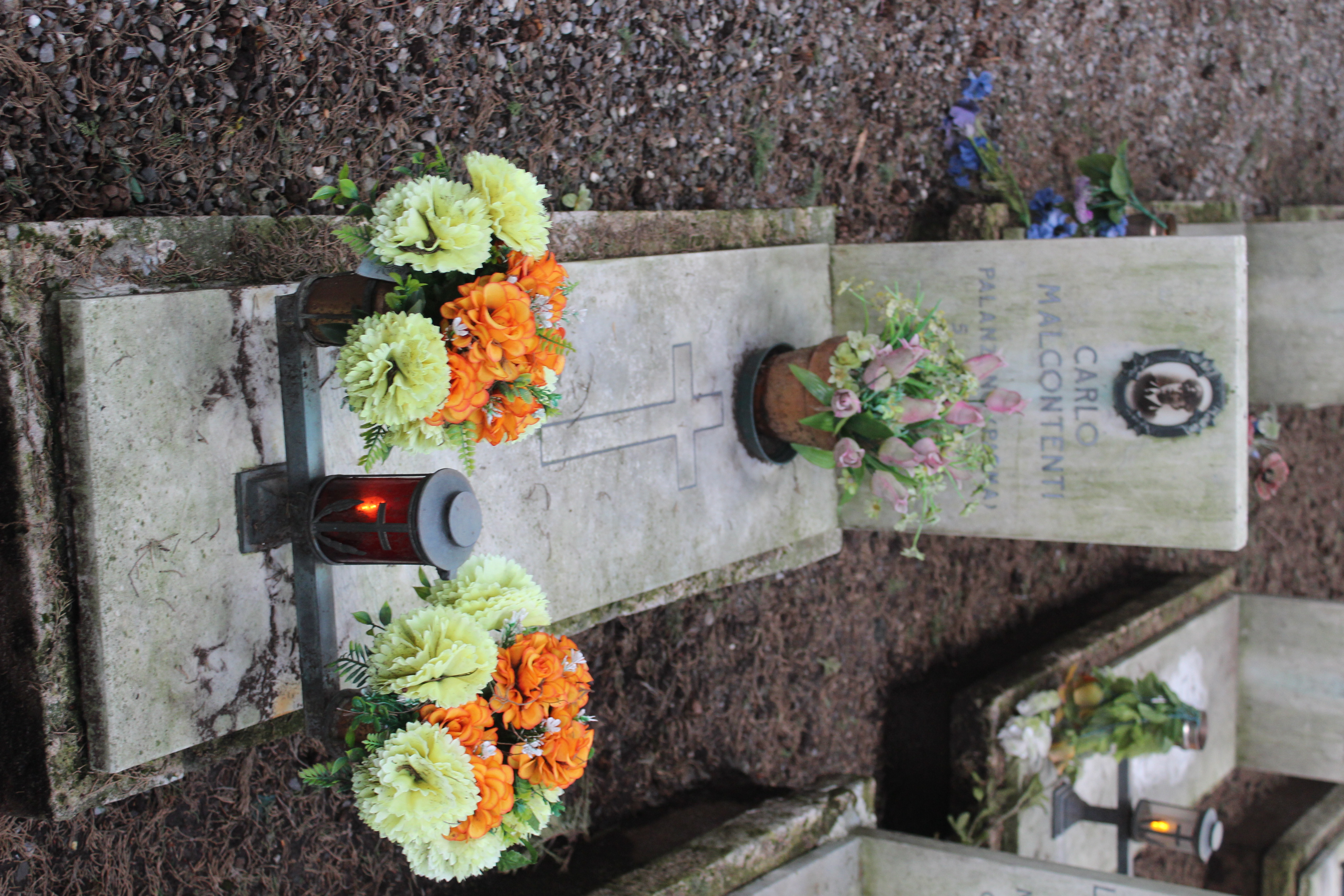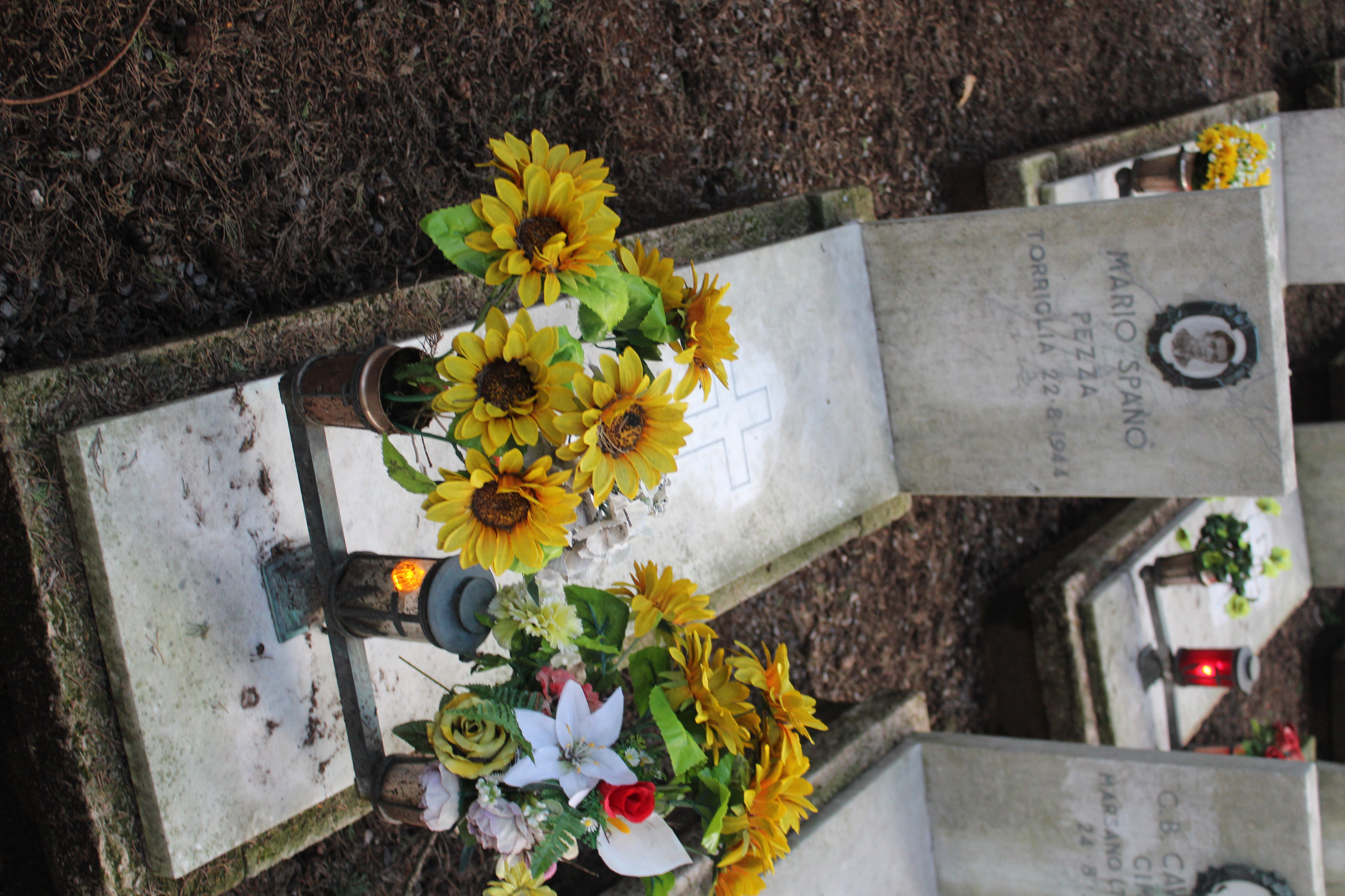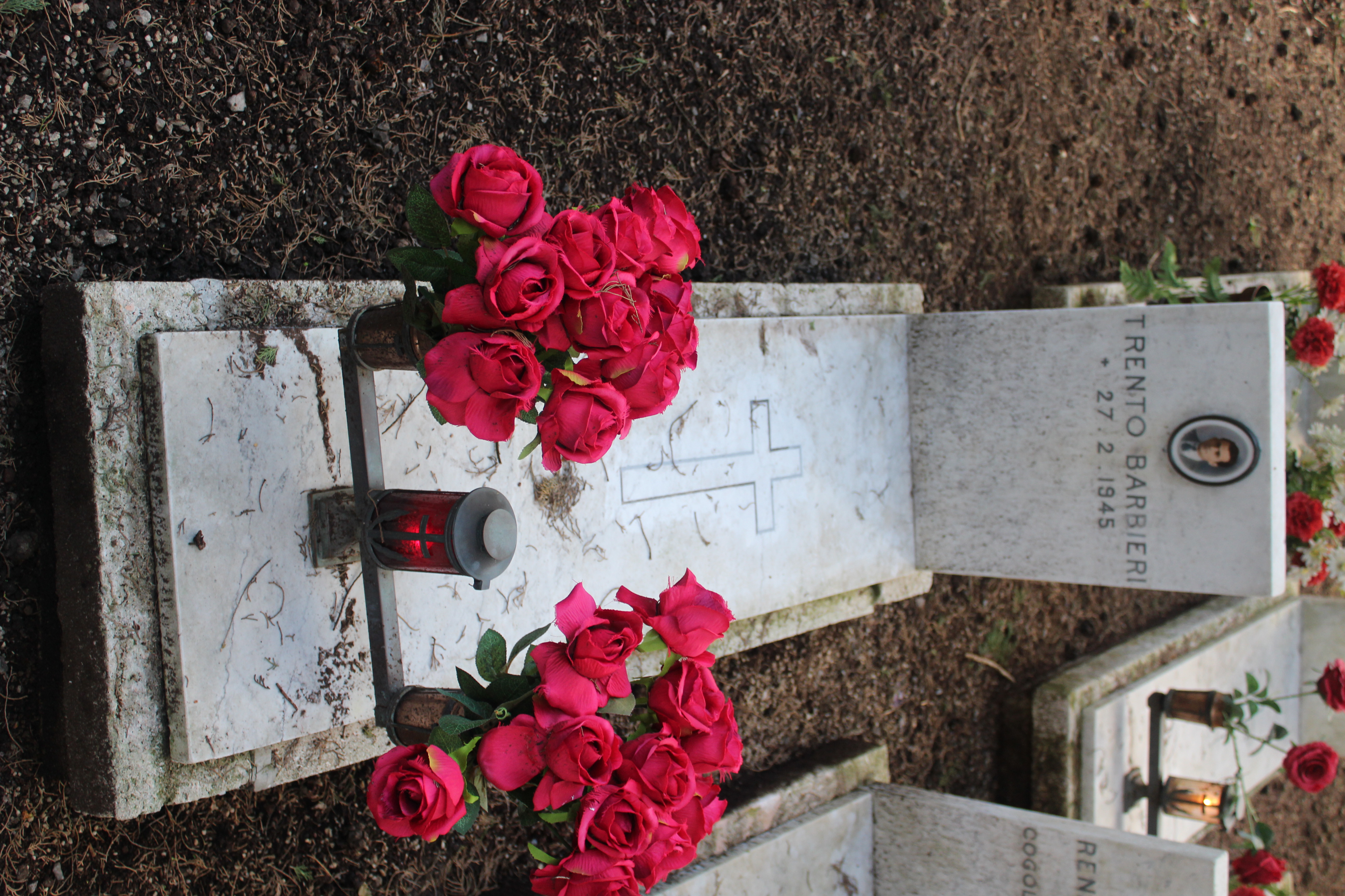 Complesso sepolcrale allineato in fitte file di lapidi e lastre rettangolari in pietra chiara, patinate dal tempo. Ogni sepoltura presenta una stele verticale con medaglione e iscrizioni. Tra gli alberi ad alto fusto spicca una targa commemorativa su supporto.