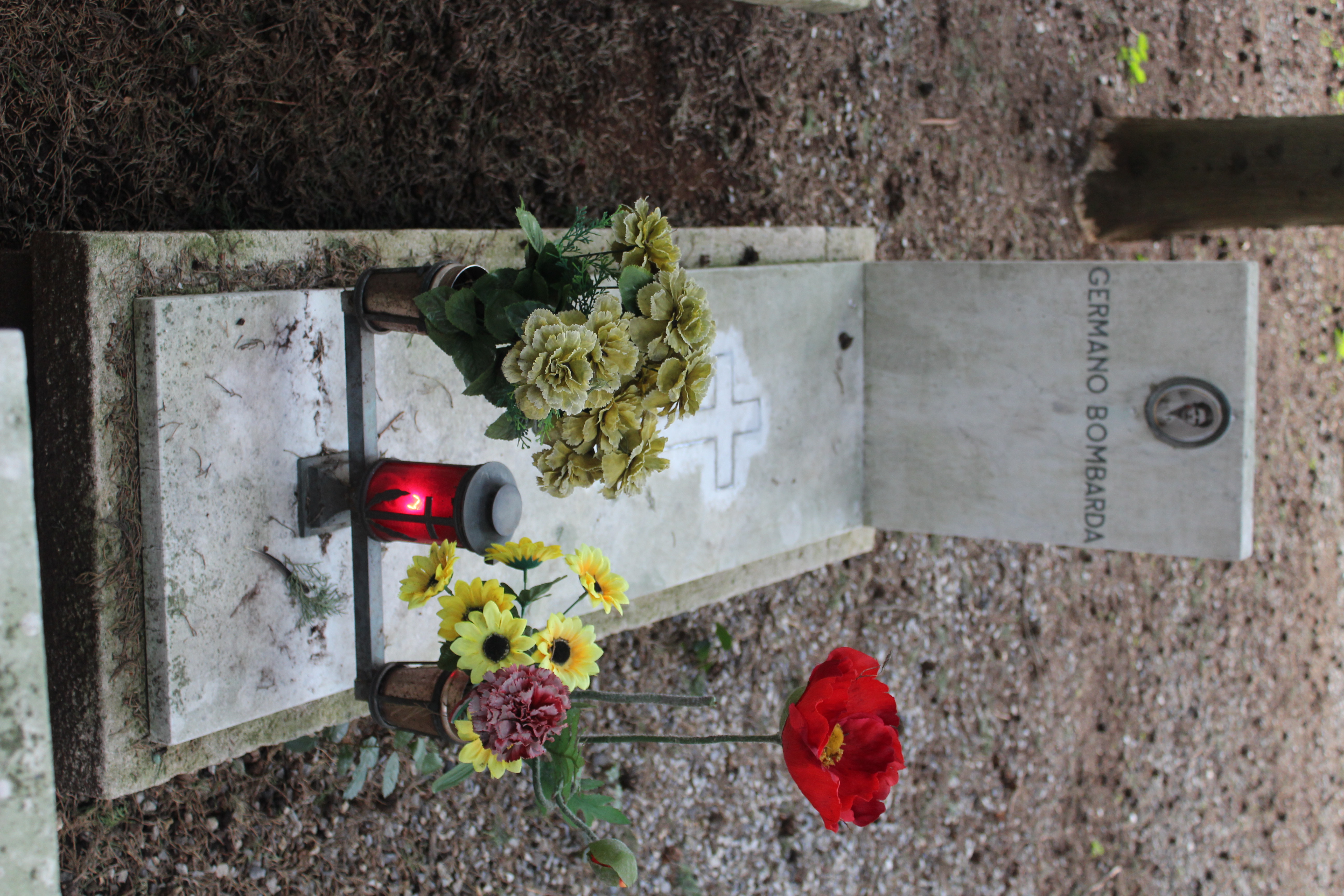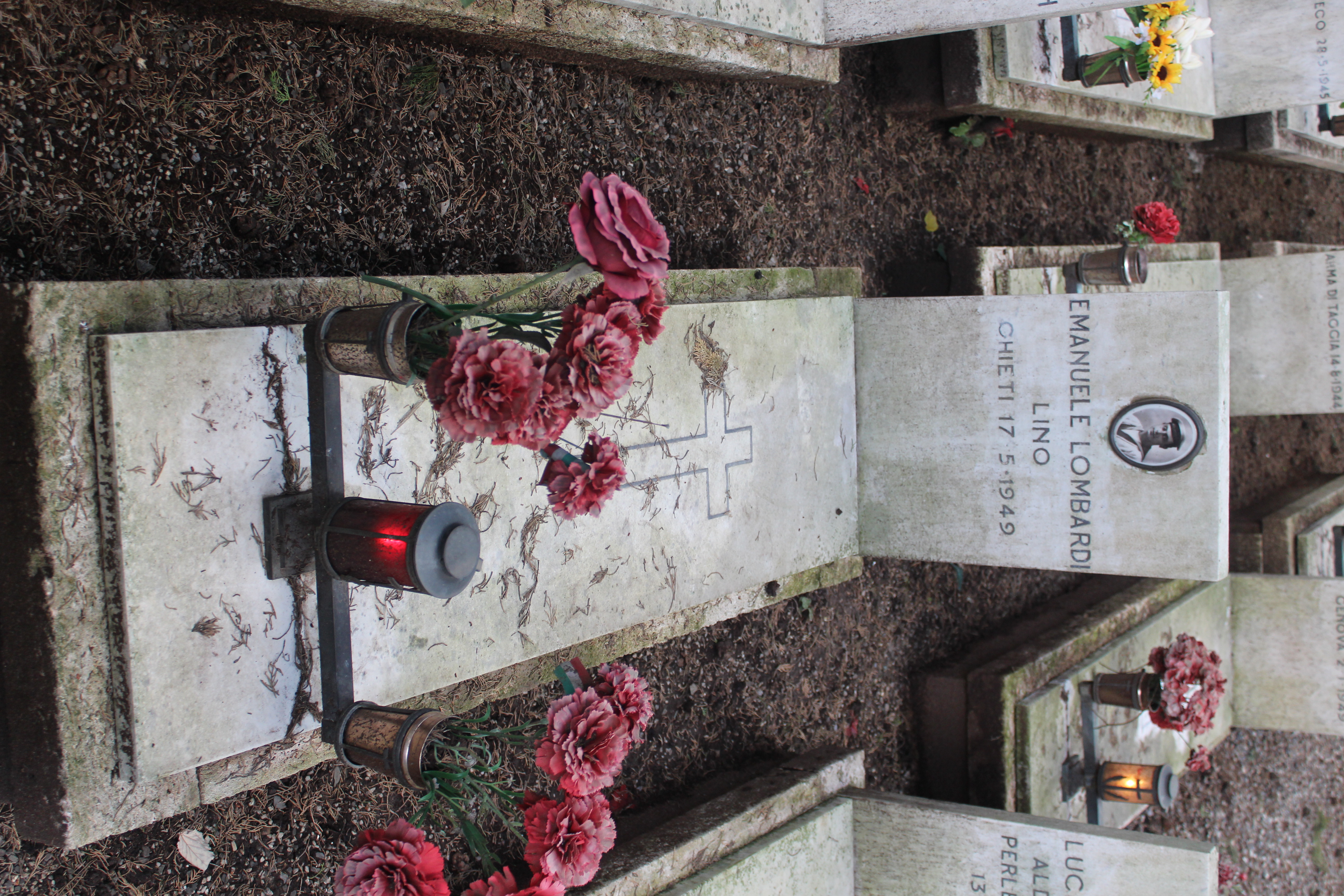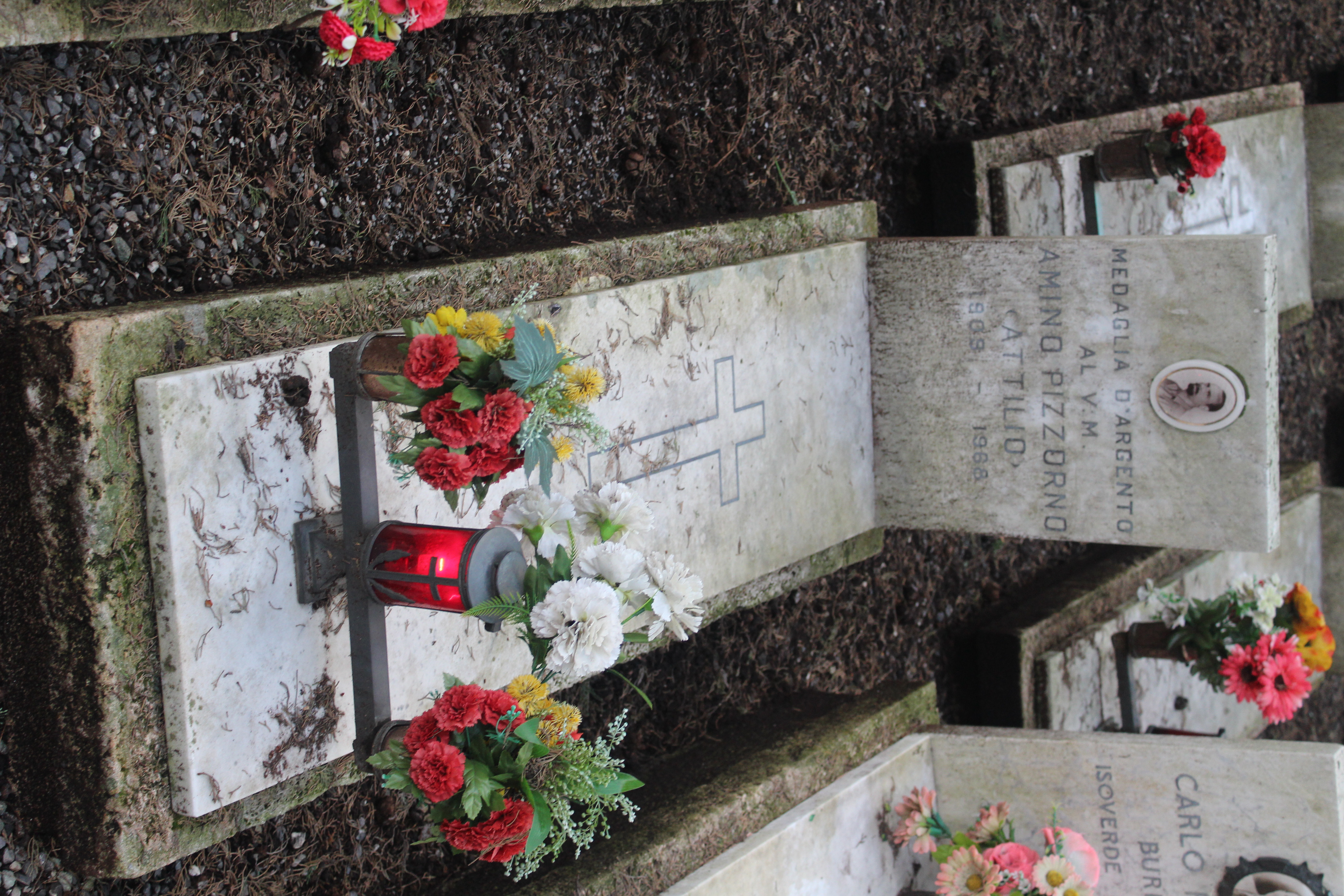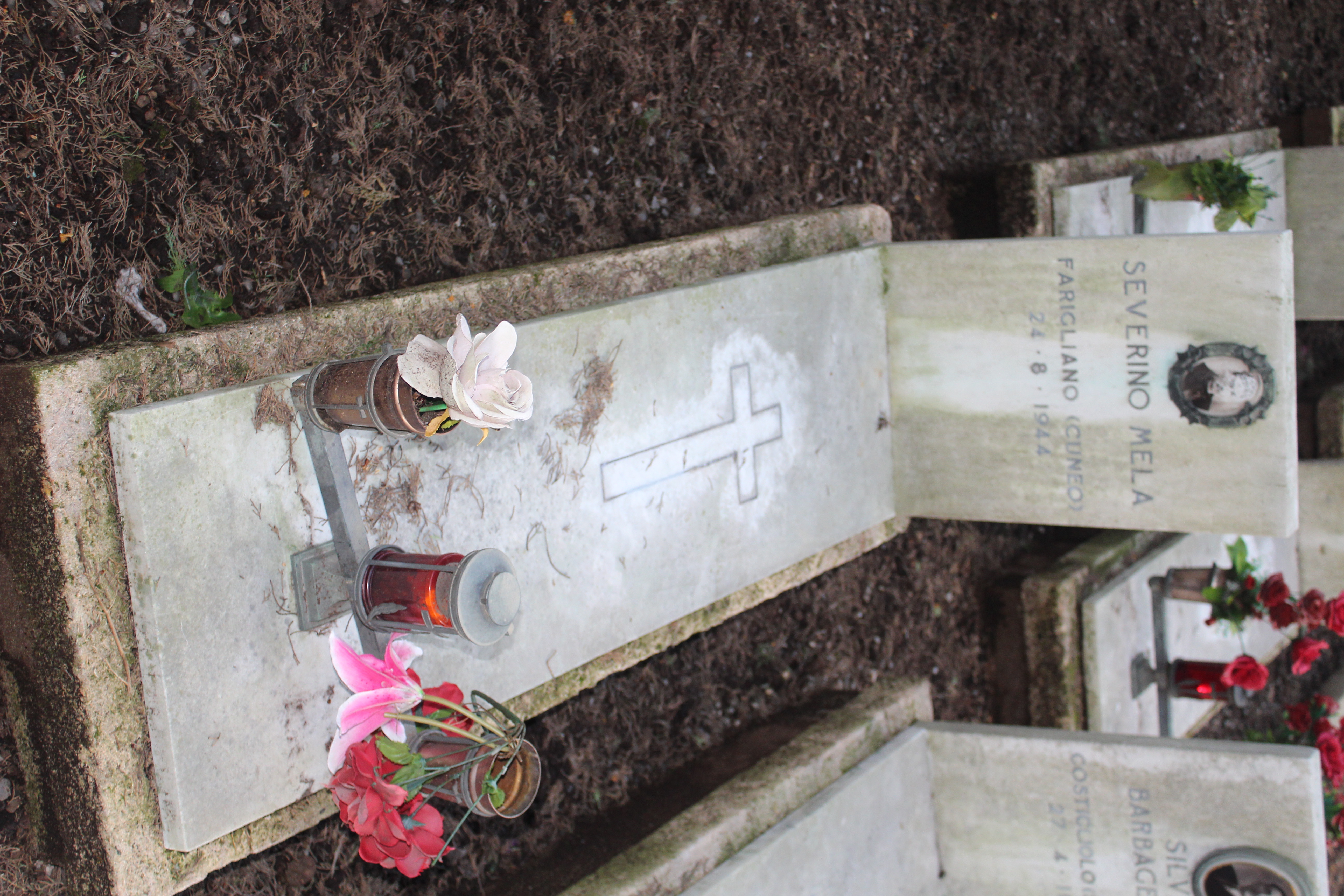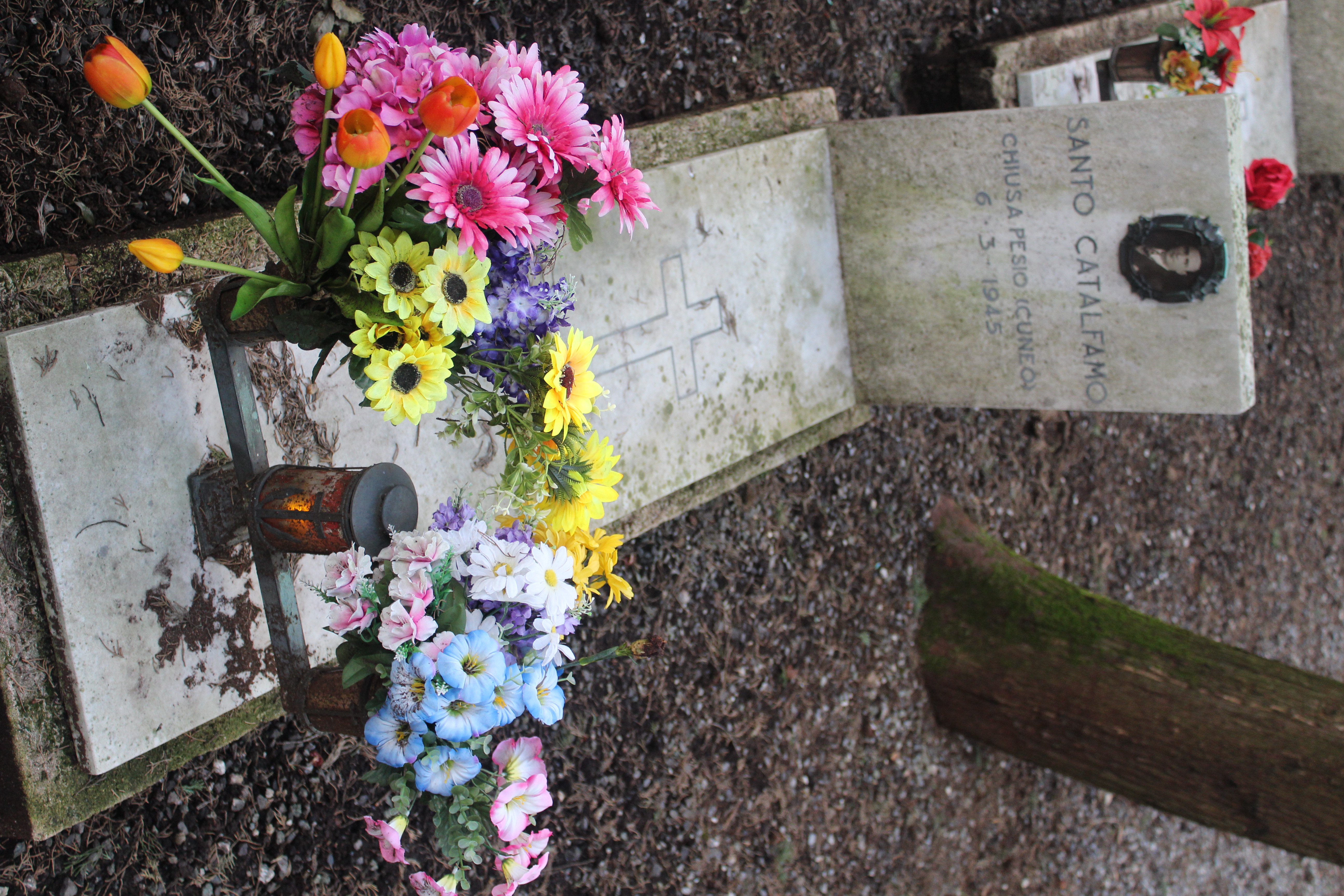 Complesso sepolcrale allineato in fitte file di lapidi e lastre rettangolari in pietra chiara, patinate dal tempo. Ogni sepoltura presenta una stele verticale con medaglione e iscrizioni. Tra gli alberi ad alto fusto spicca una targa commemorativa su supporto.
