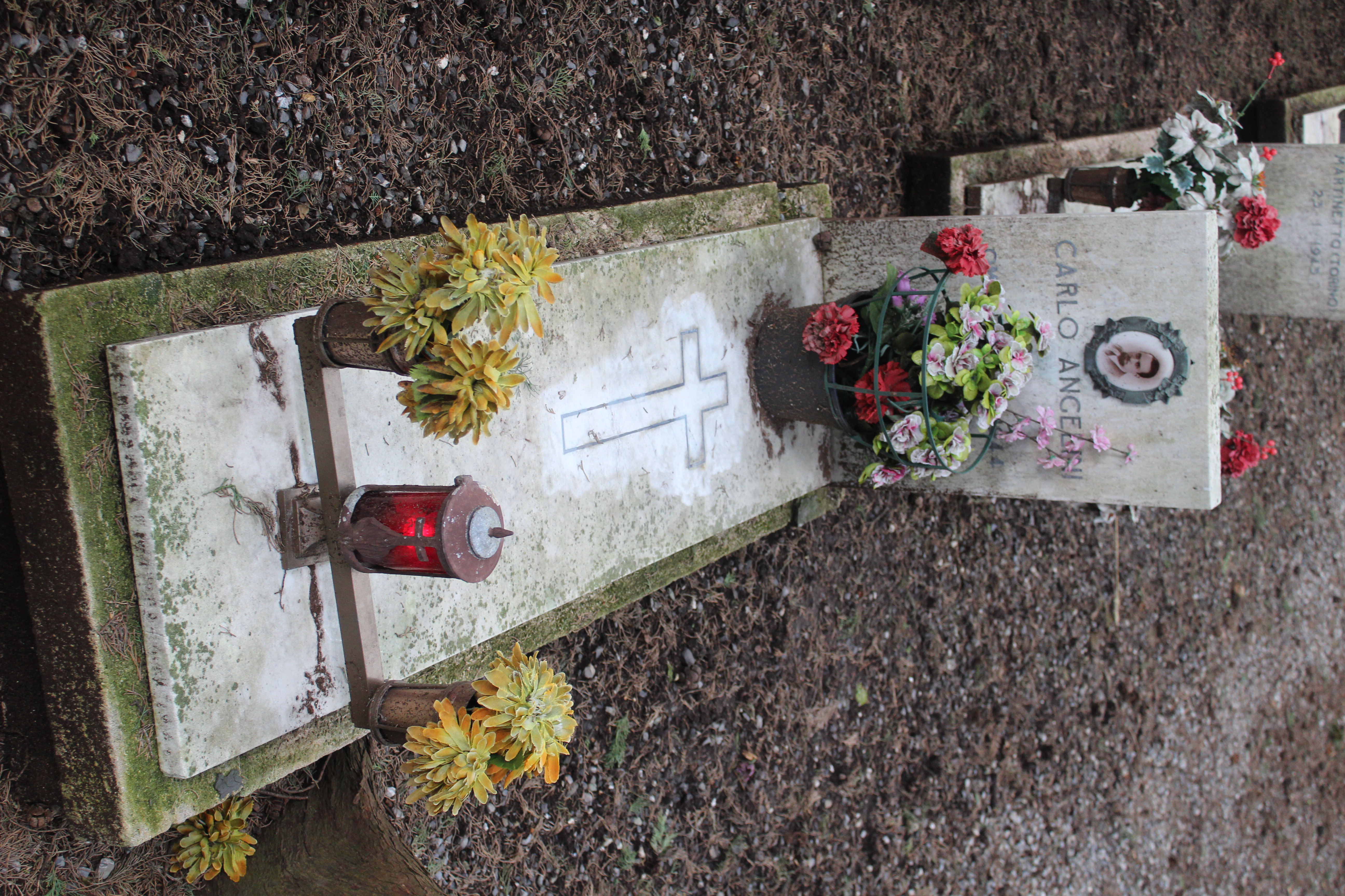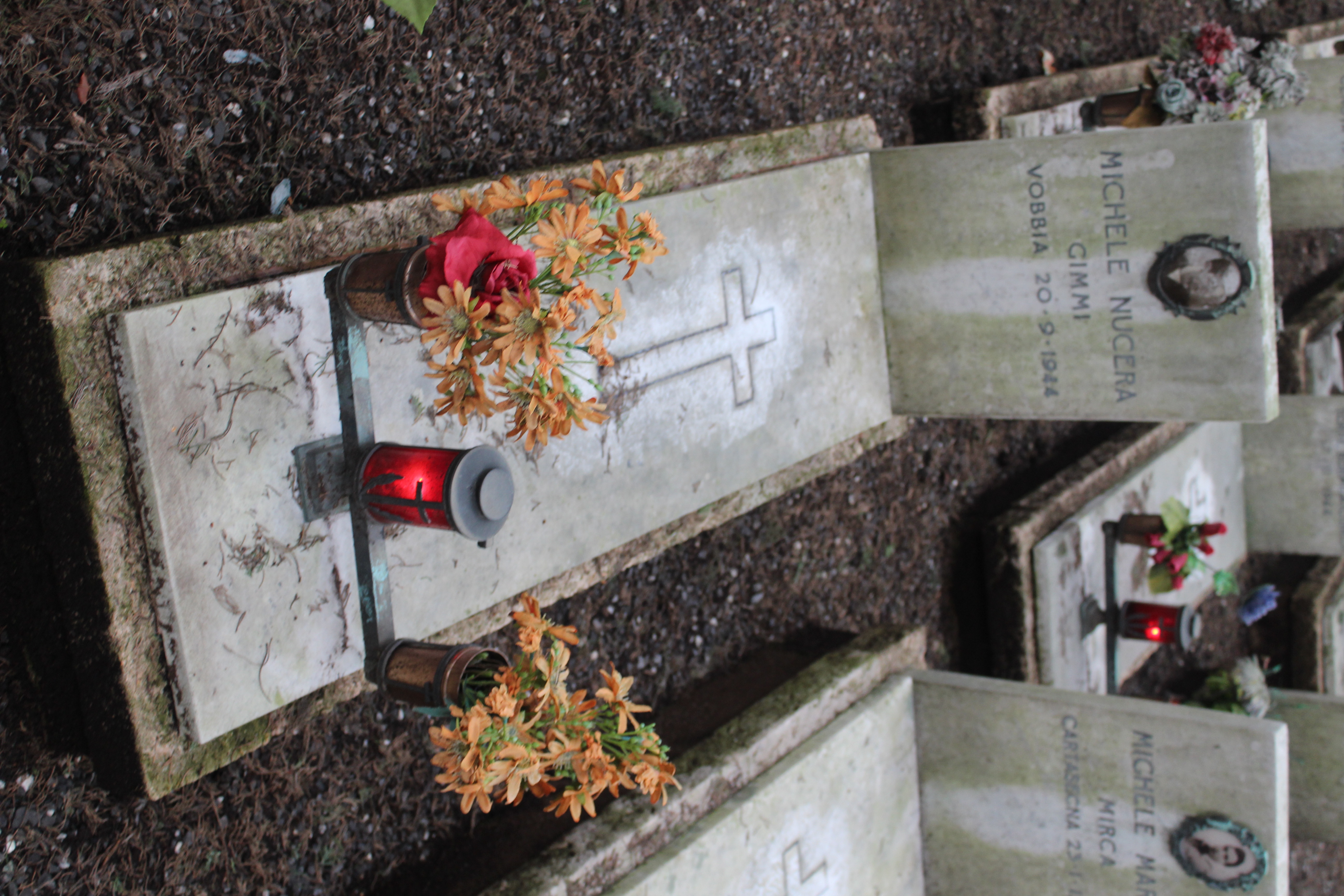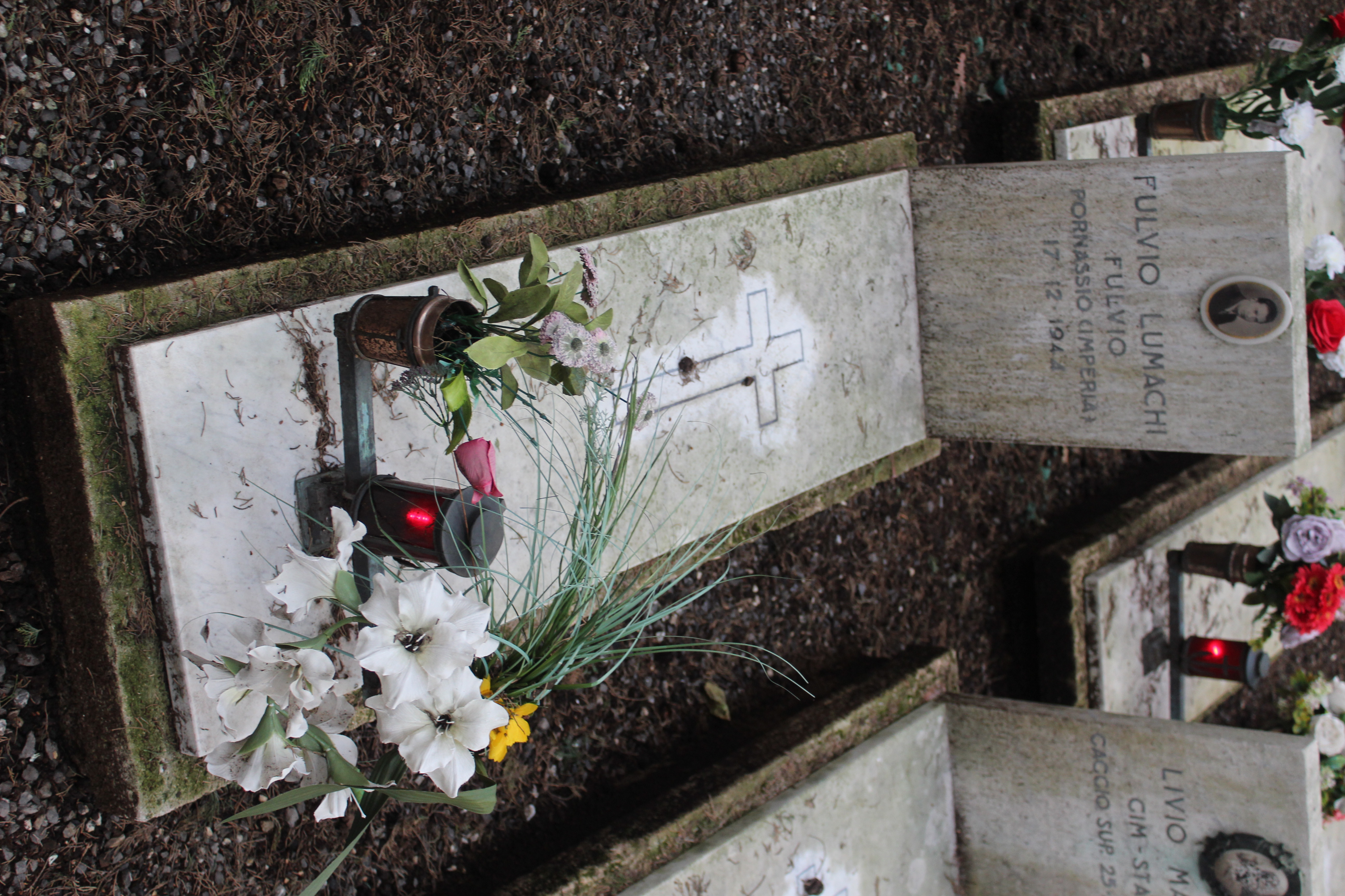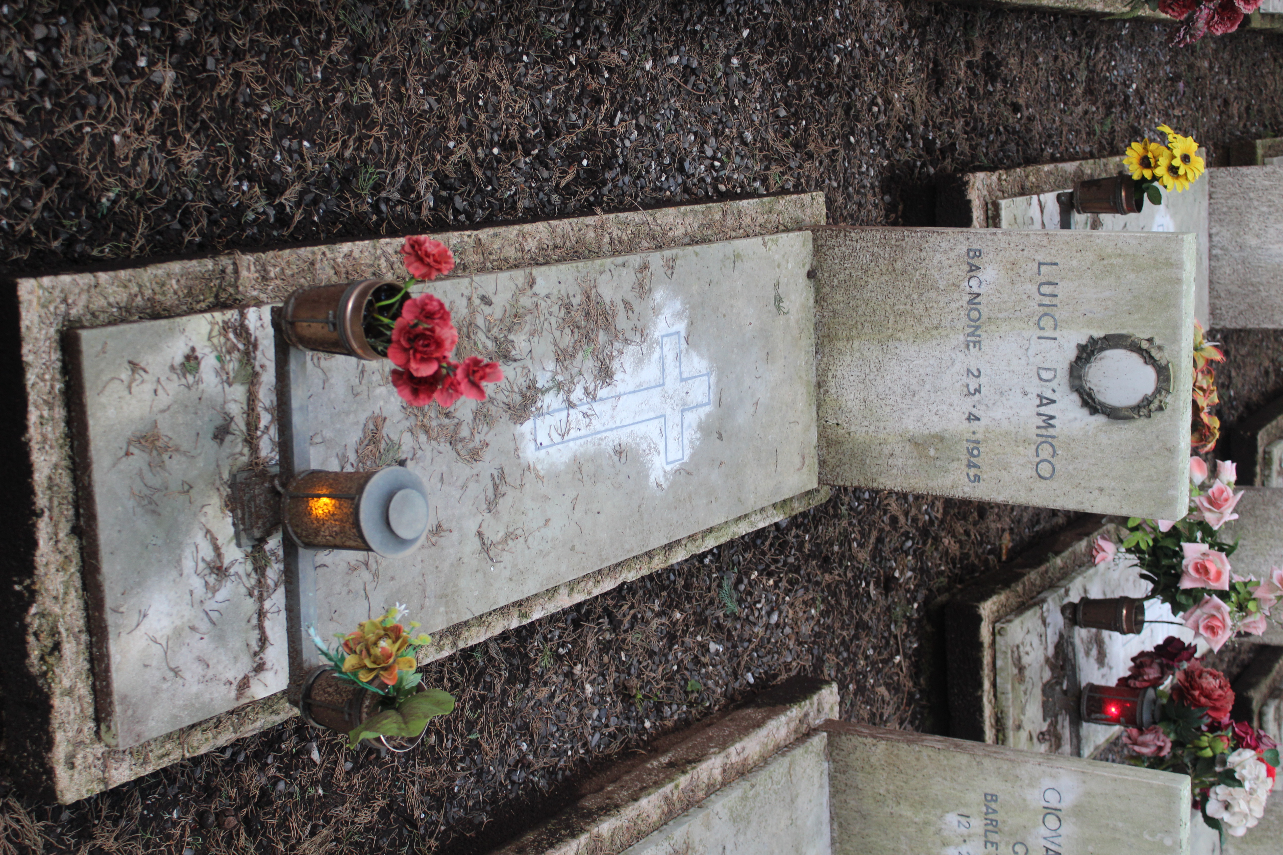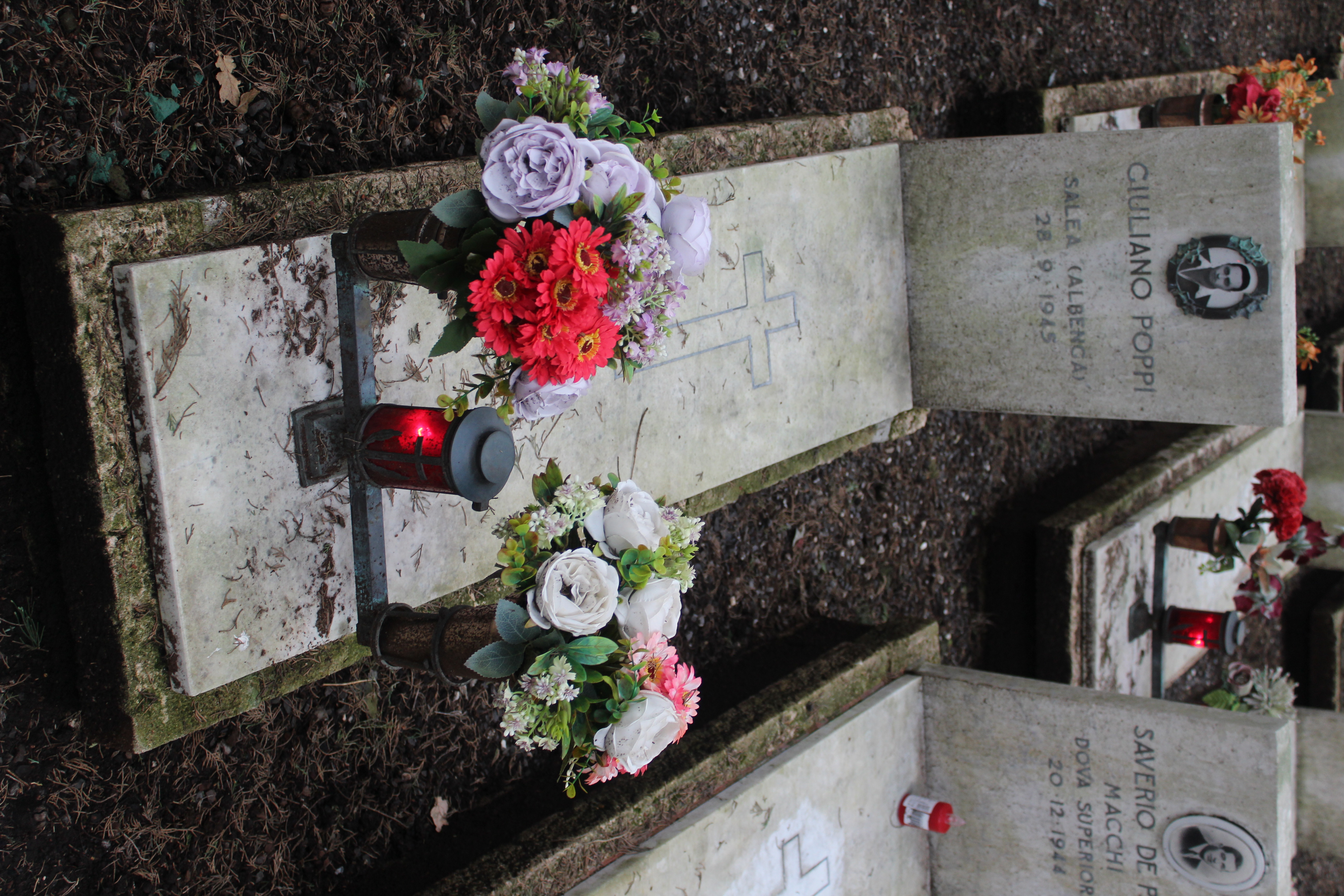 Complesso sepolcrale allineato in fitte file di lapidi e lastre rettangolari in pietra chiara, patinate dal tempo. Ogni sepoltura presenta una stele verticale con medaglione e iscrizioni. Tra gli alberi ad alto fusto spicca una targa commemorativa su supporto.
