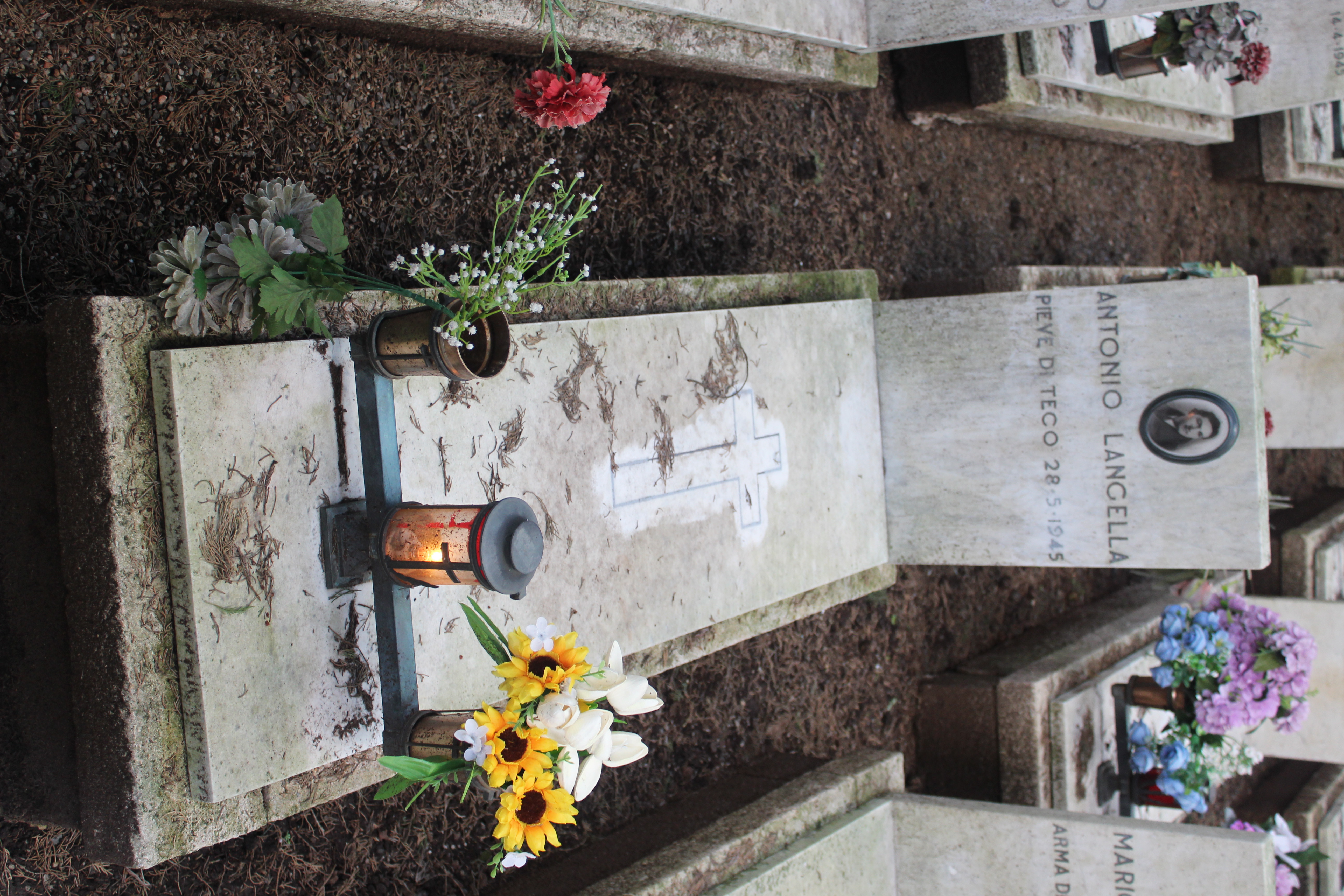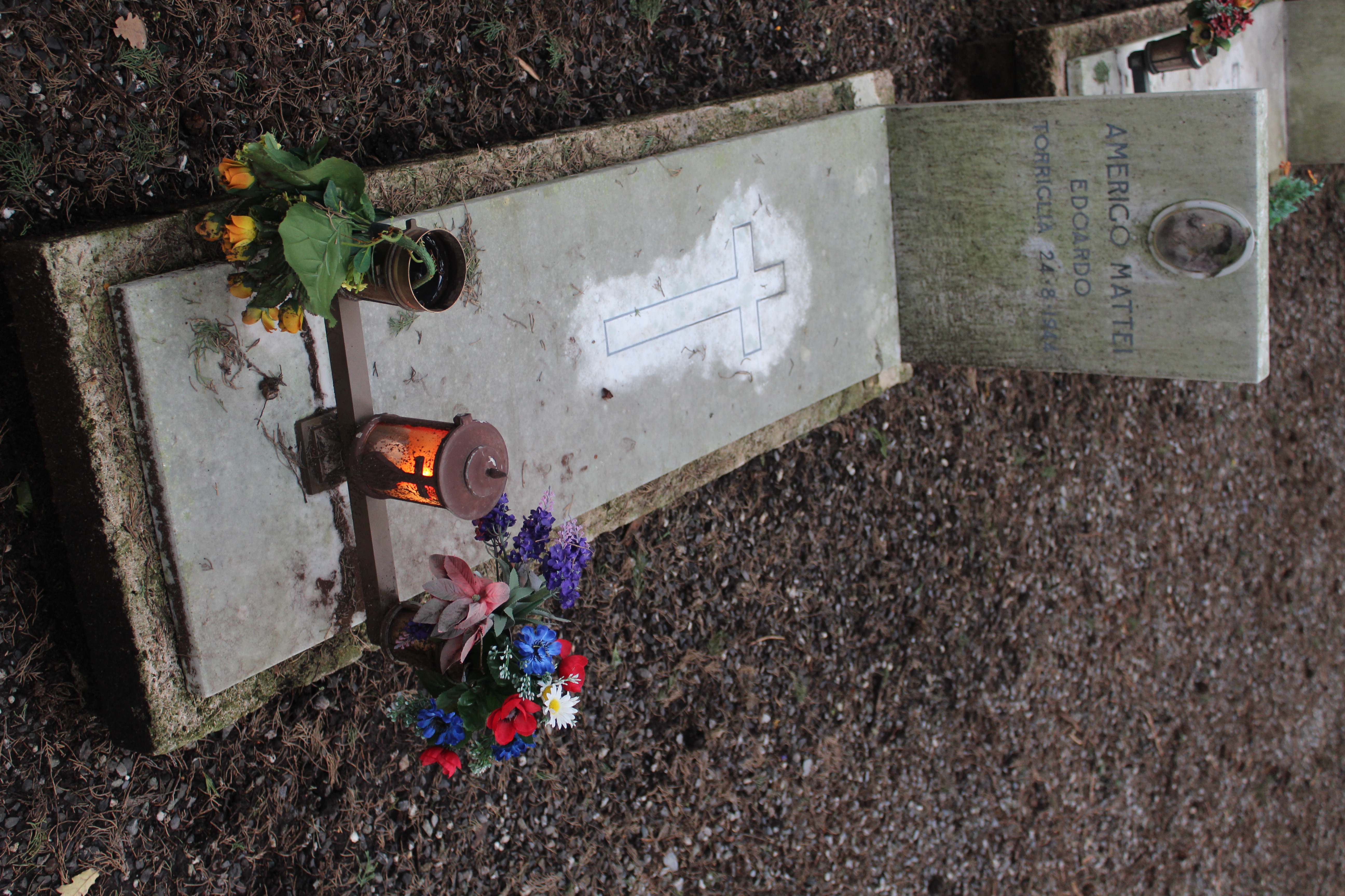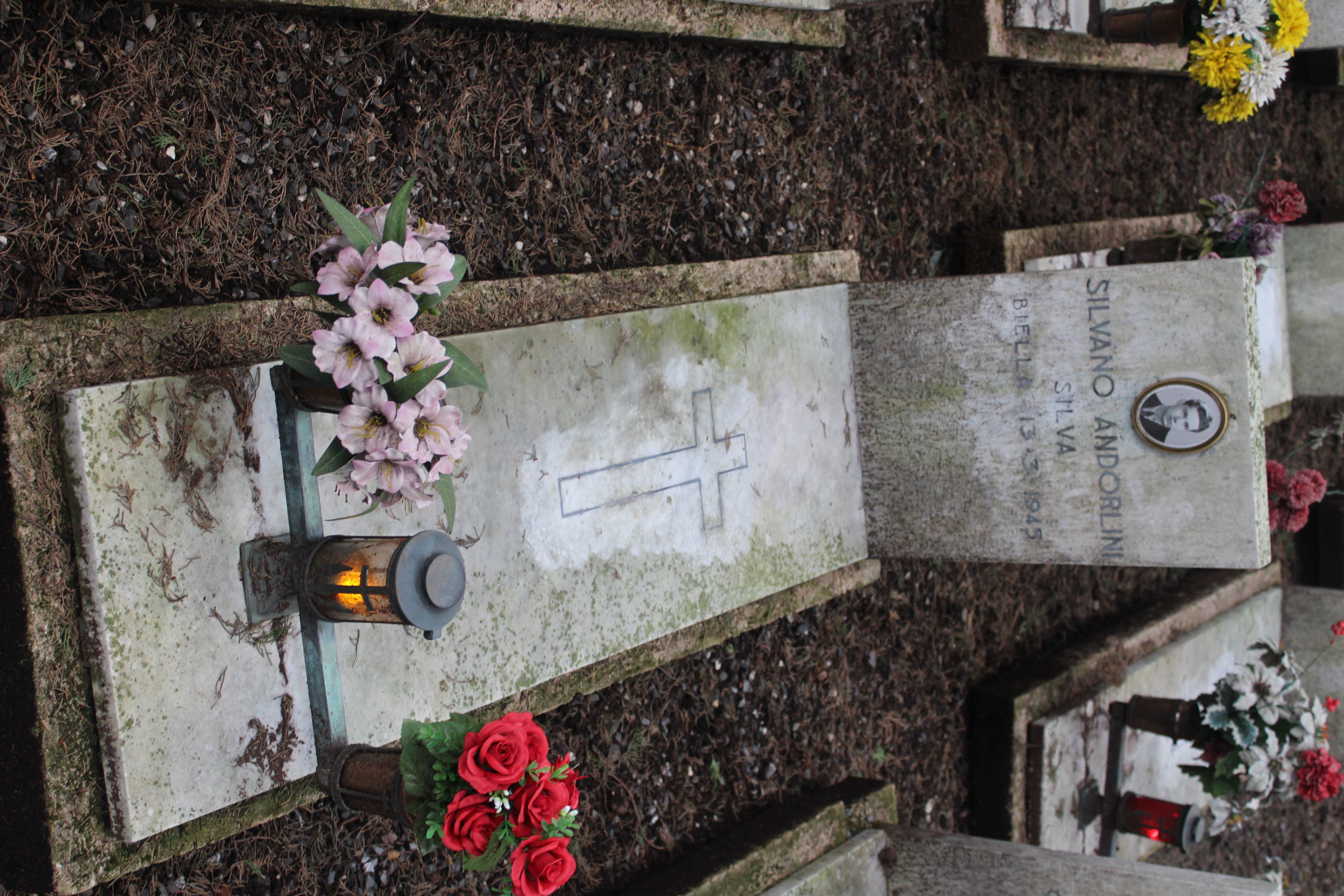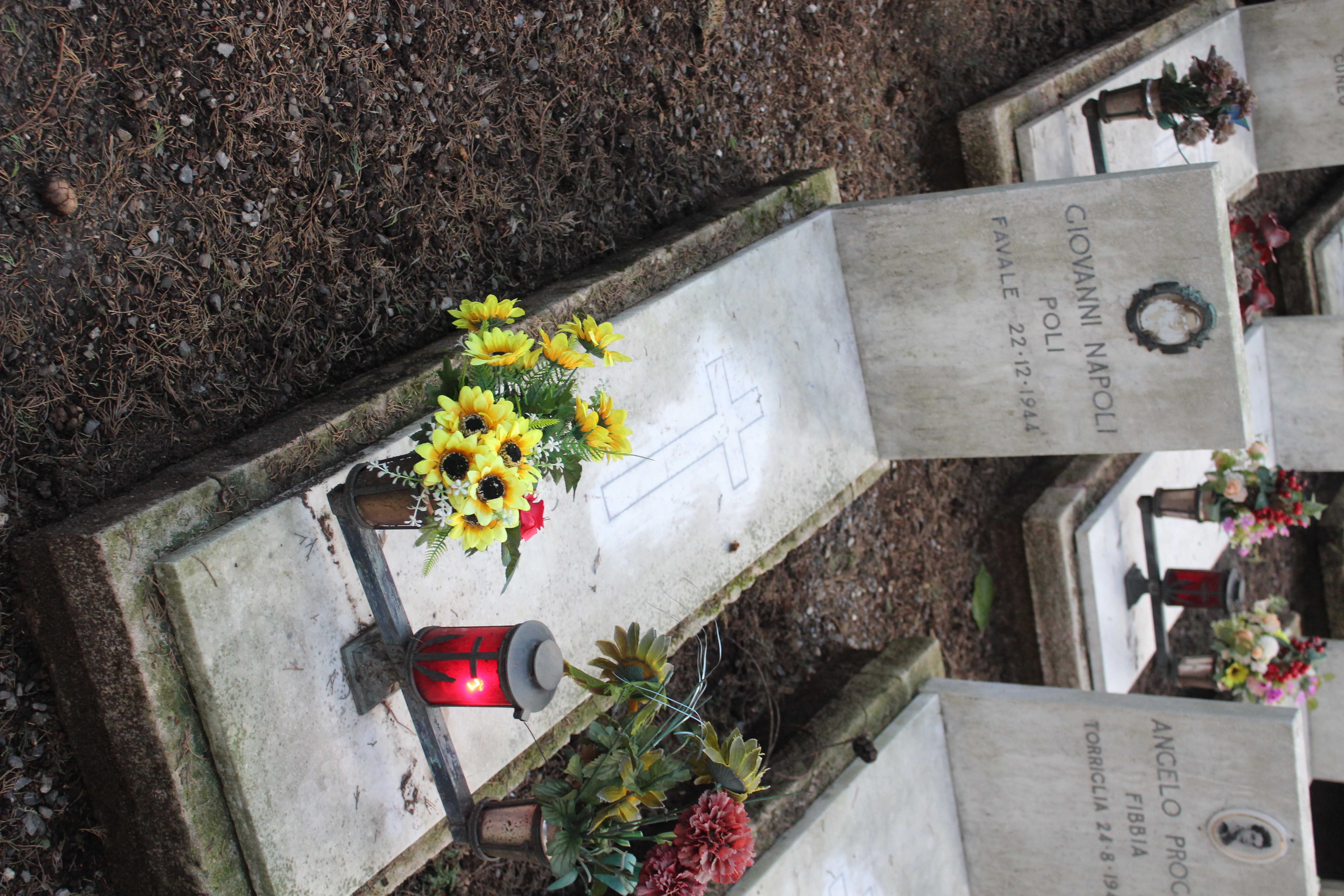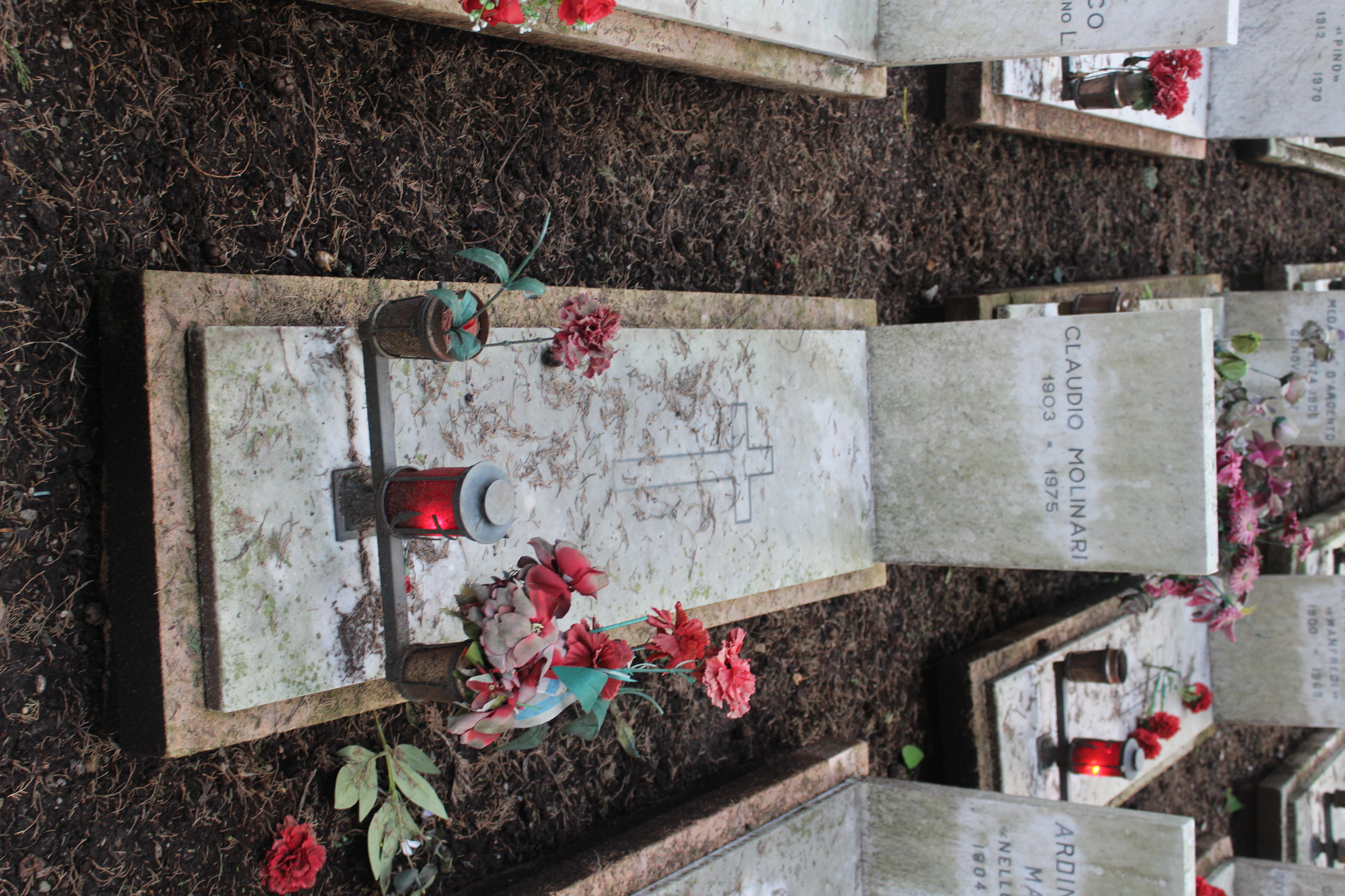 Complesso sepolcrale allineato in fitte file di lapidi e lastre rettangolari in pietra chiara, patinate dal tempo. Ogni sepoltura presenta una stele verticale con medaglione e iscrizioni. Tra gli alberi ad alto fusto spicca una targa commemorativa su supporto.