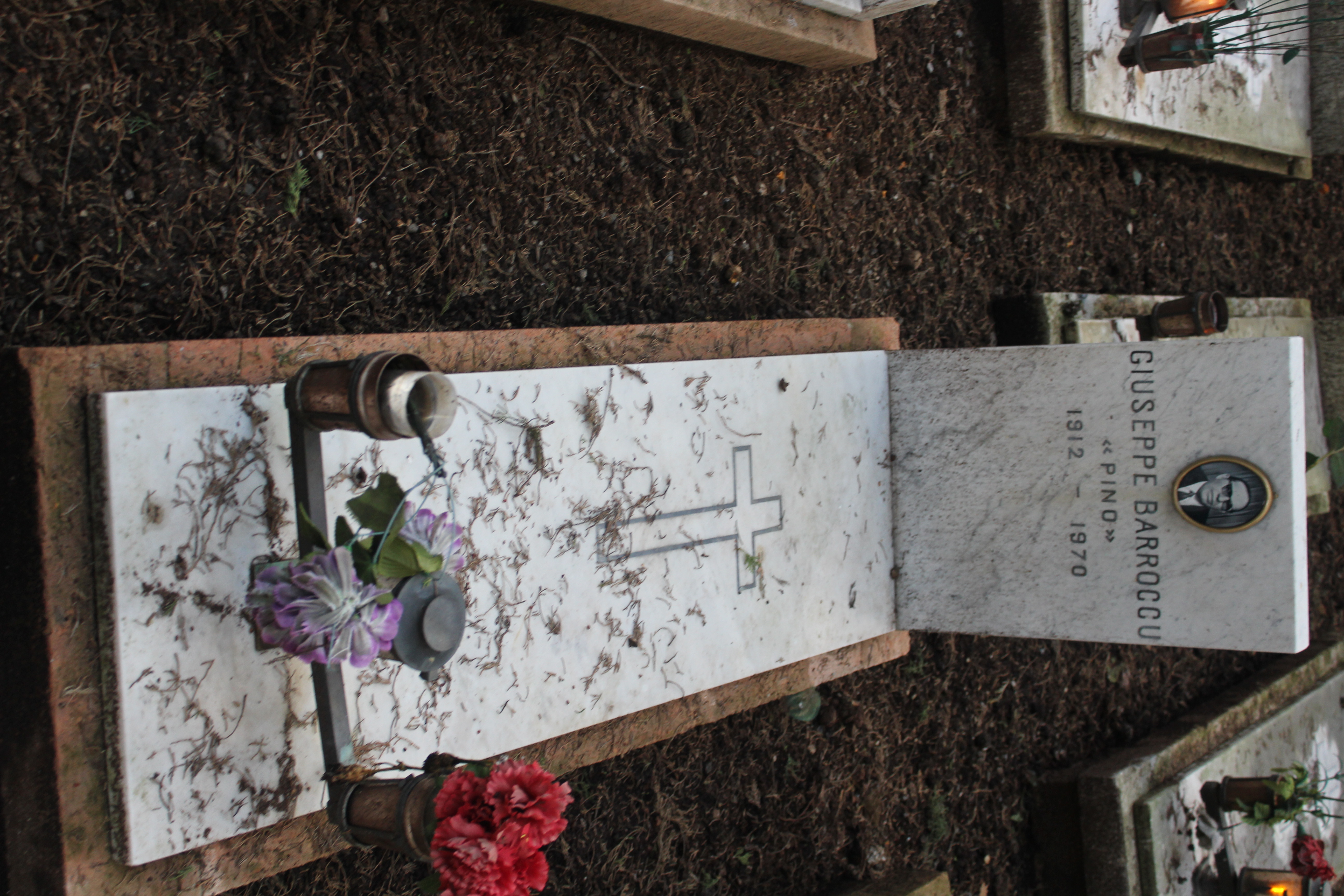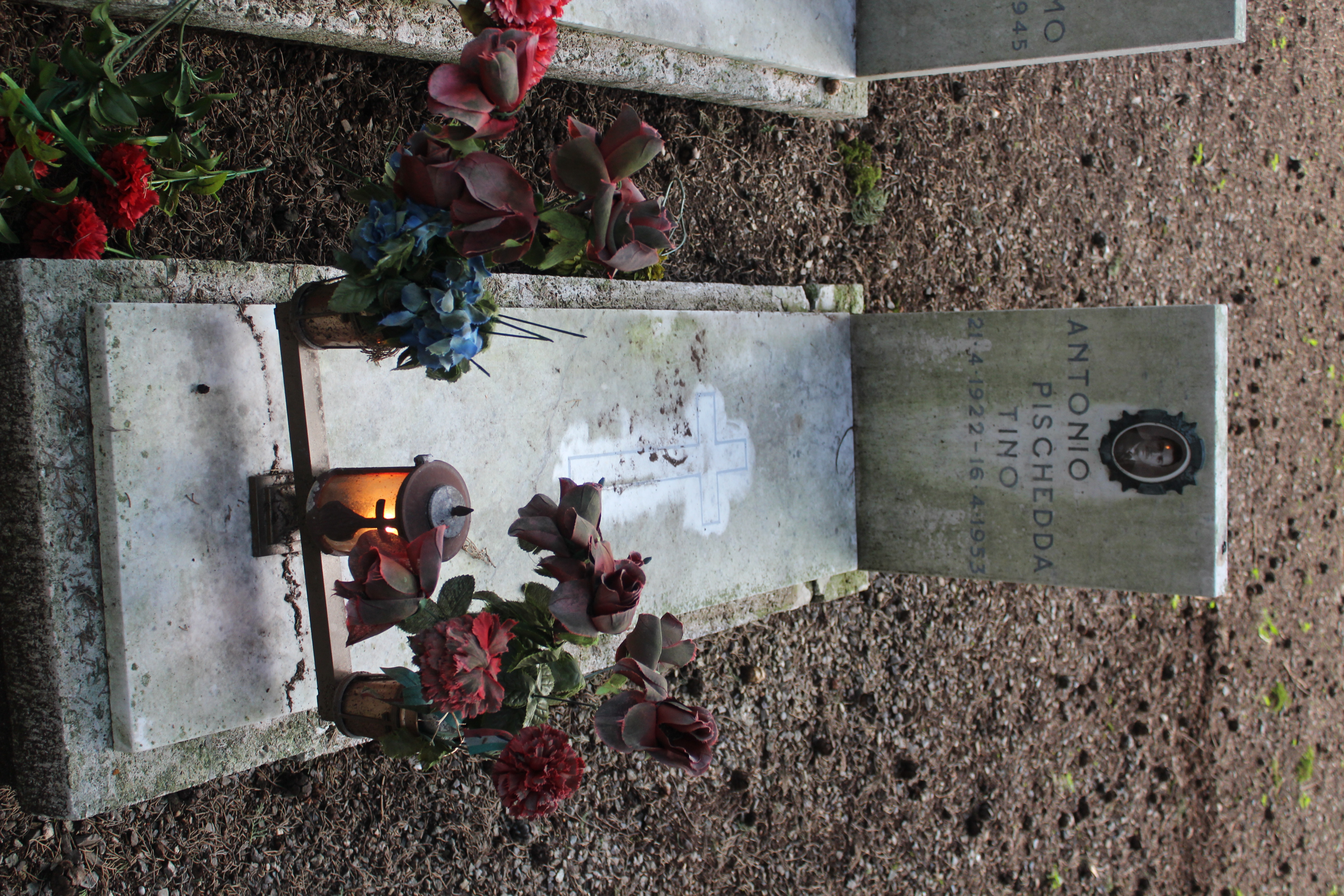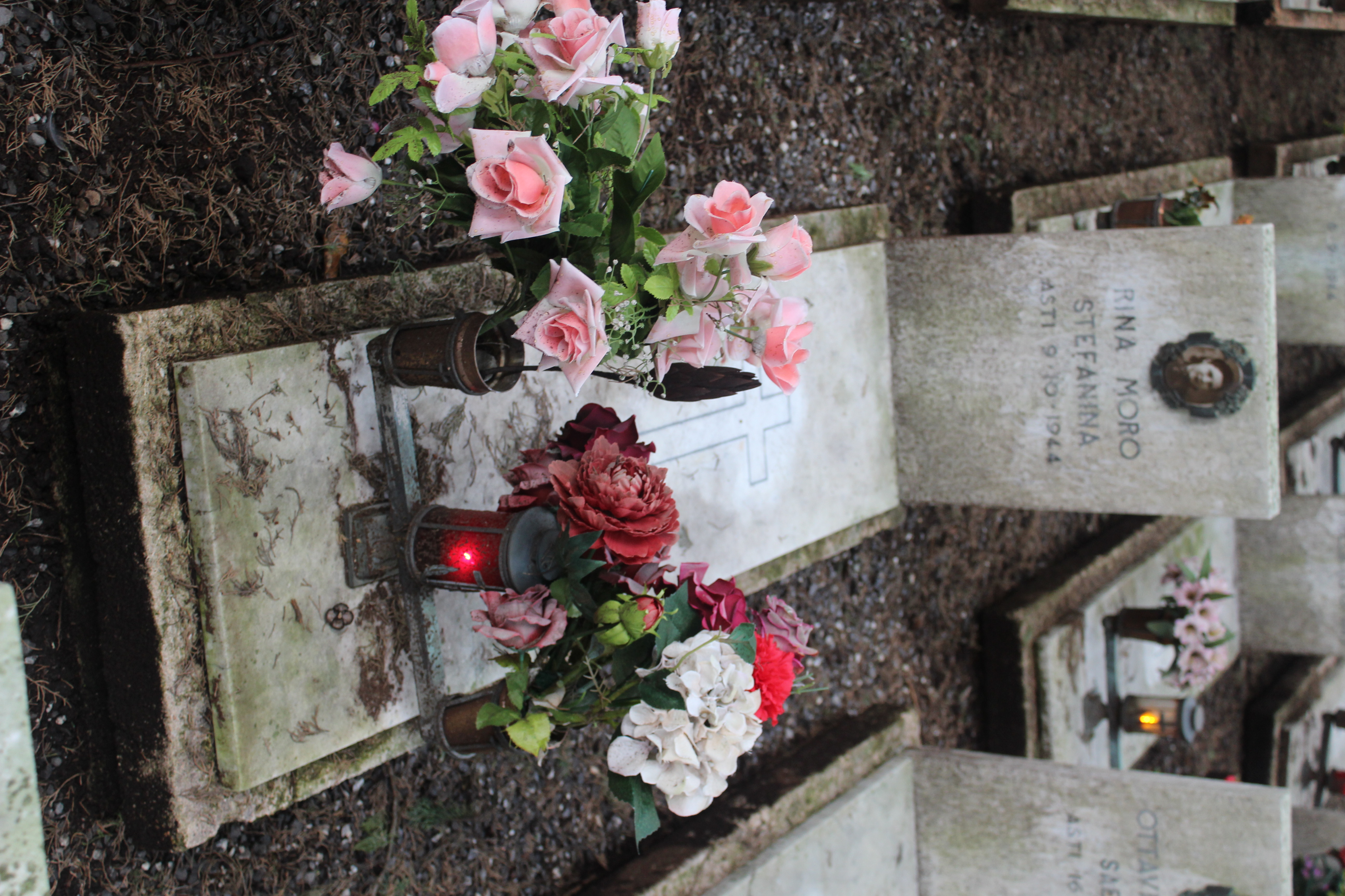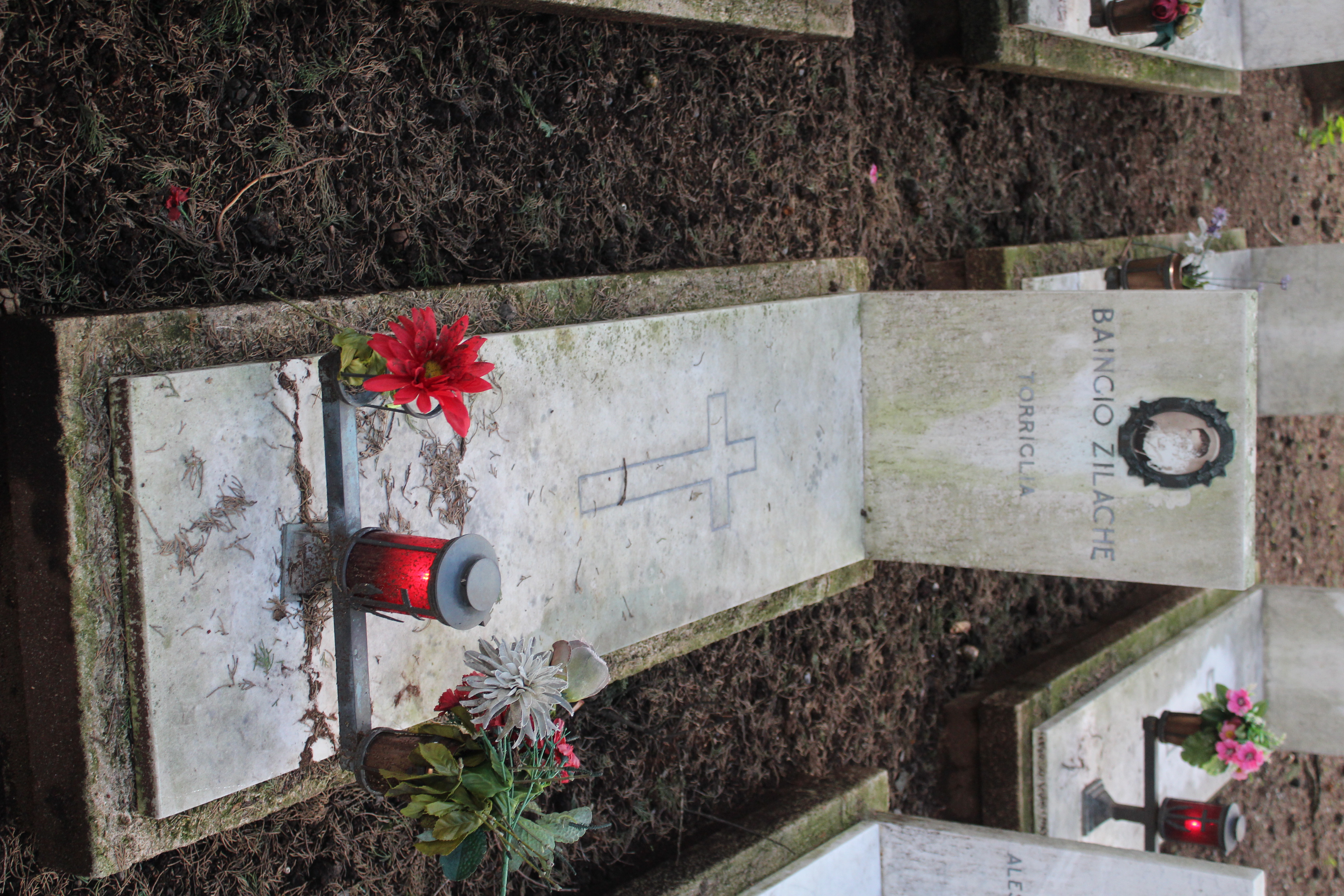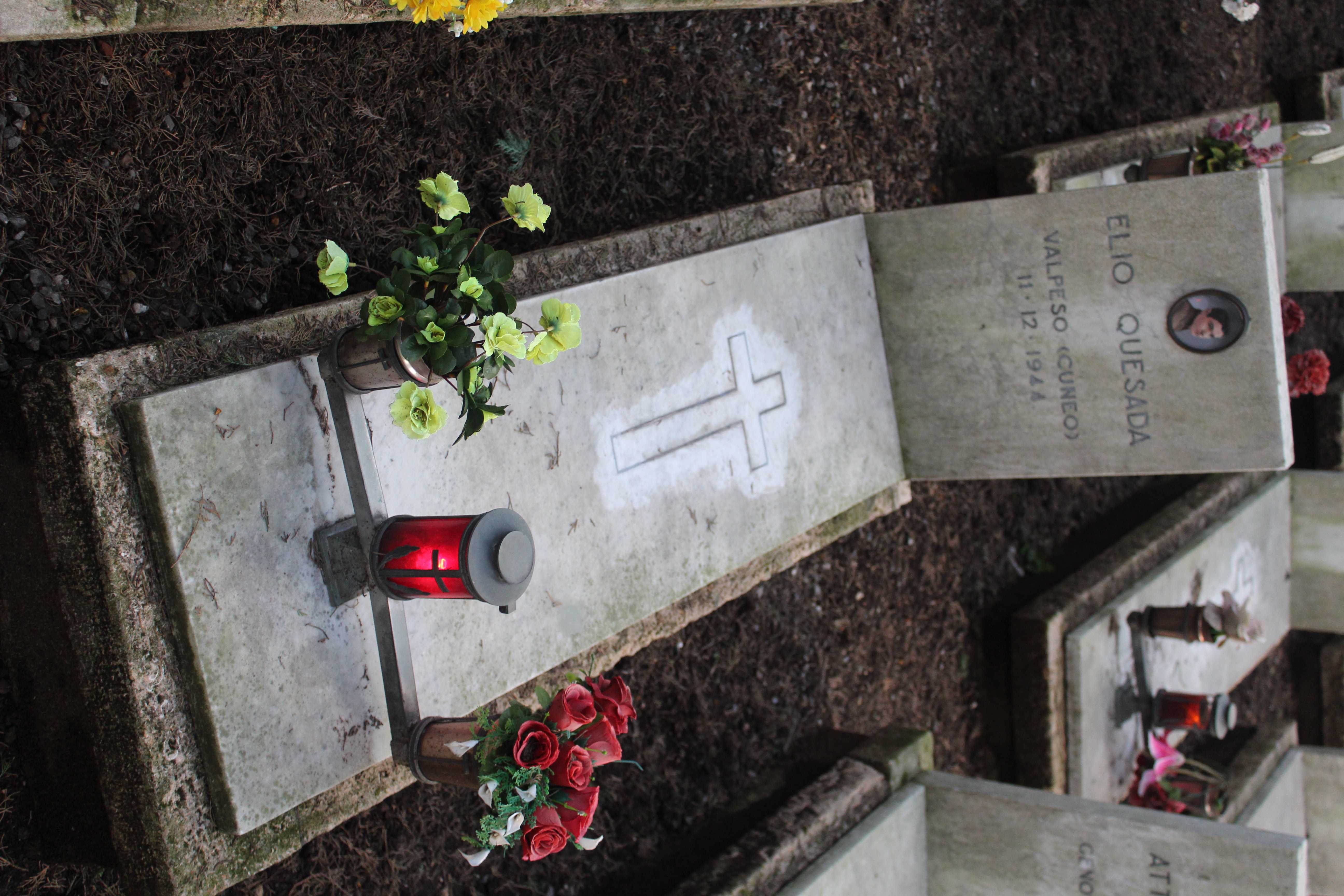 Complesso sepolcrale allineato in fitte file di lapidi e lastre rettangolari in pietra chiara, patinate dal tempo. Ogni sepoltura presenta una stele verticale con medaglione e iscrizioni. Tra gli alberi ad alto fusto spicca una targa commemorativa su supporto.