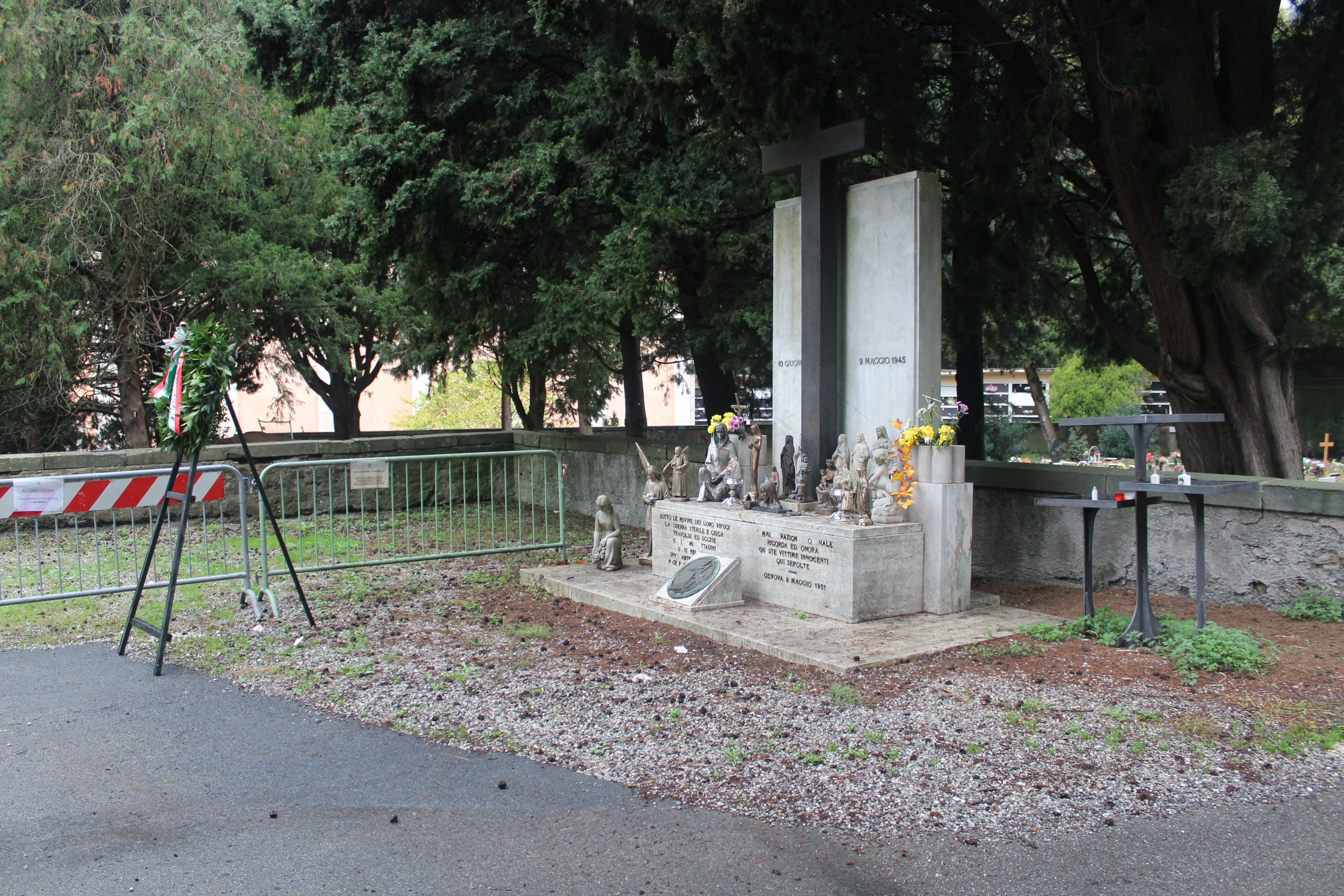 10 giugno 1940 - 9 maggio 1945 sotto le rovine dei loro rifugi la guerra sterile e cieca travolse ed uccise gli inermi cittadini caduti nel dolore invocante all'umana pace fraterna e feconda l'amministrazione comunale ricorda ed onora queste vittime innocenti qui sepolte genova 9 maggio 1951