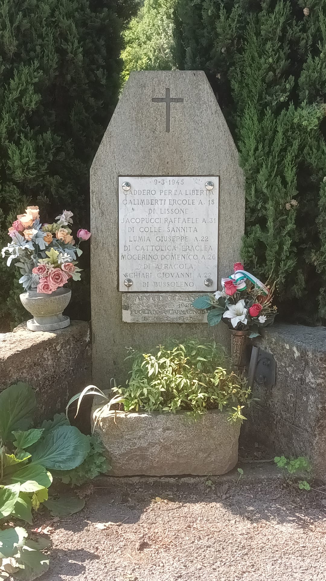 9-3-1945 caddero per la libertà CALIMBERTI ERCOLE a. 18 di lissone JACOPUCCI RAFFAELE a. 31 di colle sannita LUMIA GIUSEPPE a. 22. di cattolica eraclea MONCERINO DOMENICO a. 26 di afragola SCHIARI GIOVANNI a. 22 di bussoleno