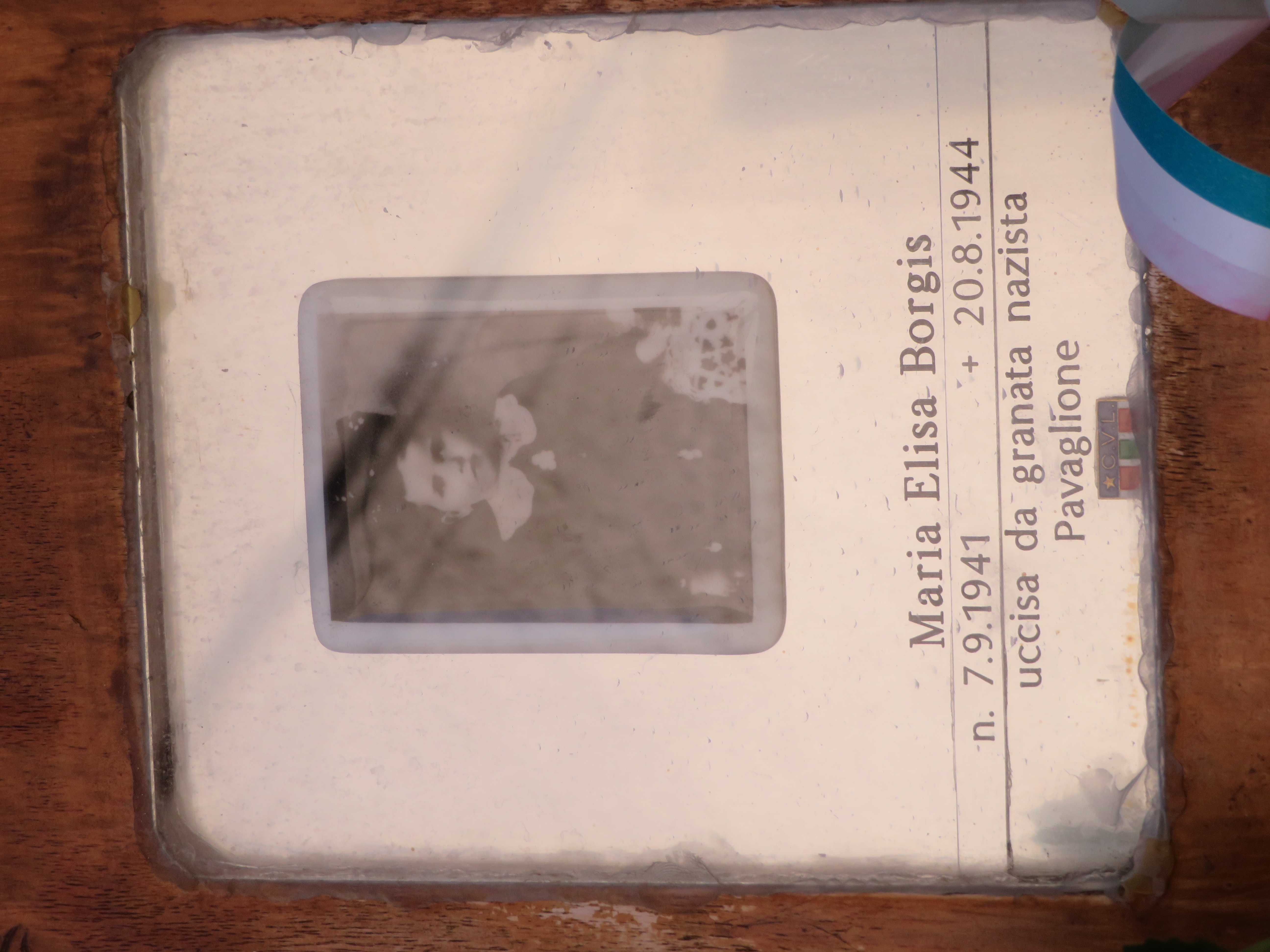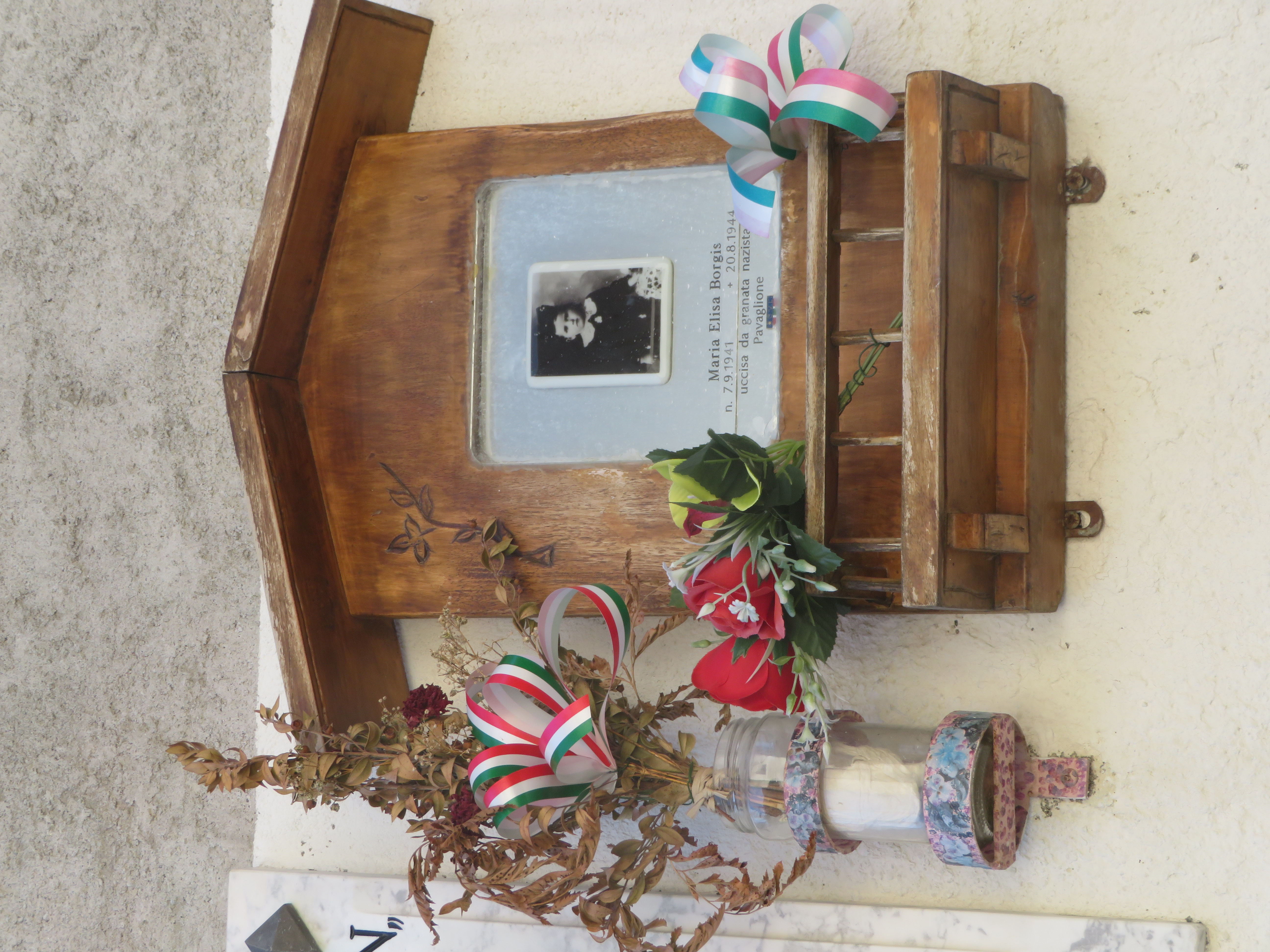 Piccola edicola murale in legno con tetto a spiovente, fissata su una parete. Al centro, dietro un vetro, si vede una fotografia in bianco e nero e un’iscrizione composta su più righe. Sotto è applicata una mensolina in legno con supporti inferiori.
