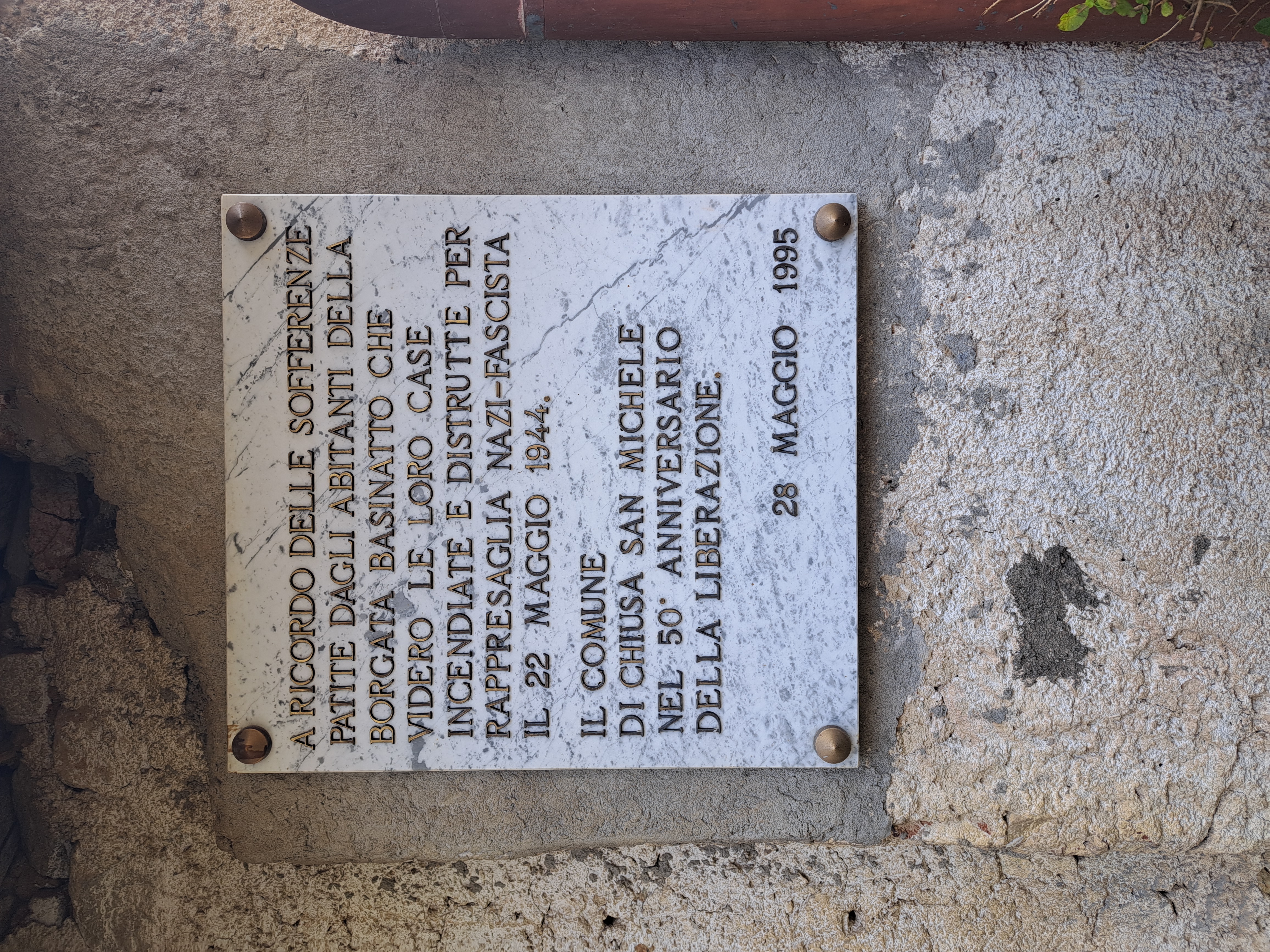 Lapide rettangolare in pietra chiara, fissata ai quattro angoli con borchie metalliche, applicata su una parete esterna in muratura grezza. L’iscrizione è composta da lettere metalliche, distribuite su più righe con una linea finale più corta in basso.