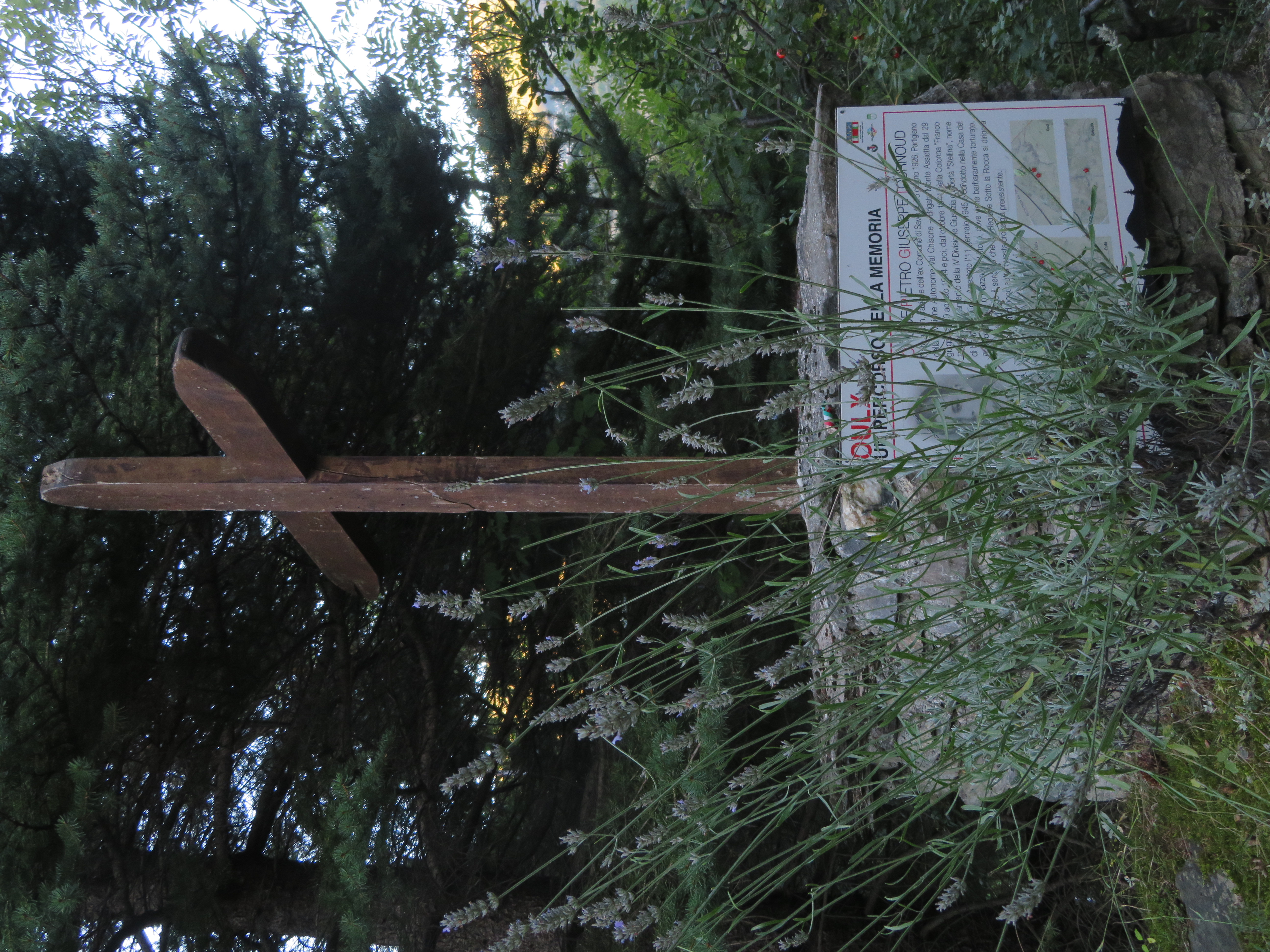 Una croce semplice in legno, con braccio orizzontale fissato al montante verticale, è posta su un basso basamento di pietre irregolari legate a malta. Sul fronte è applicato un ampio pannello informativo rigido a fondo chiaro, con testi, una fotografia in bianco e nero e mappe, oltre a piccoli loghi. L’insieme si trova in un ambiente boschivo, tra conifere e fitti arbusti, che in parte nascondono la base e il pannello.