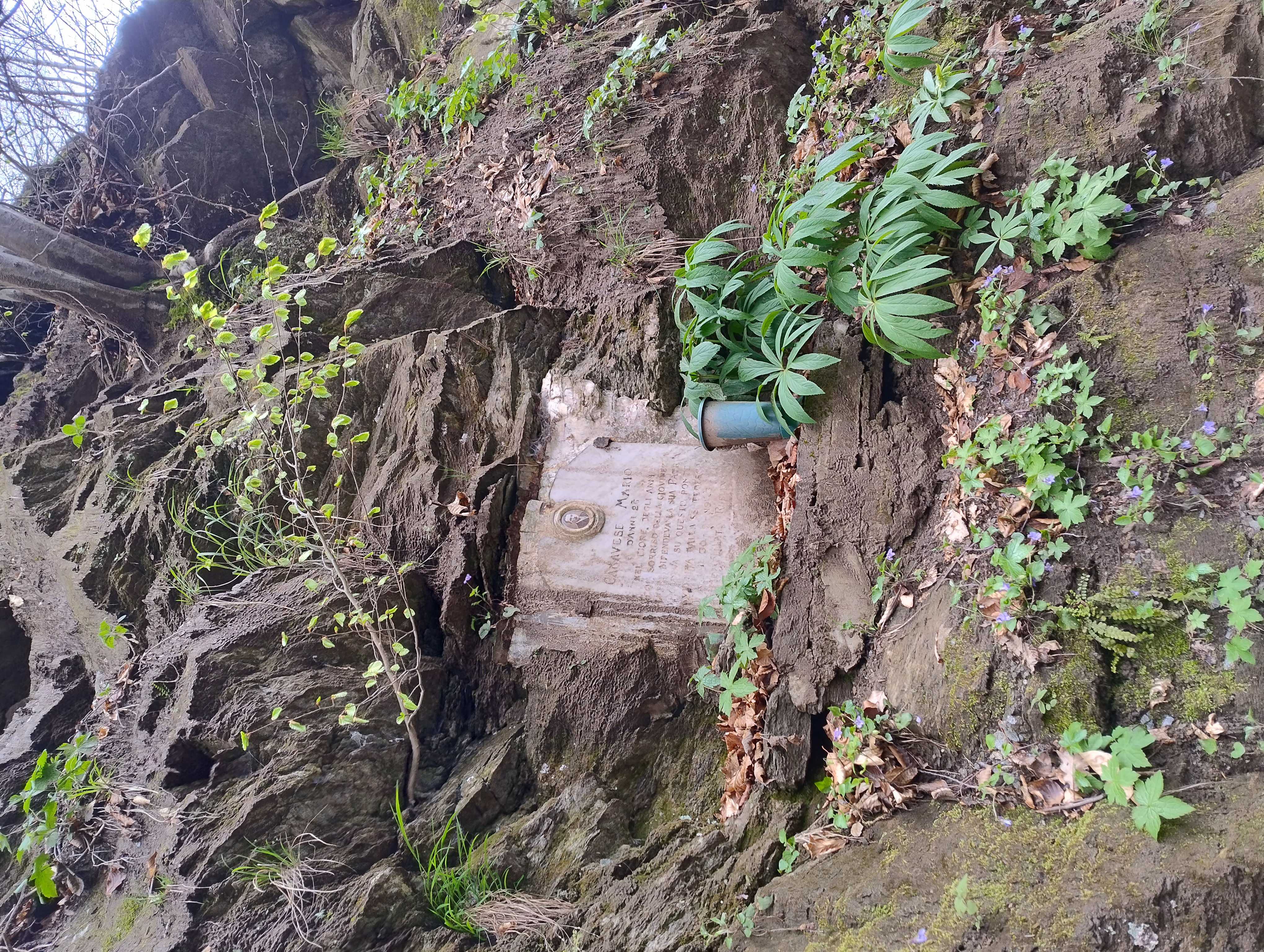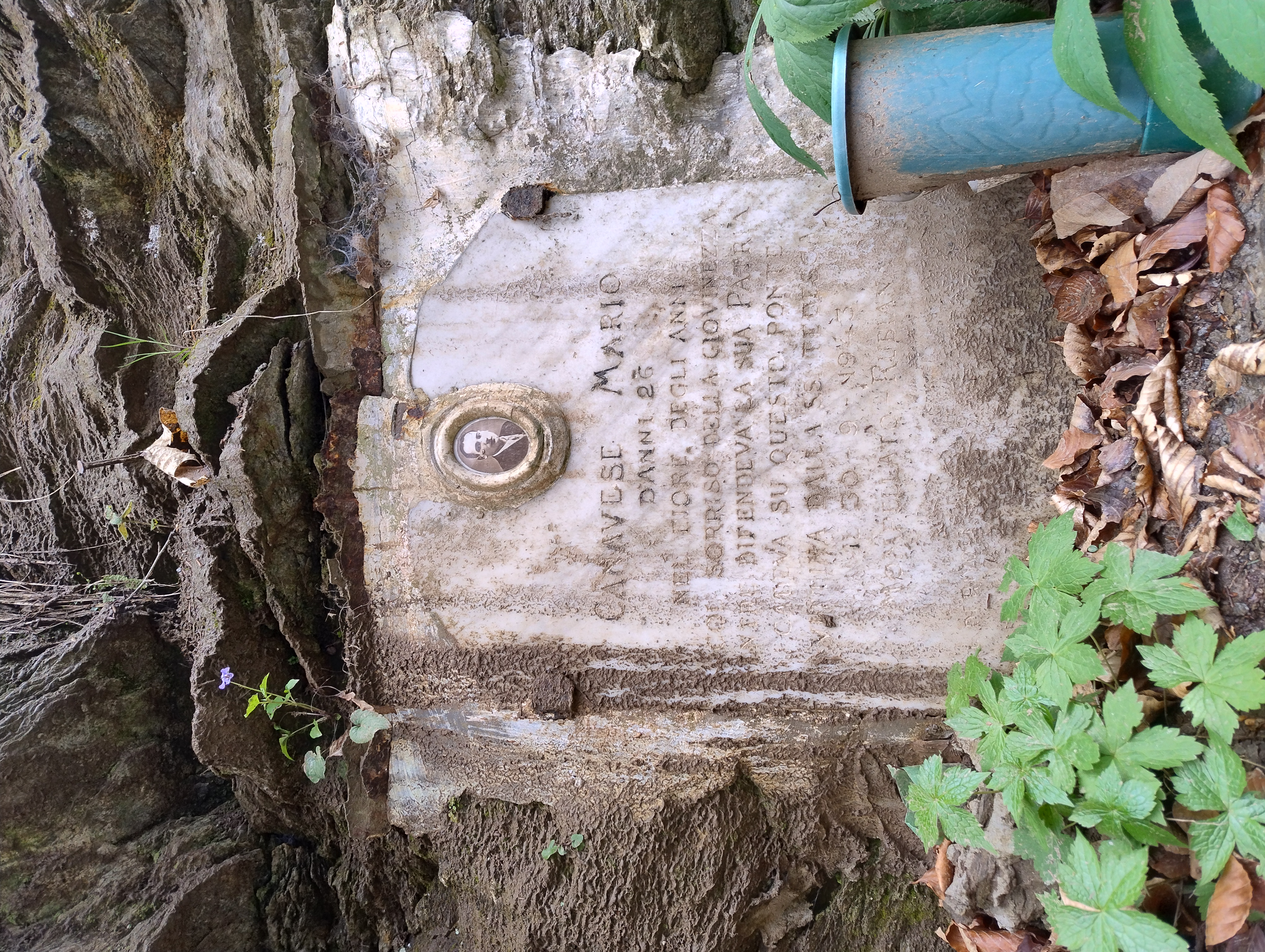 Lastra rettangolare in marmo chiaro incassata in una parete rocciosa. In alto è applicato un medaglione ovale con ritratto fotografico in bianco e nero; al centro e in basso è presente un’iscrizione incisa in caratteri maiuscoli su più righe.