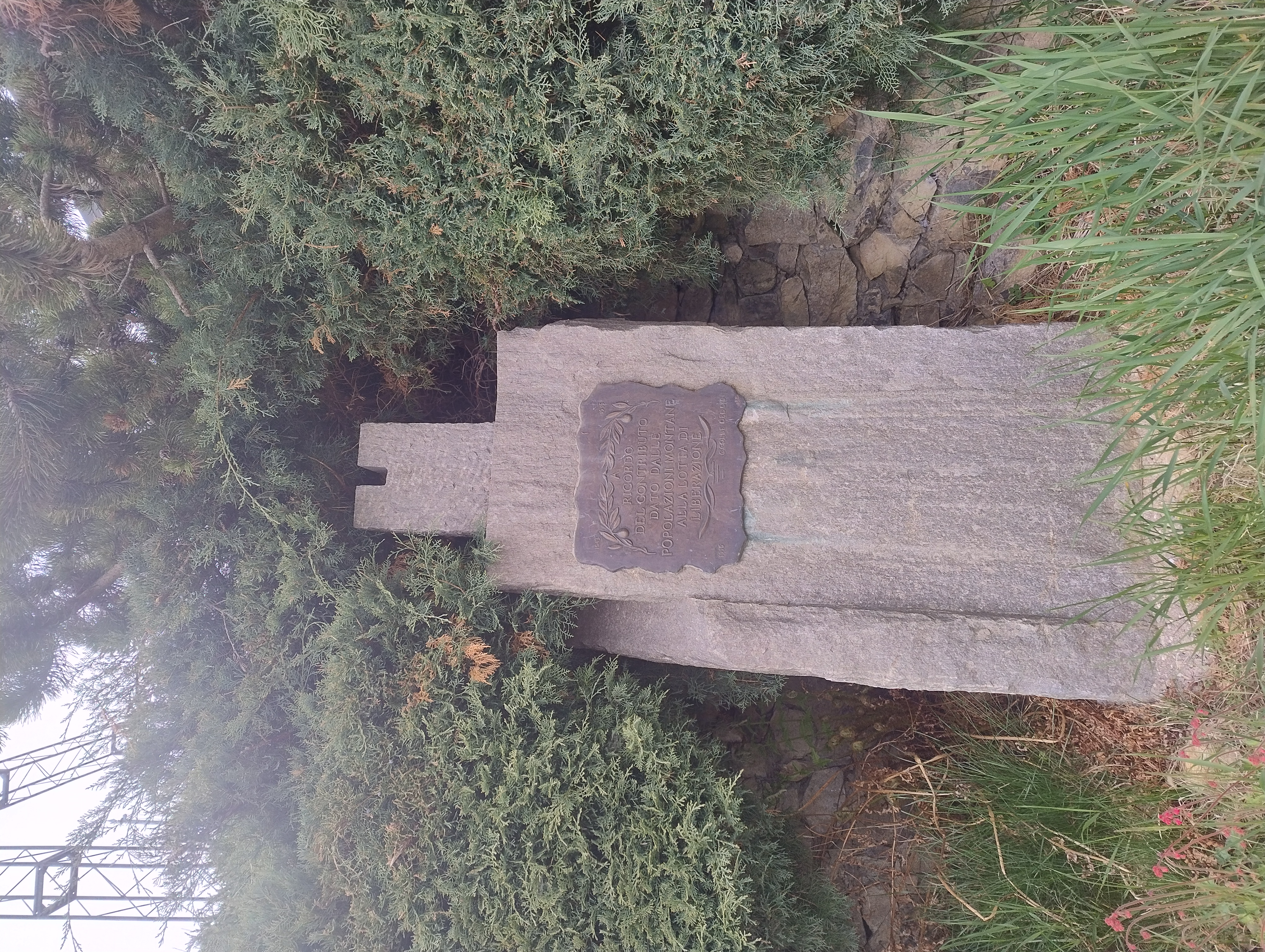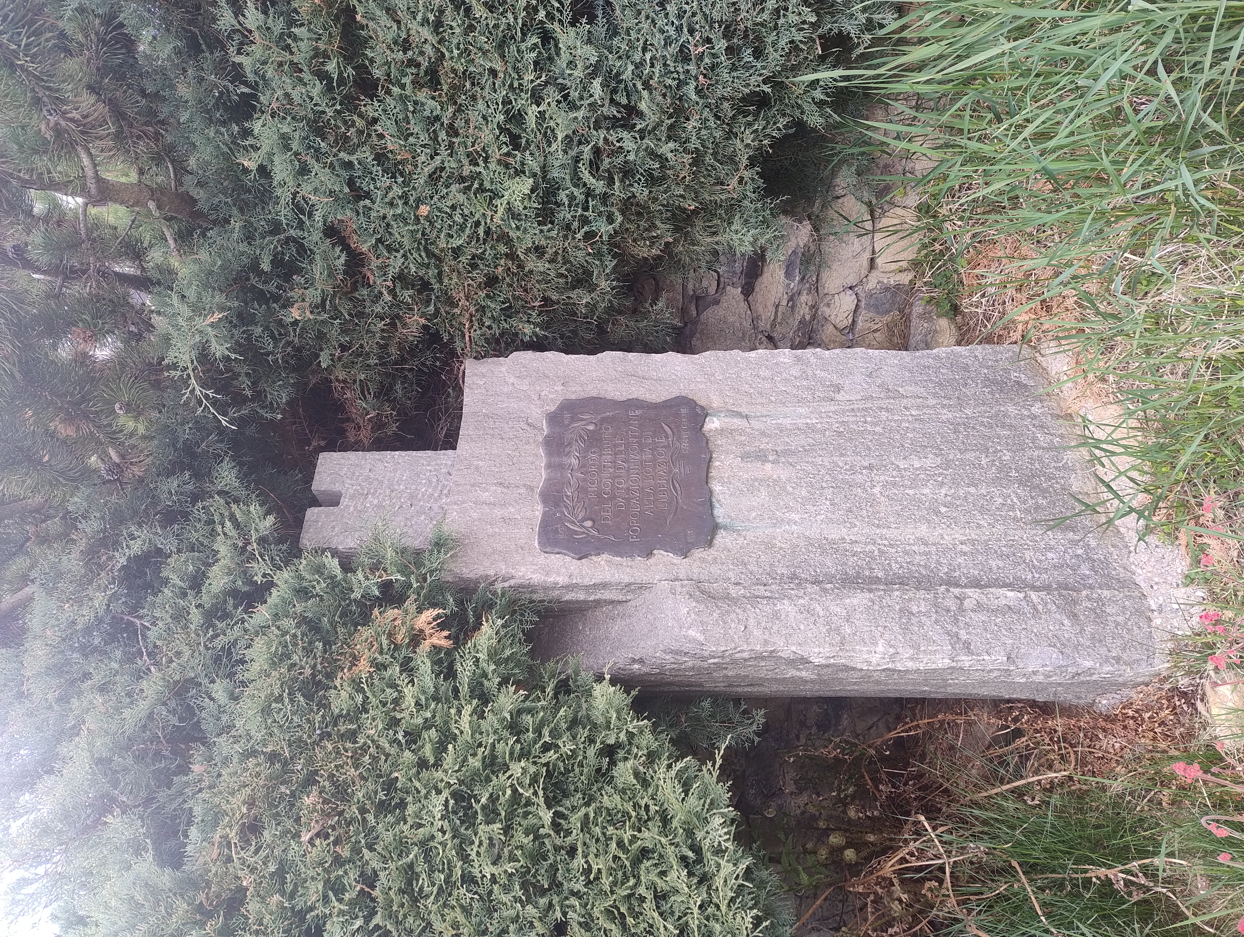 Stele in pietra grigia, alta e stretta, con sommità irregolare che presenta un incavo rettangolare simile a una merlatura. La superficie è grezza. Al centro è applicata una targa metallica scura con iscrizione in rilievo e motivi decorativi vegetali.