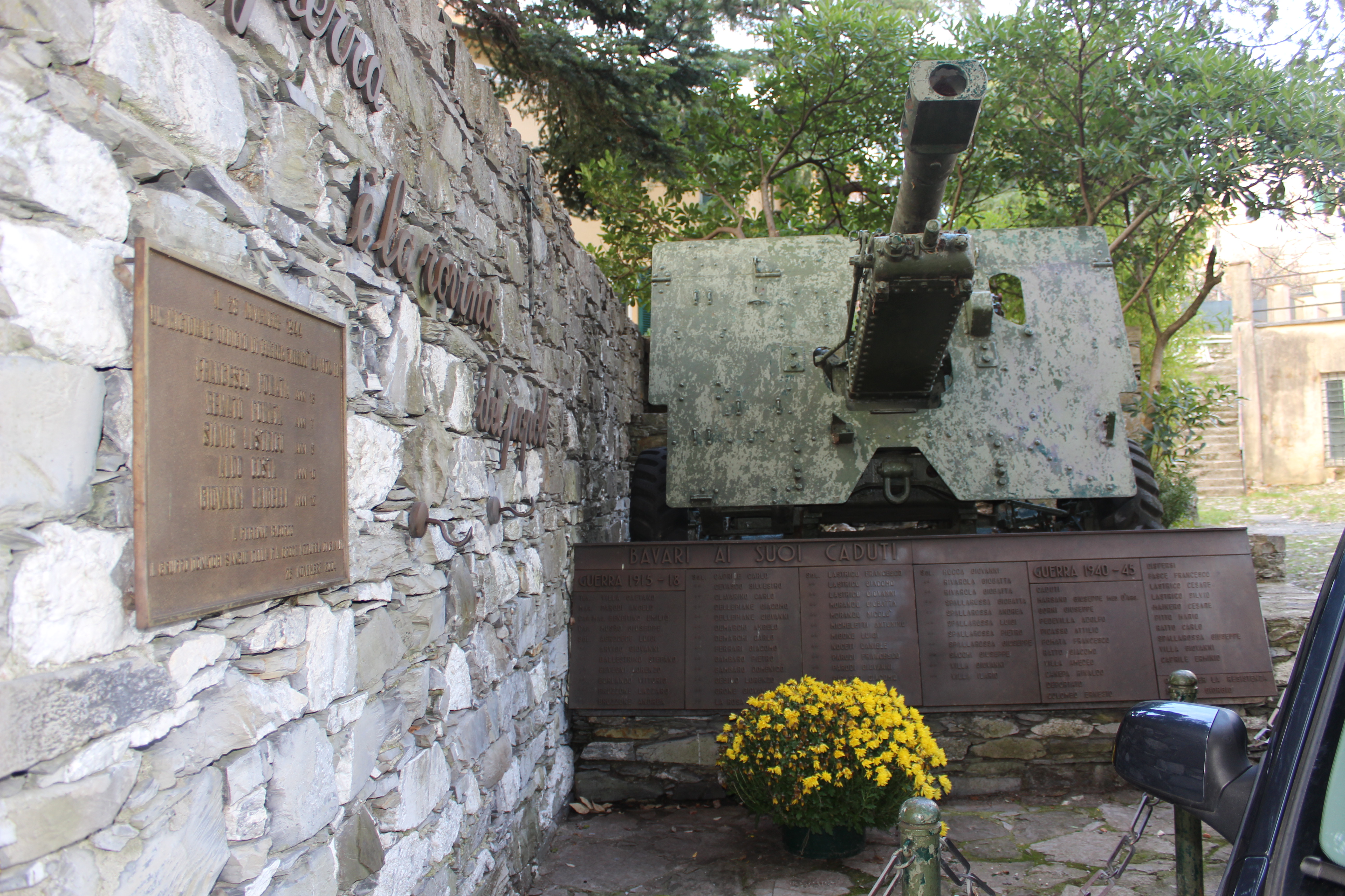 Complesso commemorativo con un grande cannone su ruote posto davanti a un muro in pietra. Alla base del pezzo d’artiglieria corre una lunga lastra metallica con iscrizioni incise; altre targhe bronzee sono fissate al muro, insieme a lettere metalliche applicate.