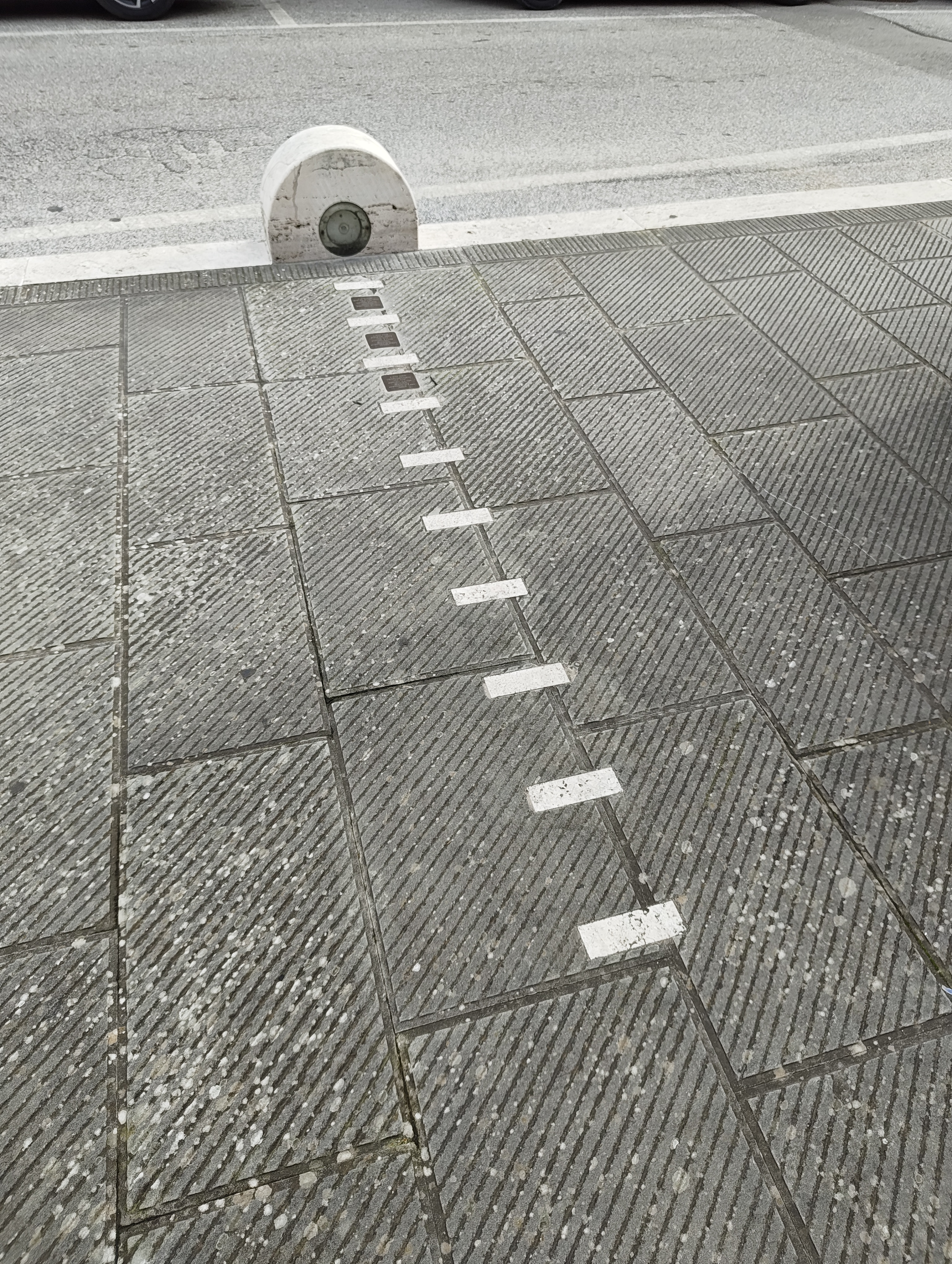Una serie di piccole piastre quadrate in metallo scuro è incassata nel marciapiede in pietra, disposto a lastre con rigature diagonali. Le piastre sono allineate in sequenza e intervallate da tasselli rettangolari chiari, formando strisce che attraversano la pavimentazione fino al bordo strada. Accanto si trovano grandi sedute semicircolari in pietra chiara e colonnine paracarro arrotondate.