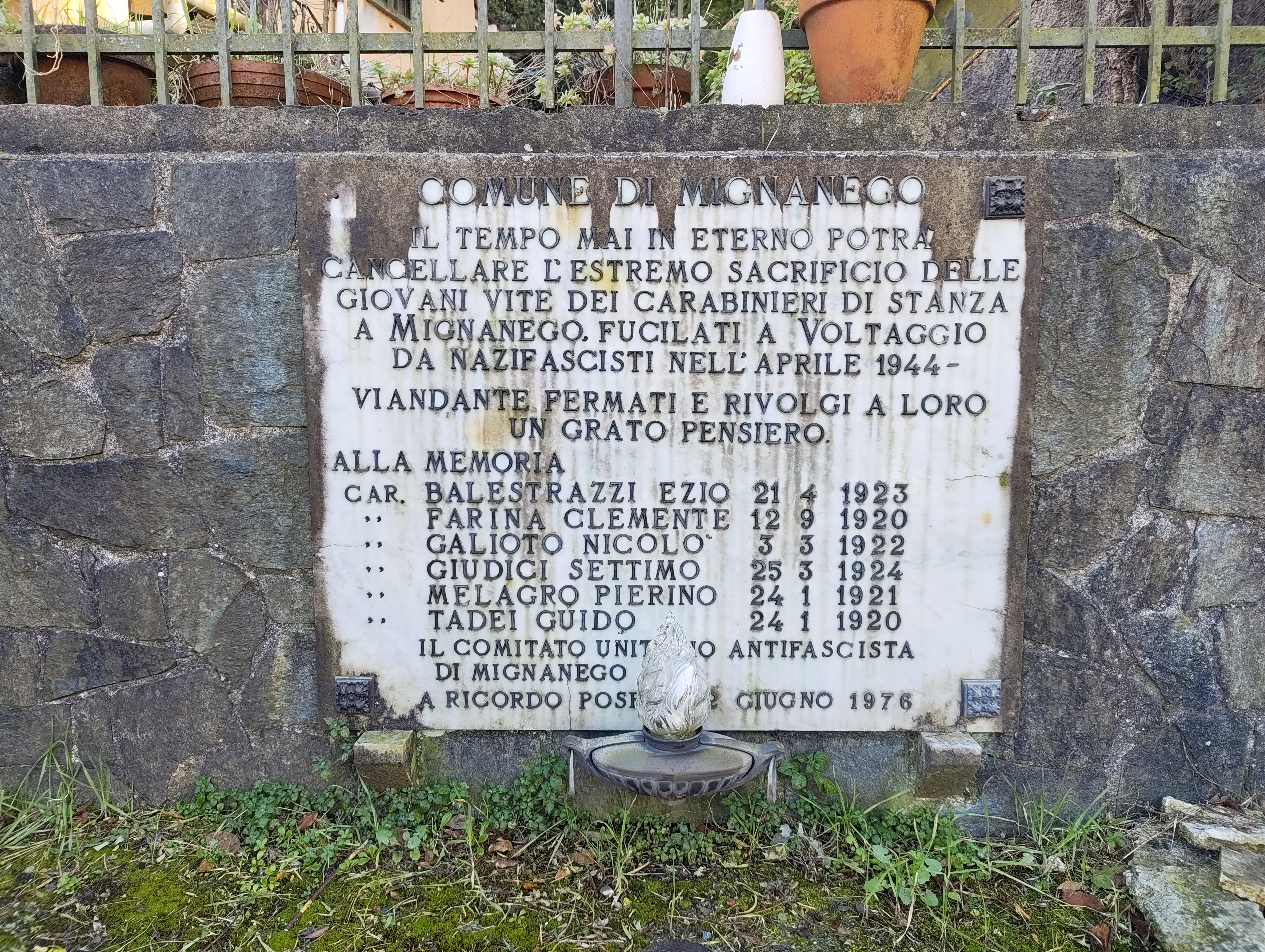 Lapide a Bagnasco e ai Repetto Voltaggio (AL) Campo della Gloria Alessandria (AL) Monumento ai Martiri di Voltaggio Voltaggio (AL) Lapide ai caduti per la Libertà di Sampierdarena Genova (GE) Lapide ai caduti per la Libertà di San Teodoro Genova (GE) Sacrario dei Partigiani di Sampierdarena Genova (GE) Targa a La Tana Genova (GE) Sacrario del Ponte Monumentale Genova (GE) Monumento ai caduti per la Libertà di Rivarolo Genova (GE) Lapide ai caduti di Pontedecimo Genova (GE)