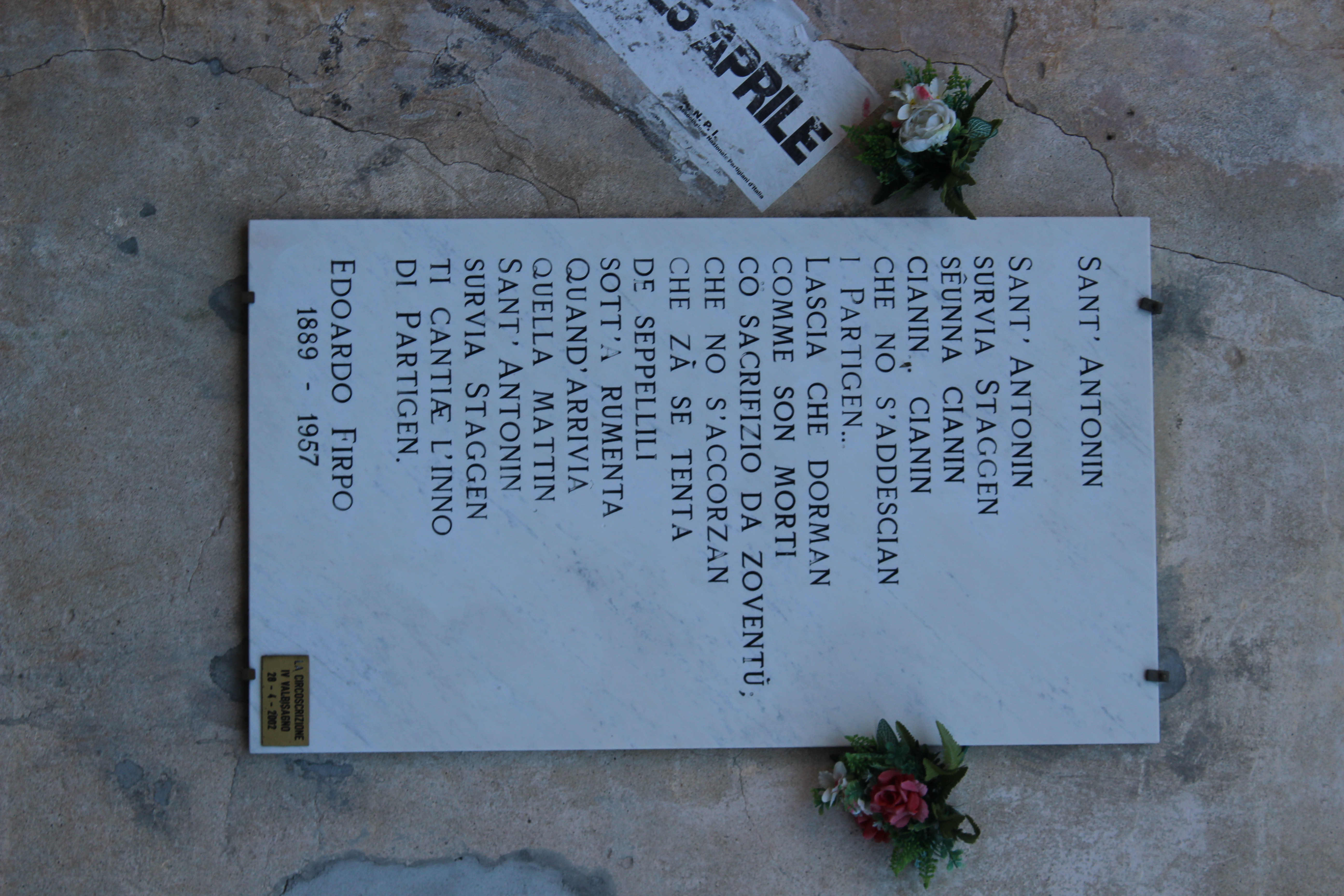sant’antonino sopra staglieno suona pianino pianino... pianino che non si sveglino i partigiani... lascia che dormano come son morti col sacrifcio della gioventù; che non s’accorgano che già si tenta di seppellirli sotto la spazzatura quando arriverà quella mattina sant’antonino sopra staglieno, tu canterai l’inno dei partigiani. edoardo firpo 1889-1957