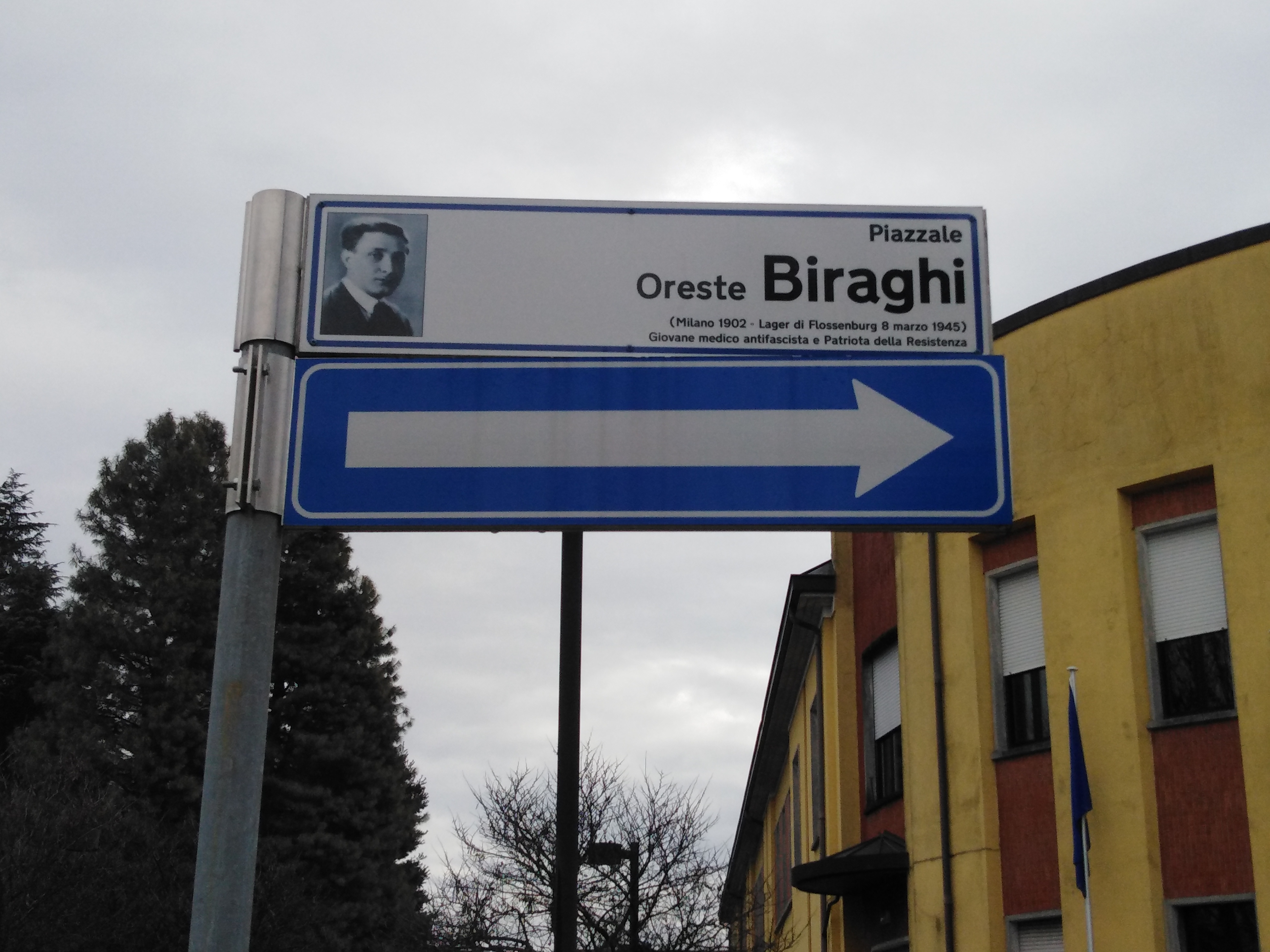 Cartello stradale con foto e dati di nascita e morte del Partigiano, indicando professione e impegno politico.