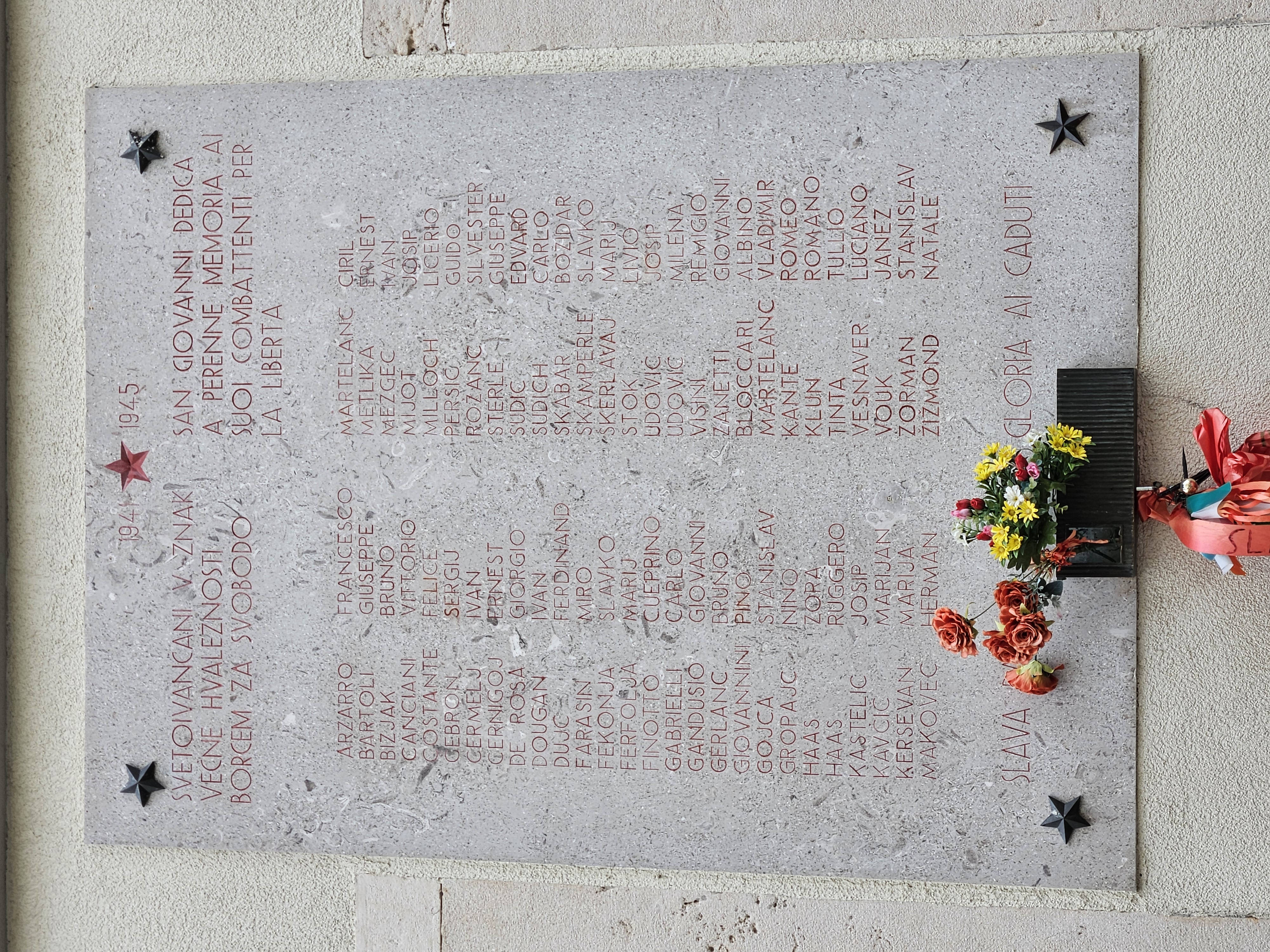 Targa alla sede del comando Polizia-SS 2.4Km — Trieste (TS) Lapide ai Martiri di via Ghega 2.5Km — Trieste (TS) Lapide al rogo del Narodni Dom 2.5Km — Trieste (TS) Pietre d'inciampo ai Cesana 2.5Km — Trieste (TS) Pietra d'inciampo ad Haffner 2.5Km — Trieste (TS) Pietra d'inciampo a Spagnul 2.6Km — Trieste (TS) Pietre d'inciampo ai Finzi 2.7Km — Trieste (TS) Sacrario dei caduti per la Libertà 2.9Km — Trieste (TS) Monumento ai cantierini Caduti nella guerra di Liberazione 26.3Km — Monfalcone (GO) Lapide ai Caduti della guerra di Liberazione 27.3Km — Monfalcone (GO)