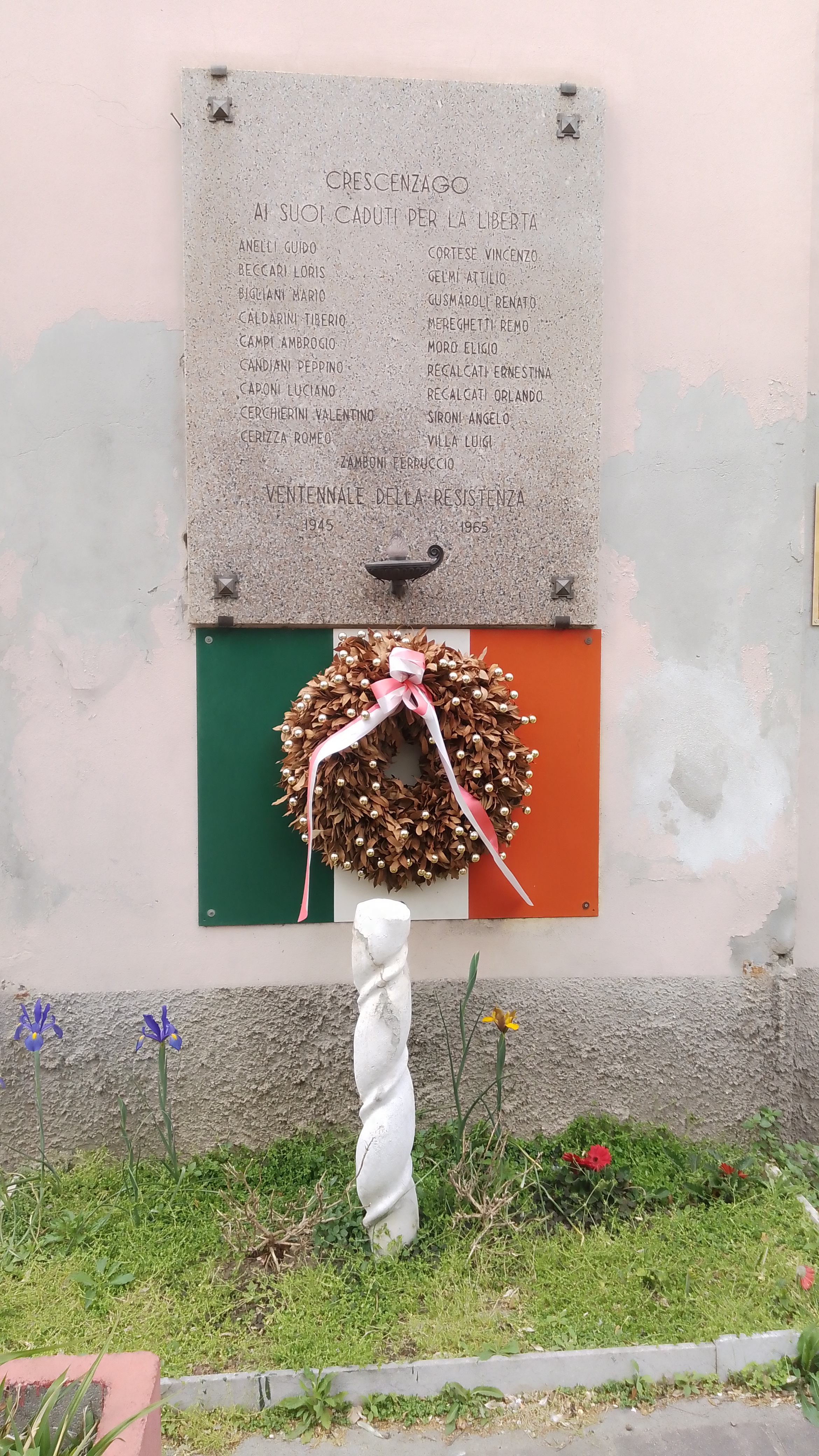 crescenzago ai suoi caduti per la libertà ANELLI GUIDO BECCARI LORIS BIGLIANI MARIO CALDARINI TIBERIO CAMPI AMBROGIO CANDIANI PEPPINO CAPONI LUCIANO CERCHERINI VALENTINO CERIZZA ROMEO CORTESE VINCENZO GELMI ATTILIO GUSMAROLI RENATO MEREGHETTI REMO MORO ELIGIO RECALCATI ERNESTINA RECALCATI ORLANDO SIRONI ANGELO VILLA LUIGI ZAMBONI FERRUCCIO ventennale della resistenza 1945 1965