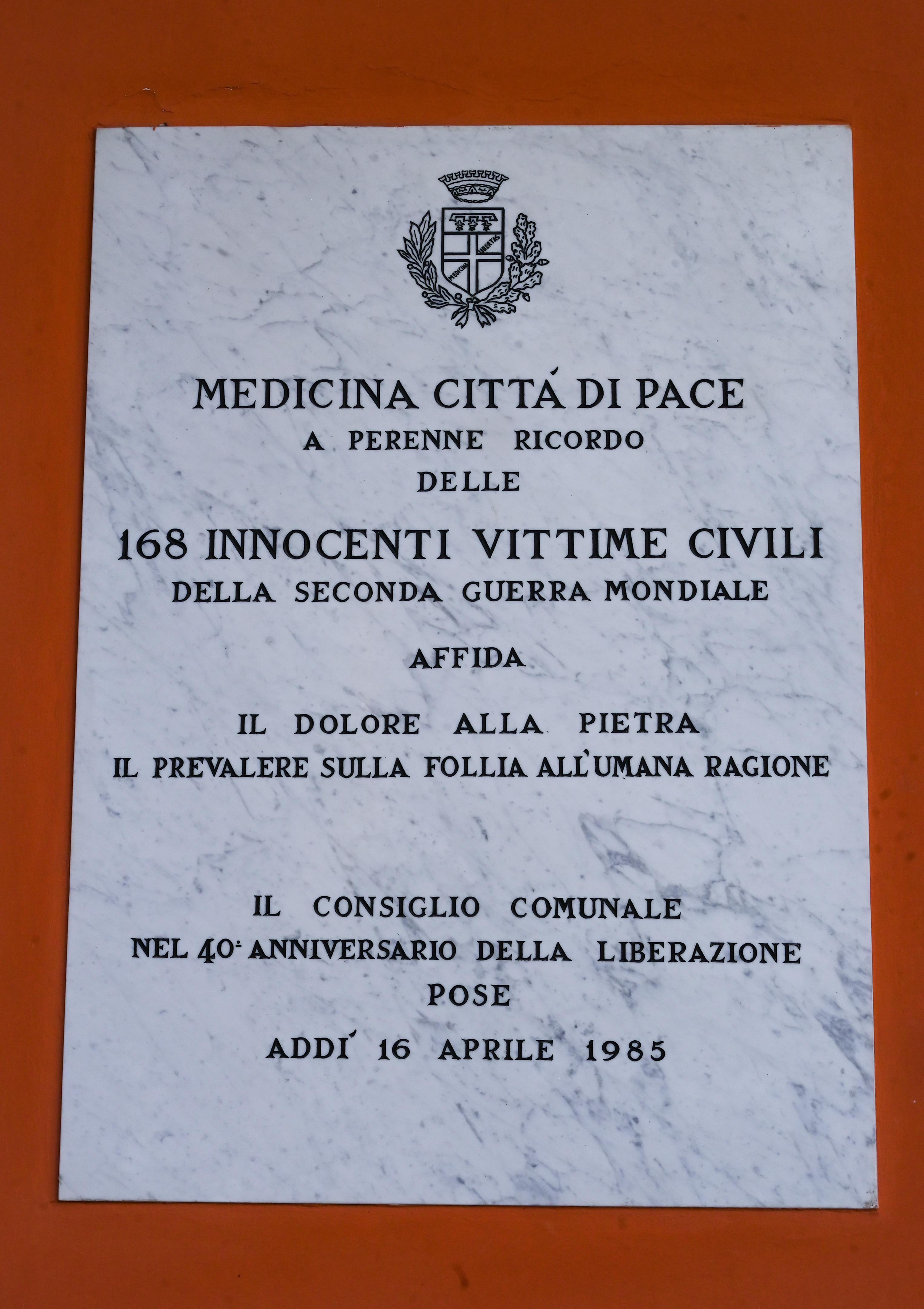 medicina città di pace a perenne ricordo delle 168 innocenti vittime civili della seconda guerra mondiale affida il dolore alla pietra il prevalere sulla follia all'umana ragione il consiglio comunale nel 40° anniversario della liberazione pose addì 16 aprile 1985