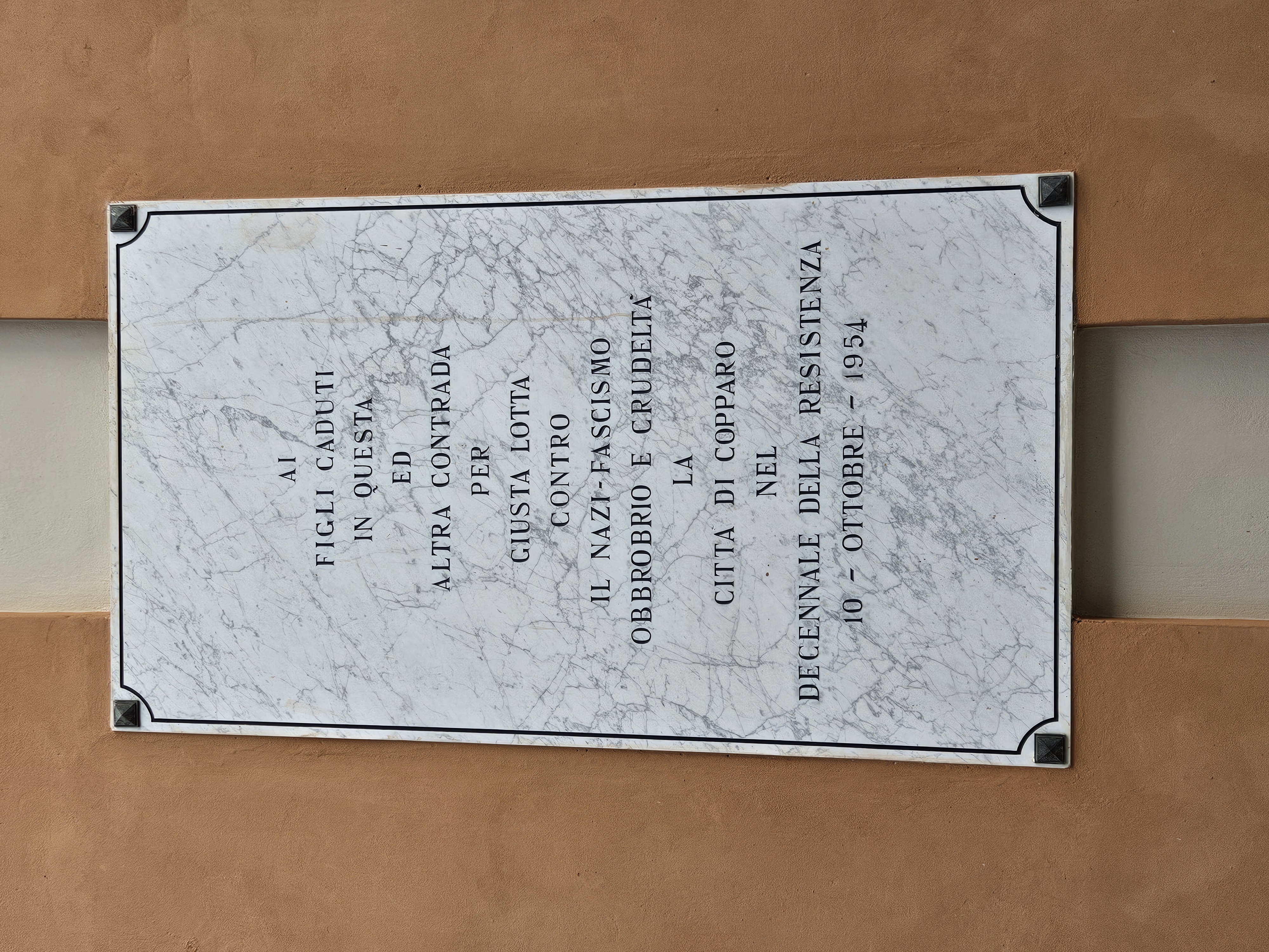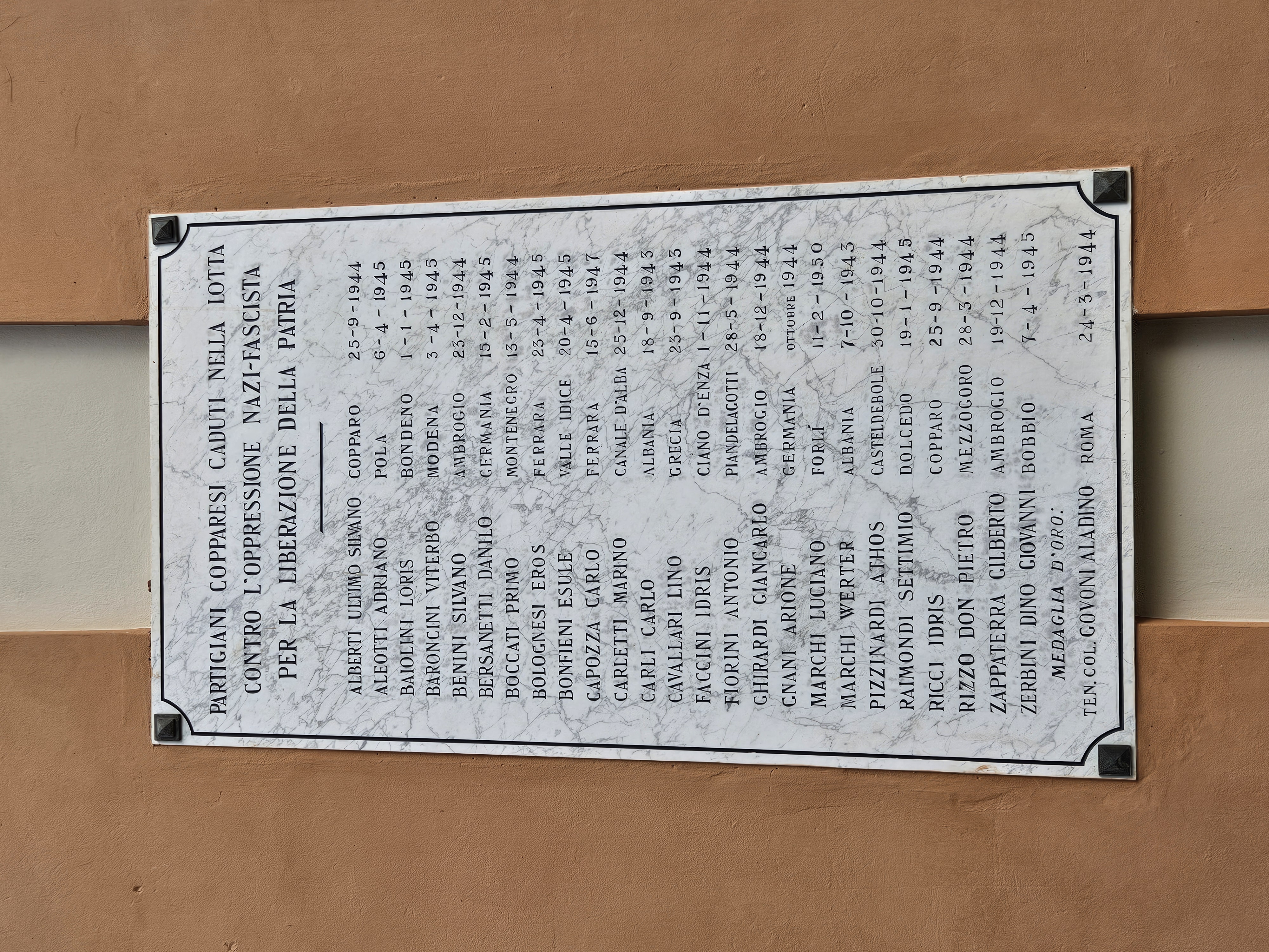 Fontana Monumentale 65m — Copparo (FE) Lapide a Costa 90m — Copparo (FE) Lapide alle vittime del bombardamento del 30 gennaio 1945 210m — Copparo (FE) Lapide a Zerbini, Mazzanti e Donati 560m — Copparo (FE) Cippo a Ricci e Alberti 720m — Copparo (FE) Monumento alla Resistenza 730m — Copparo (FE) Lapide ai Caduti di Gradizza nella guerra 1940-1945 2.6Km — Copparo (FE) Lapide ai Caduti di Cesta 4Km — Copparo (FE) Monumento ai Caduti di Saletta 4.4Km — Copparo (FE) Lapidi ai Caduti di Tamara 4.7Km — Copparo (FE)
