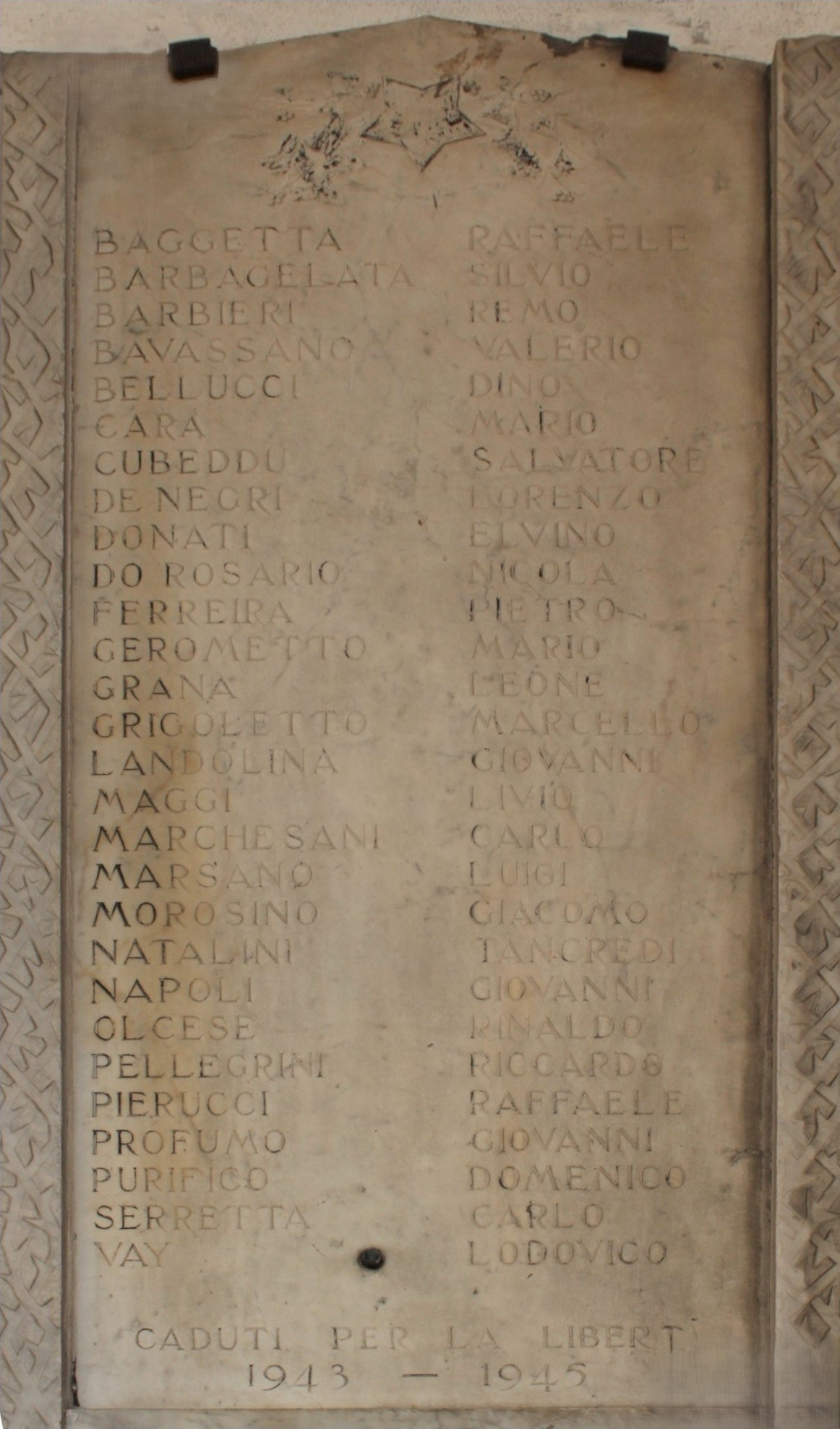Lastra rettangolare in pietra chiara, affissa a una parete, con superficie levigata e lunghi elenchi di nomi incisi in tre colonne. In alto è presente un piccolo rilievo centrale con rami e stella stilizzati; ai lati corre una cornice scolpita con motivi geometrici ripetuti. Le incisioni sono in lettere maiuscole uniformi, scurite per maggiore leggibilità. Staffe metalliche fissano la lastra.