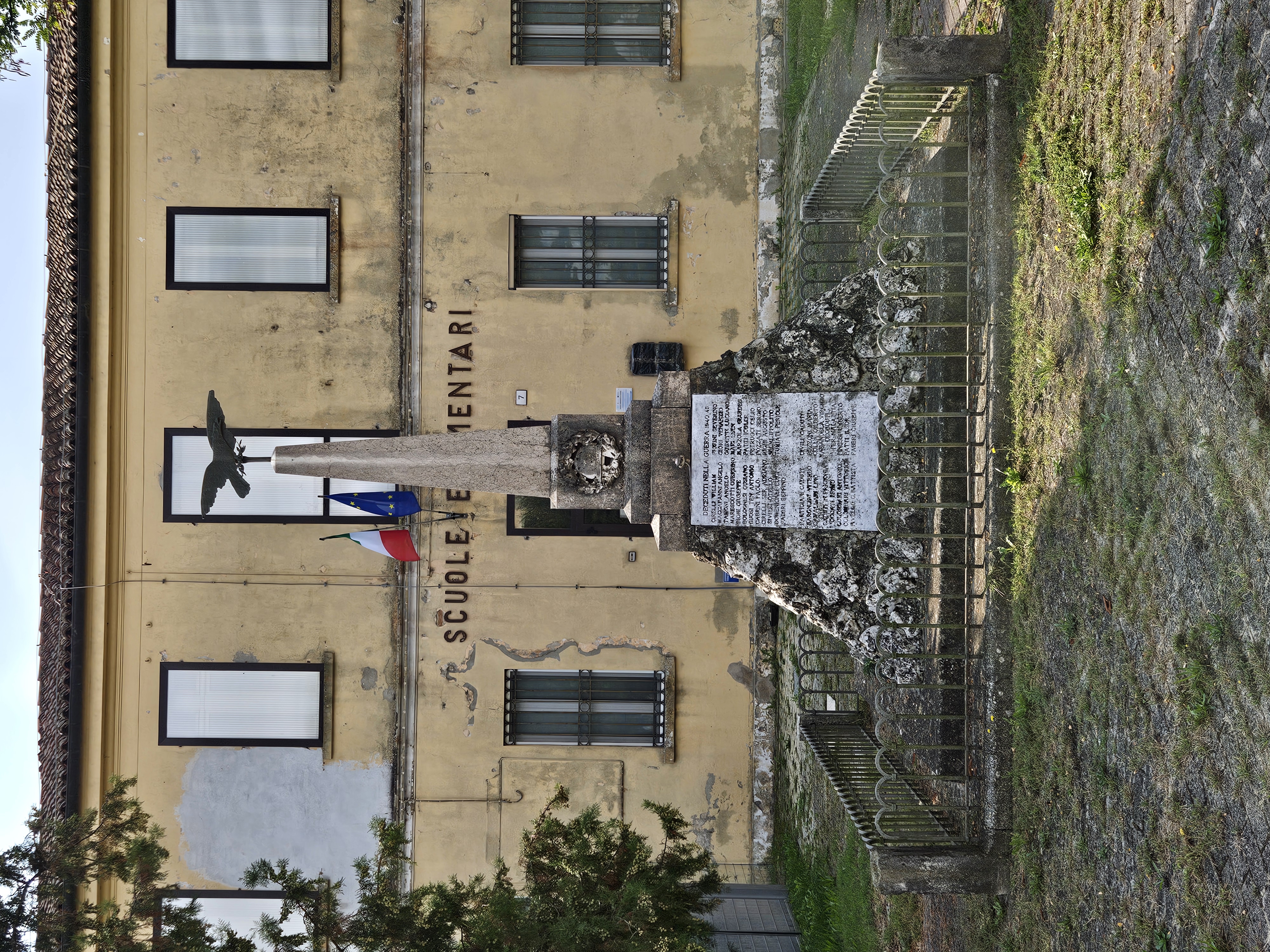 Struttura monumentale con obelisco in pietra chiara su una base tronco-piramidale di massi irregolari; in sommità una scultura metallica di uccello ad ali spiegate. Sulla fronte, una grande lapide rettangolare in marmo con numerosi nomi incisi e, più in alto, una corona d’alloro in rilievo. Il complesso è delimitato da una bassa recinzione metallica. Si trova su uno spiazzo erboso davanti a un edificio scolastico.