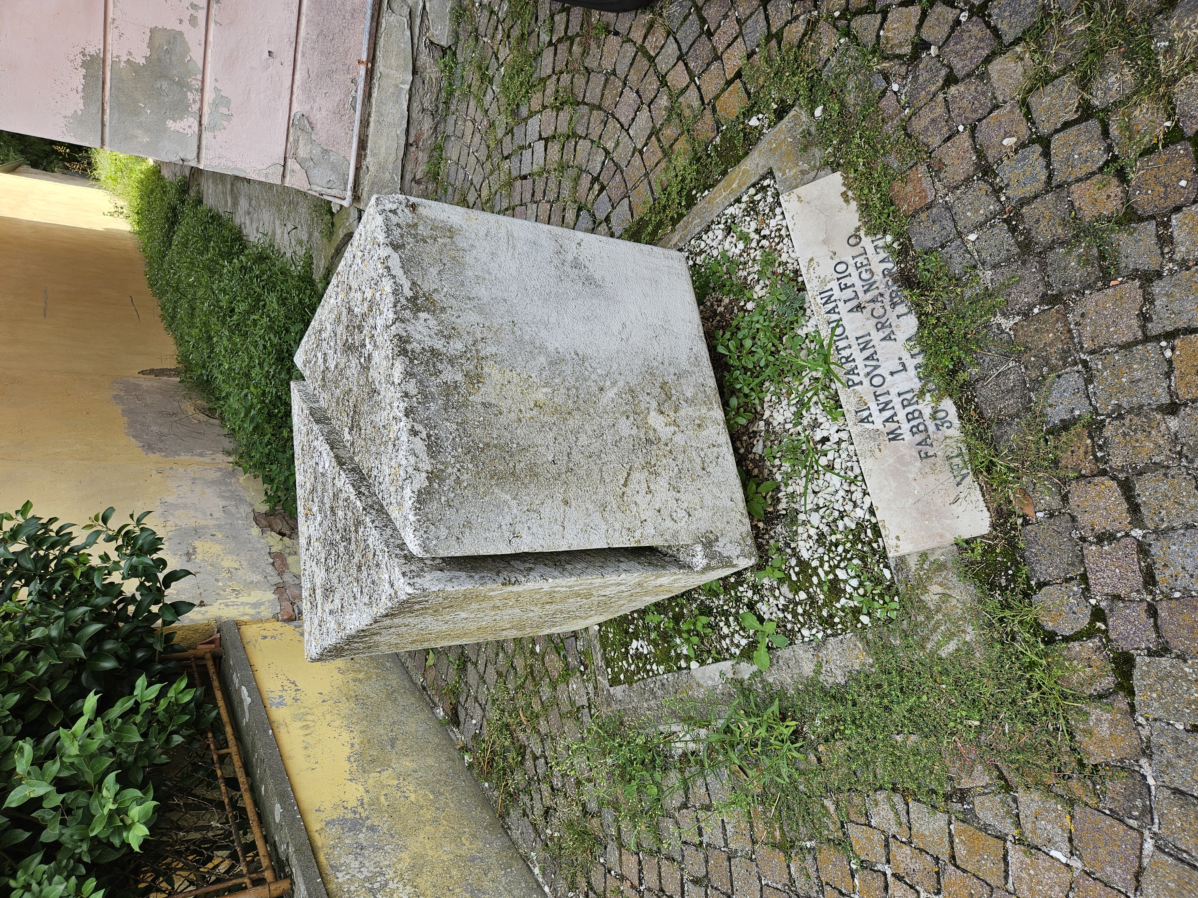 Piccolo monumento costituito da un blocco cubico in pietra chiara, segnato da una profonda incisione diagonale; la materia appare grezza e segnata dalle intemperie. Il cubo poggia su una base quadrata ribassata con bordi in cemento, riempita di ghiaia bianca e vegetazione spontanea. Sul fronte della base è fissata una lastra marmorea con iscrizione incisa. Collocato su pavimentazione in sampietrini.