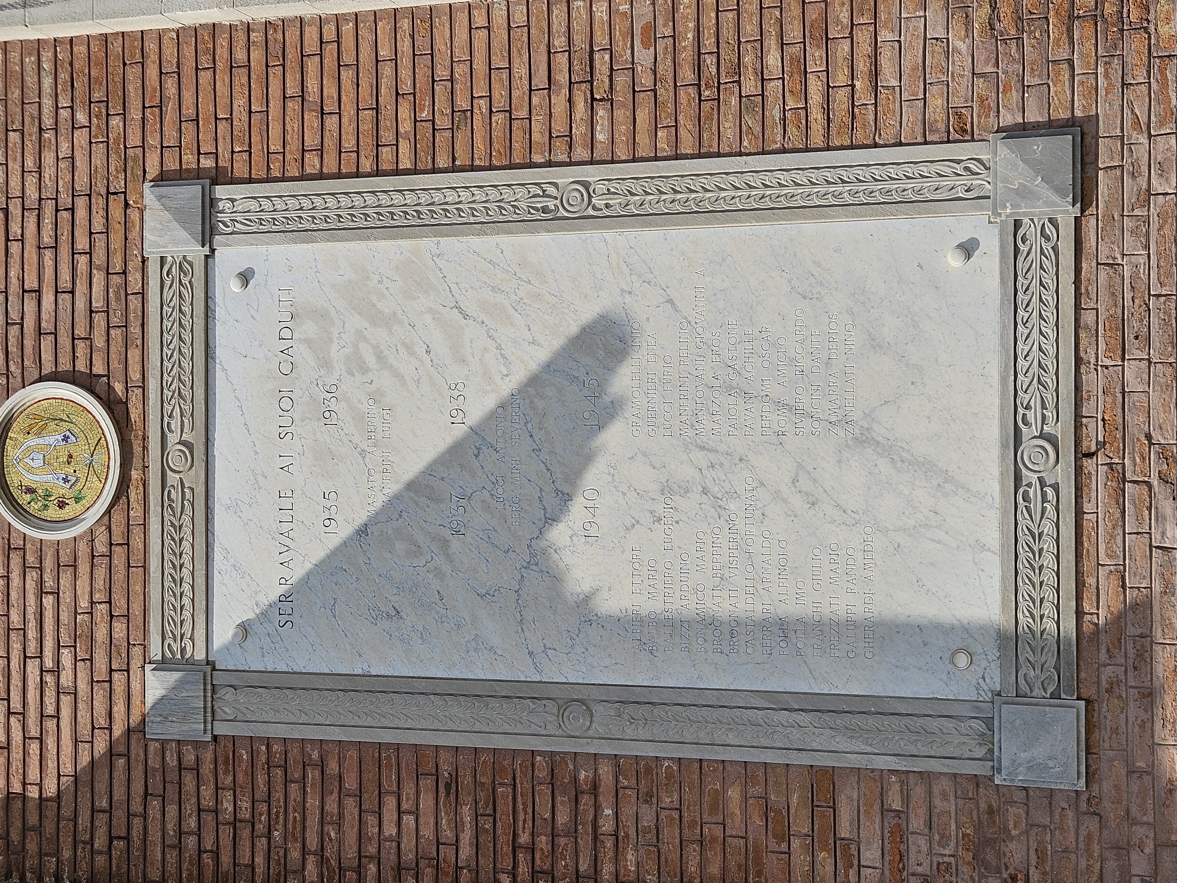 Grande lapide rettangolare in marmo chiaro, con venature leggere, fissata a una parete esterna in mattoni. Il bordo è scolpito con motivo intrecciato e rosette agli angoli, rinforzati da placche squadrate. L’iscrizione è incisa e organizzata con un titolo centrale, date e più colonne di nomi. In alto, un medaglione circolare policromo a mosaico.