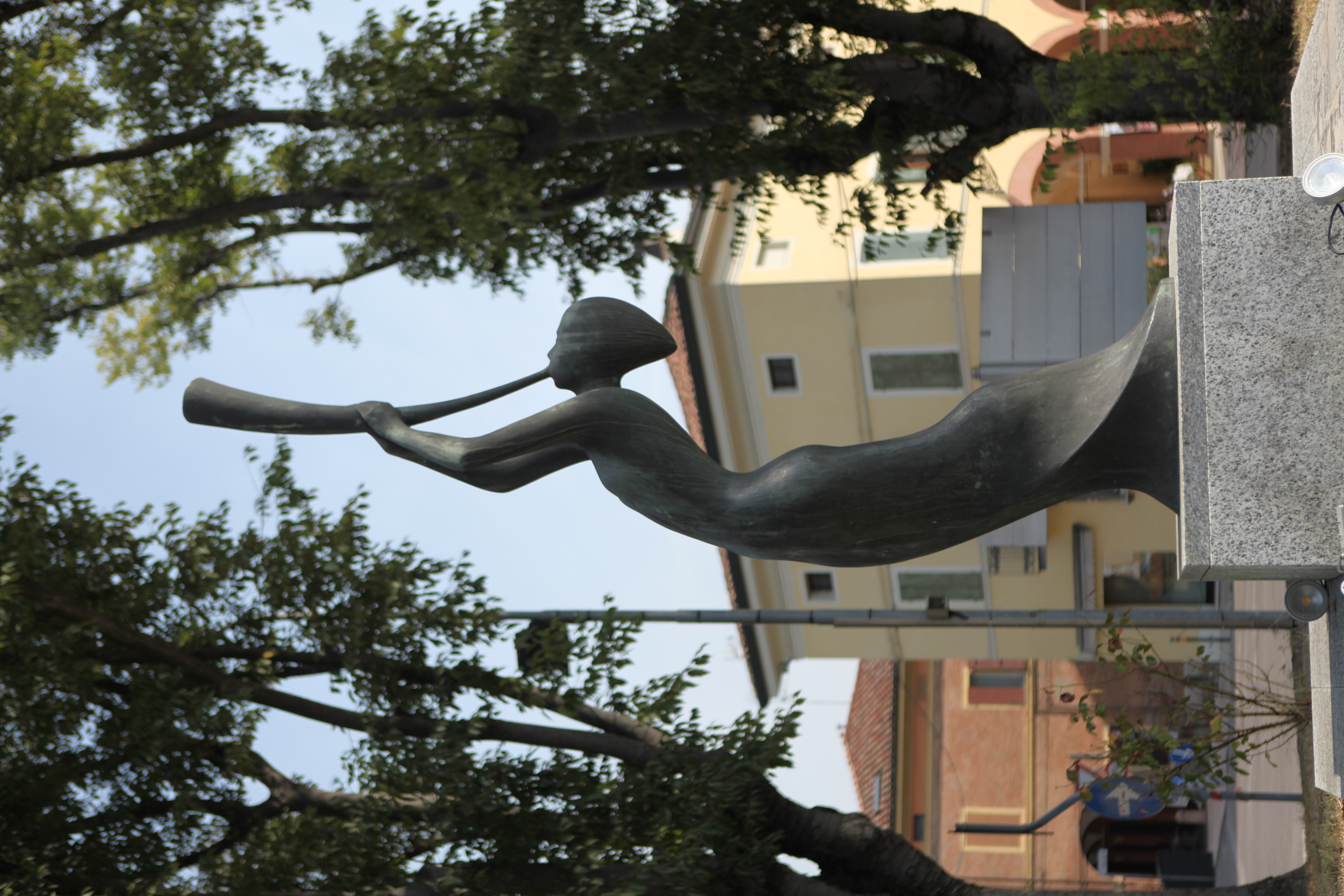 Scultura figurativa slanciata in metallo scuro, raffigura una figura umana stilizzata in equilibrio all’indietro che porta alle labbra un lungo strumento tubolare, con superfici lisce e profilo sinuoso. È posta su un basamento rettangolare in granito grigio puntinato. Alla base, su una lastra dello stesso materiale, sono appoggiati riproduzioni di fogli con fotografie in bianco e nero, un documento dattiloscritto e una mappa.