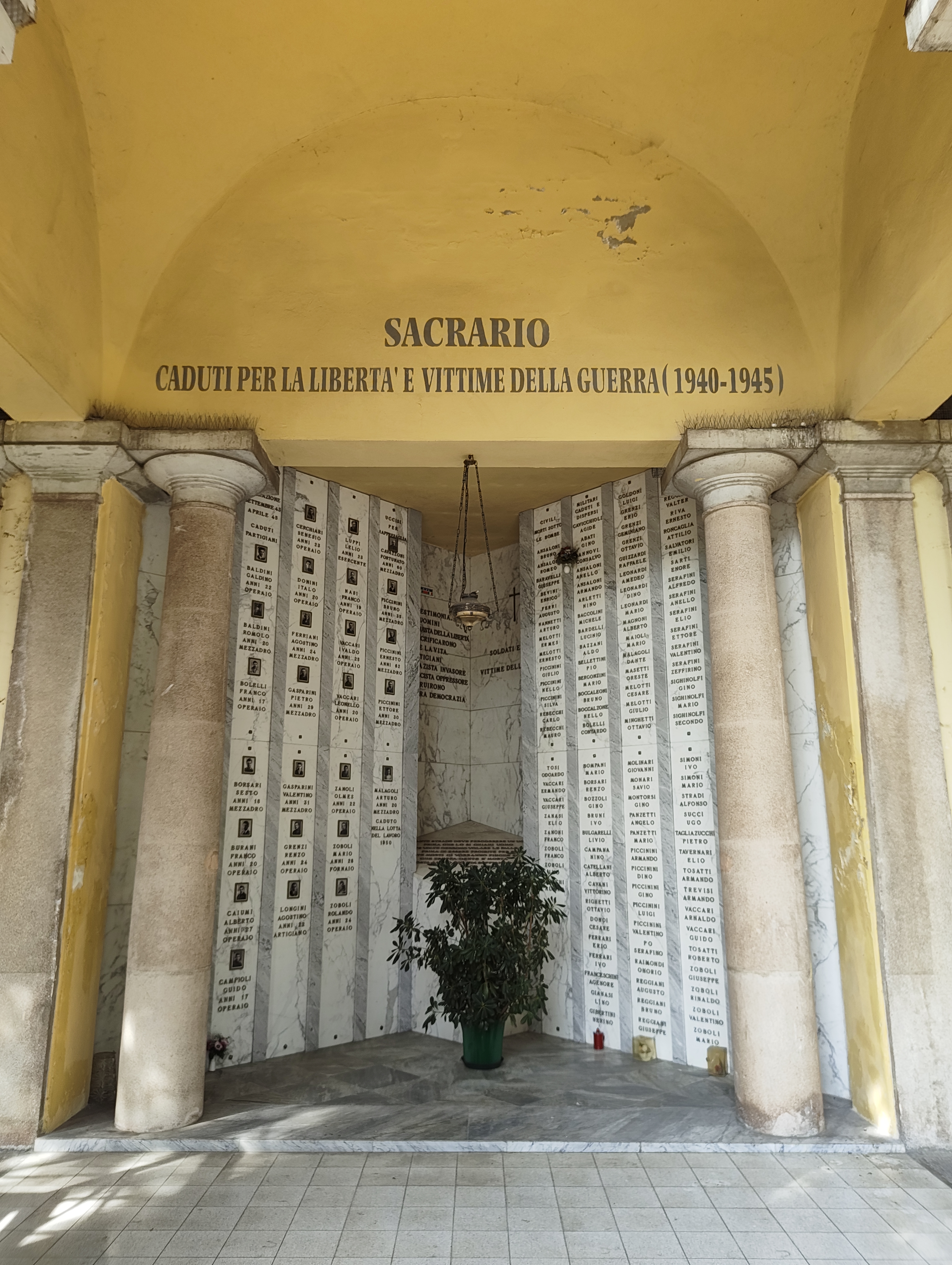 Struttura commemorativa inserita in un portico con frontone triangolare e grande arco d’ingresso, sorretto da colonne lisce in pietra. All’interno, pareti rivestite di marmo bianco venato ospitano pannelli verticali con iscrizioni incise in caratteri scuri e piccoli ritratti, disposti a ventaglio in un’abside angolare. Il soffitto e le pareti sono intonacati in giallo, con lampade sospese. Sono presenti piante in vaso e alcune candele alla base. L’insieme si trova in un cimitero, con area alberata e pavimento ghiaioso.