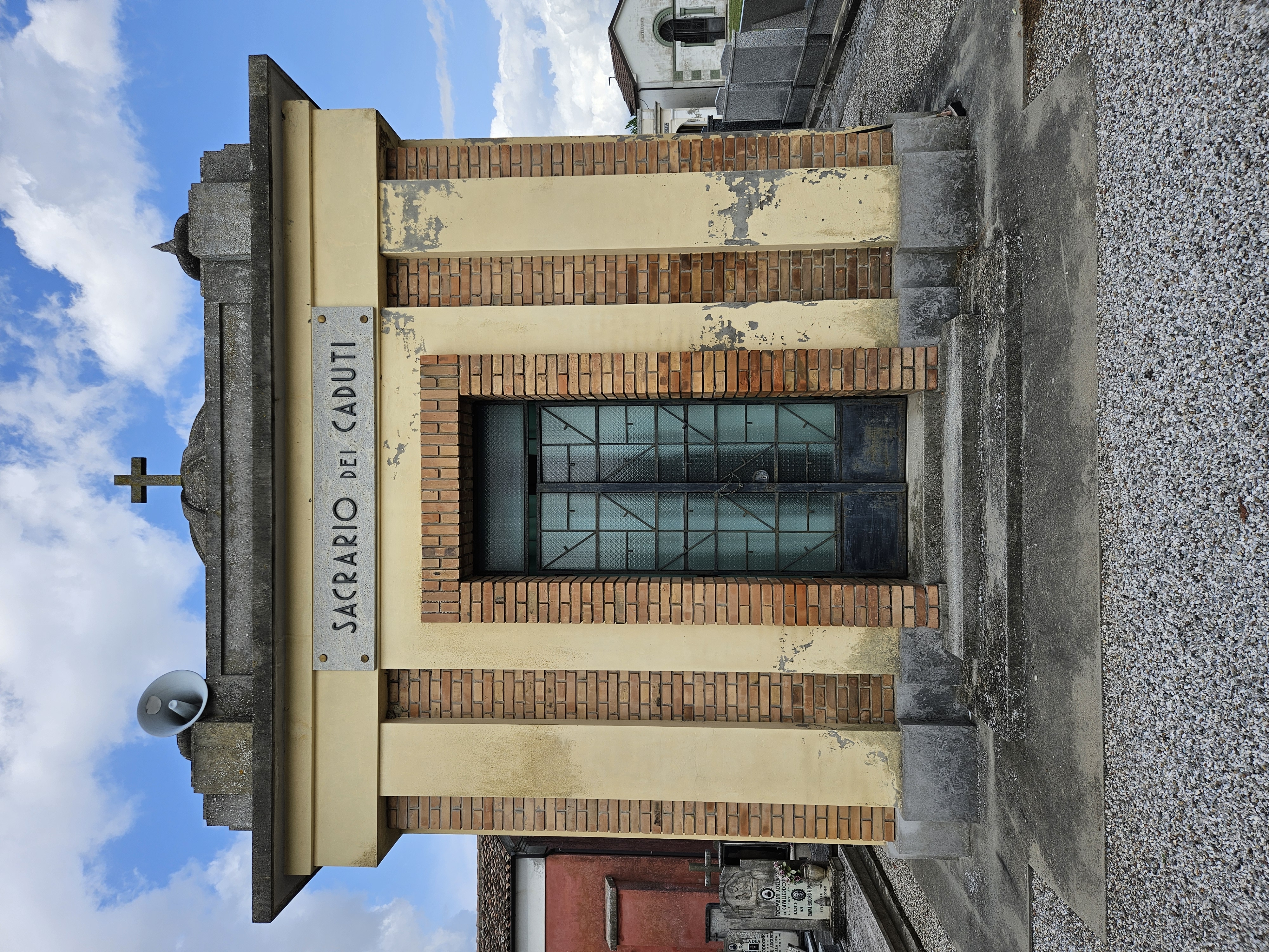 Piccolo edificio in muratura con facciata simmetrica: pilastri in mattoni a vista, superfici intonacate color crema e zoccolo in cemento. Portale centrale con doppia porta metallica vetrata a disegni geometrici, sormontata da un pannello con iscrizione incisa; in sommità cornicione, croce e altoparlante. All’interno, pareti rivestite in lastre di marmo chiaro con fotografie ovali, iscrizioni incise e portafiori metallici con composizioni floreali; ambiente collocato in un cimitero con camminamenti in ghiaia.