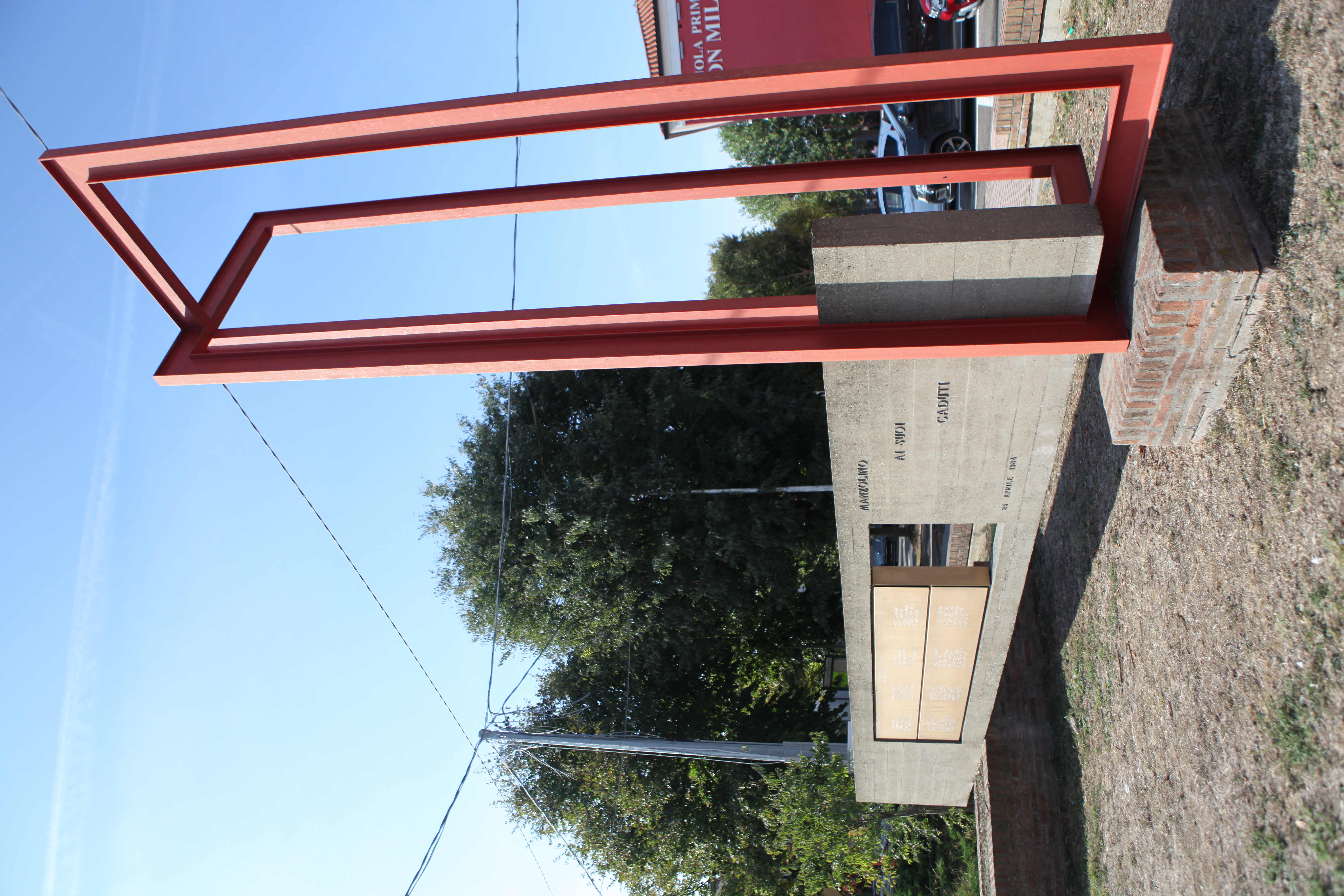 Struttura composta da un lungo elemento orizzontale in calcestruzzo grezzo, sostenuto da due supporti bassi, con al centro una placca metallica color bronzo suddivisa in pannelli con numerosi nomi incisi e un piccolo emblema policromo. Accanto, svetta una doppia cornice rettangolare in metallo verniciato rosso arancio, disposta verticalmente. Il complesso è collocato in una piccola area urbana delimitata da un basso bordo in mattoni, allestita in una piazza.