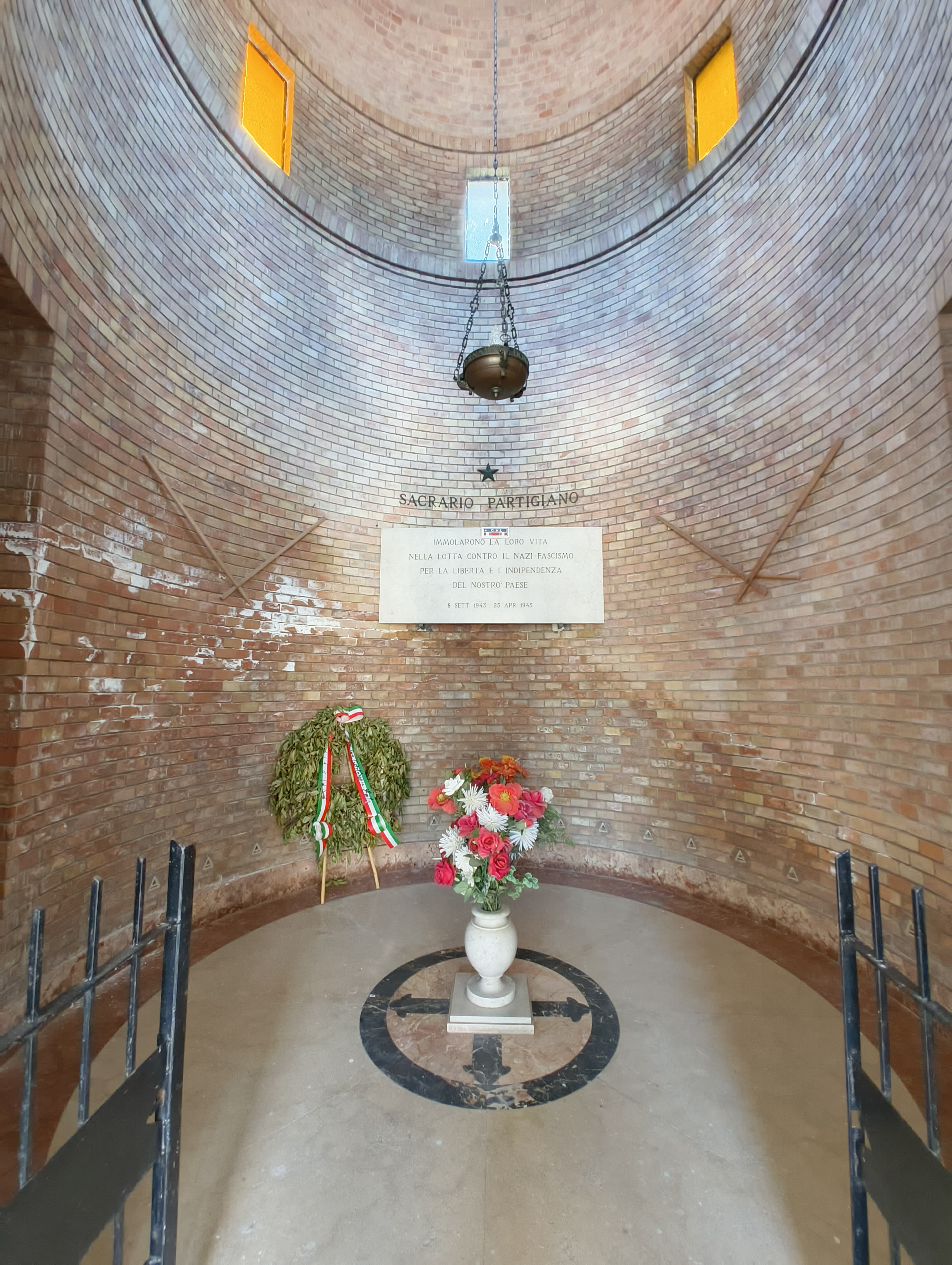 Memoriale collocato all’interno di una piccola struttura circolare in mattoni a vista, con volta alta e lampada pensile centrale. Sulle pareti esterne compaiono grandi lastre marmoree chiare con venature, stelle decorative e ovali con ritratti, oltre a un blocco lapideo centrale con iscrizioni. Ai lati si vedono nicchie funerarie con frontali in marmo incorniciati in pietra grigia e lettere nere.. Pavimento chiaro con inserti circolari scuri.