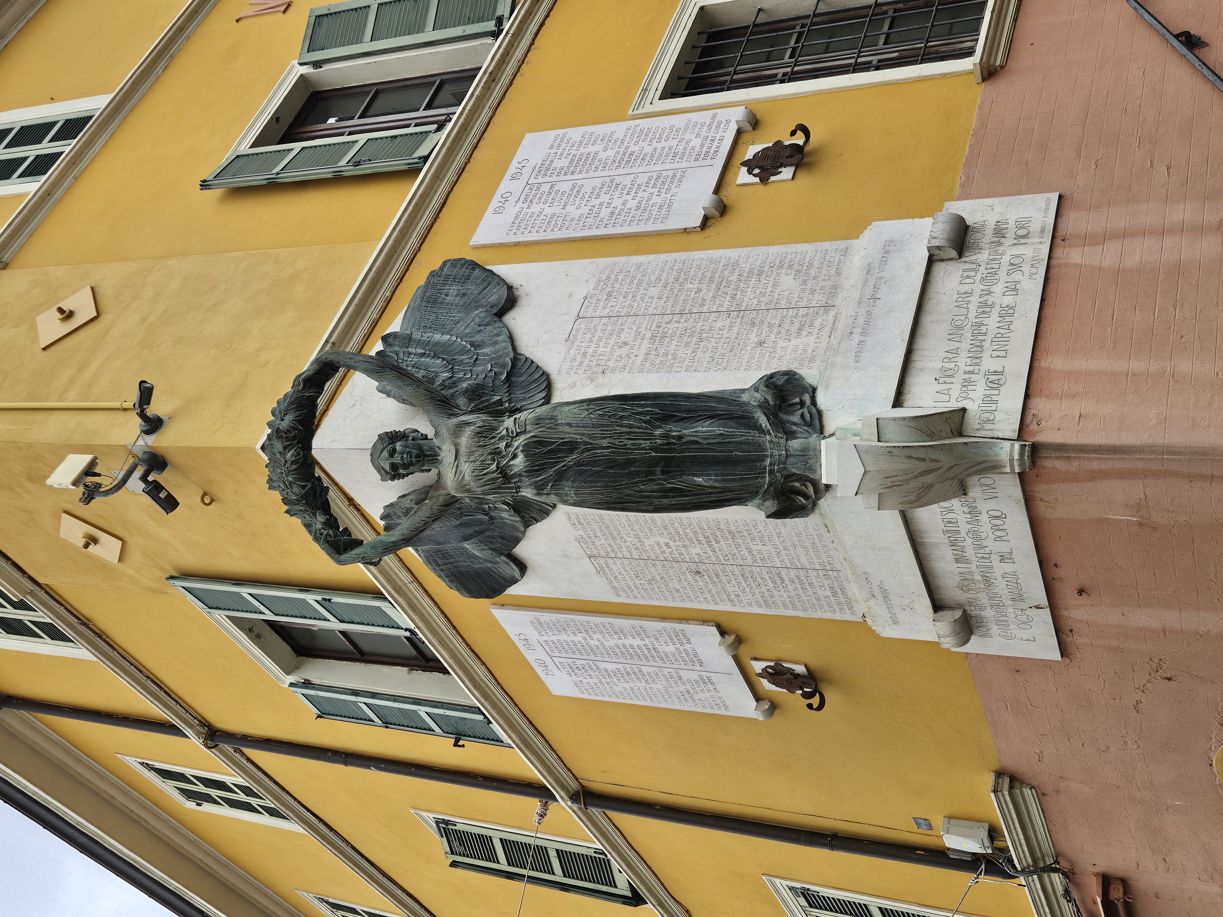 Su uno spigolo di un edificio, si sviluppa un insieme di lapidi: al centro un grande rilievo in bronzo raffigura una figura alata che innalza una corona d’alloro. Ai lati, ampie lastre rettangolari in pietra chiara riportano lunghi elenchi incisi in colonne; sotto ciascuna è applicato uno stemma metallico. Una base in pietra, anch’essa incisa, completa l’insieme.