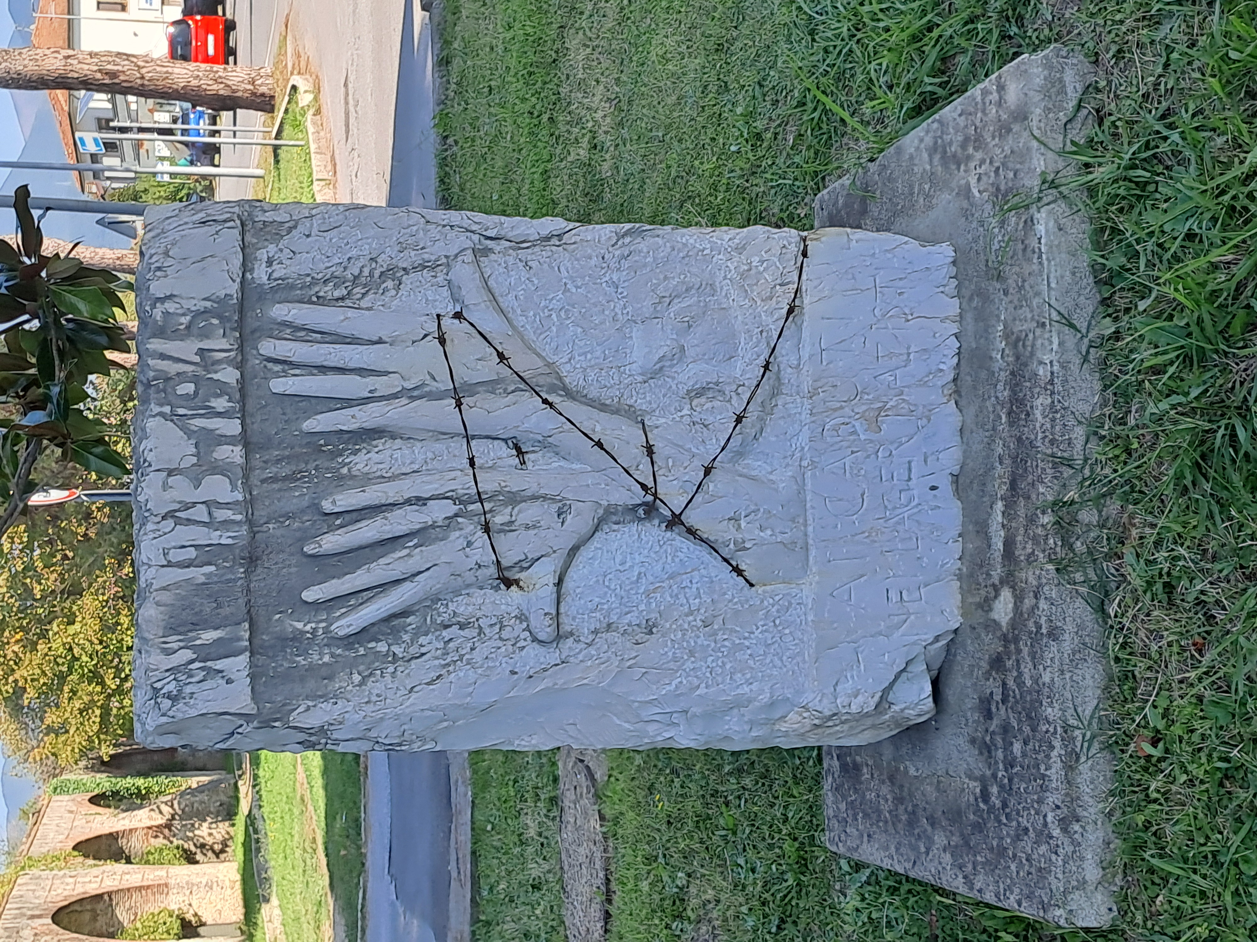 Composto da due stele in pietra su basamenti rettangolari, poste su un prato. La prima è una lastra grigio chiaro, liscia e verticale, con angoli fissati da piccoli elementi metallici e un’ampia iscrizione incisa. La seconda è un blocco più irregolare, in pietra bianca, con un bassorilievo che raffigura due mani aperte e linee diagonali incise, oltre a iscrizioni.