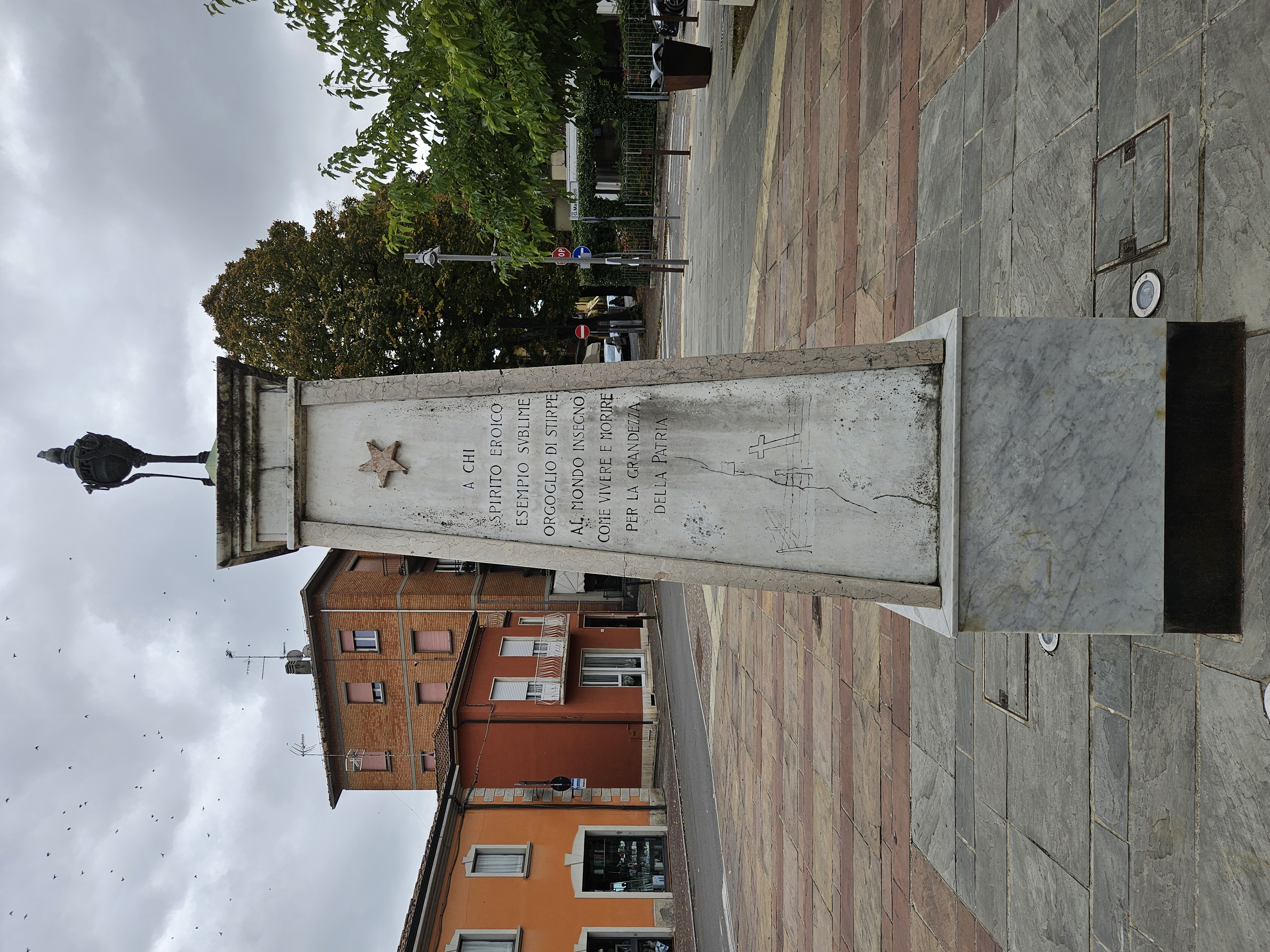 Stele a base quadrata in marmo chiaro, a tronco di piramide, su zoccolo in pietra grigia. Le quattro facce ospitano ampie iscrizioni incise, con una stella applicata in alto e, su un lato, piccoli ovali con ritratti. In sommità, sopra una cornice modanata, è posta un’urna metallica scura con fiamma. La superficie mostra venature e leggere tracce di usura. Collocata al centro di una piazza lastricata, tra alberi e basse edificazioni.