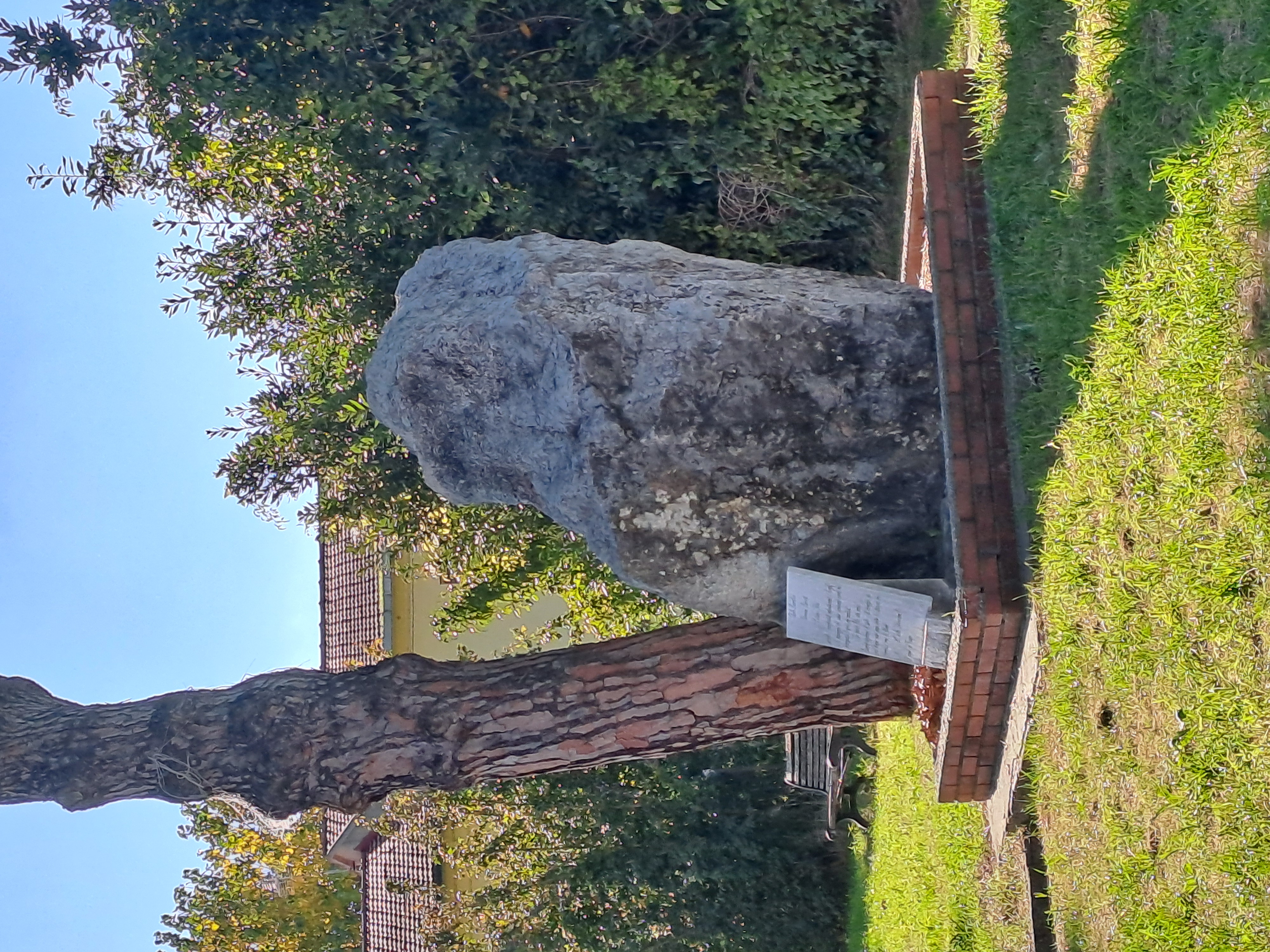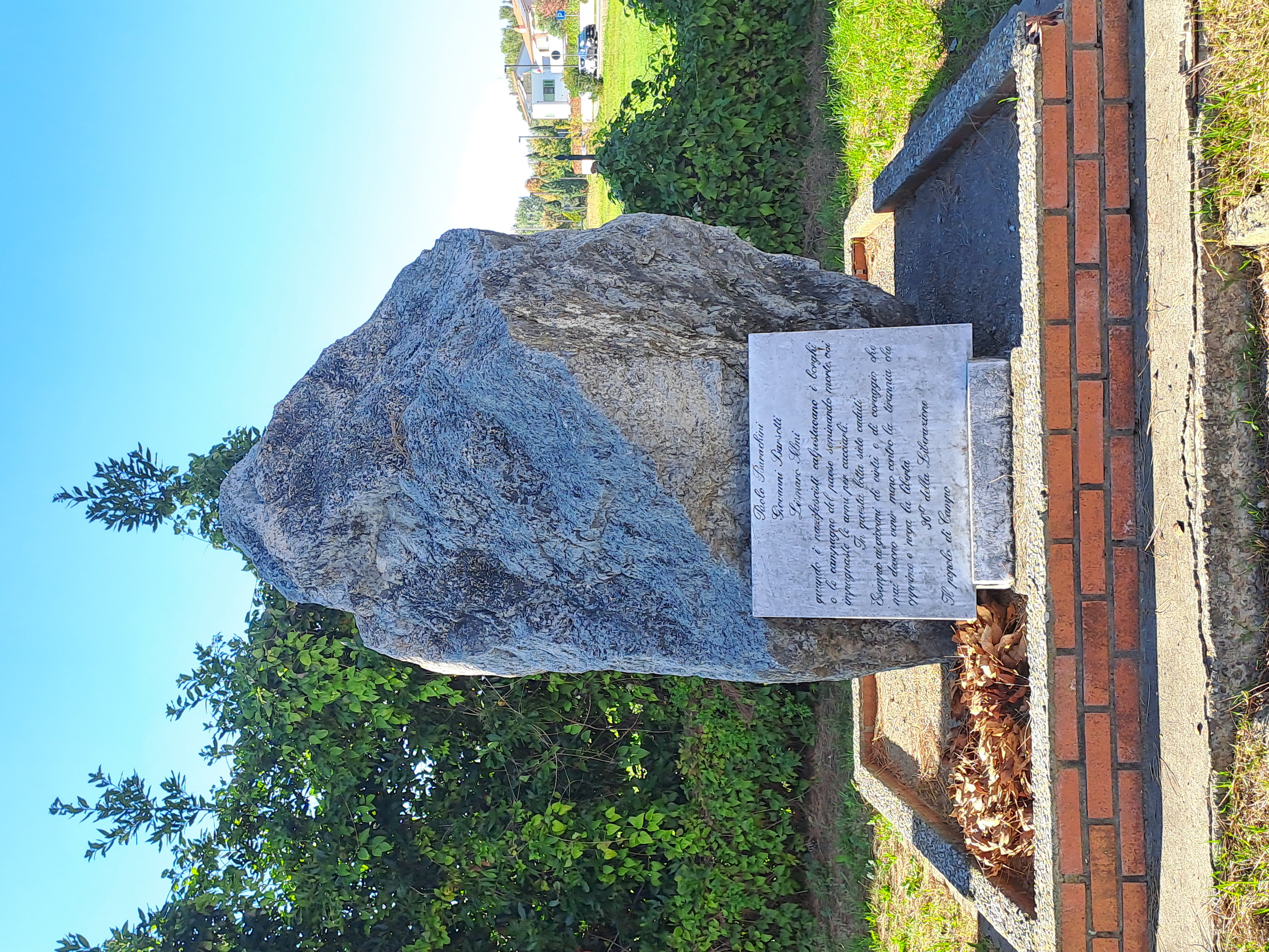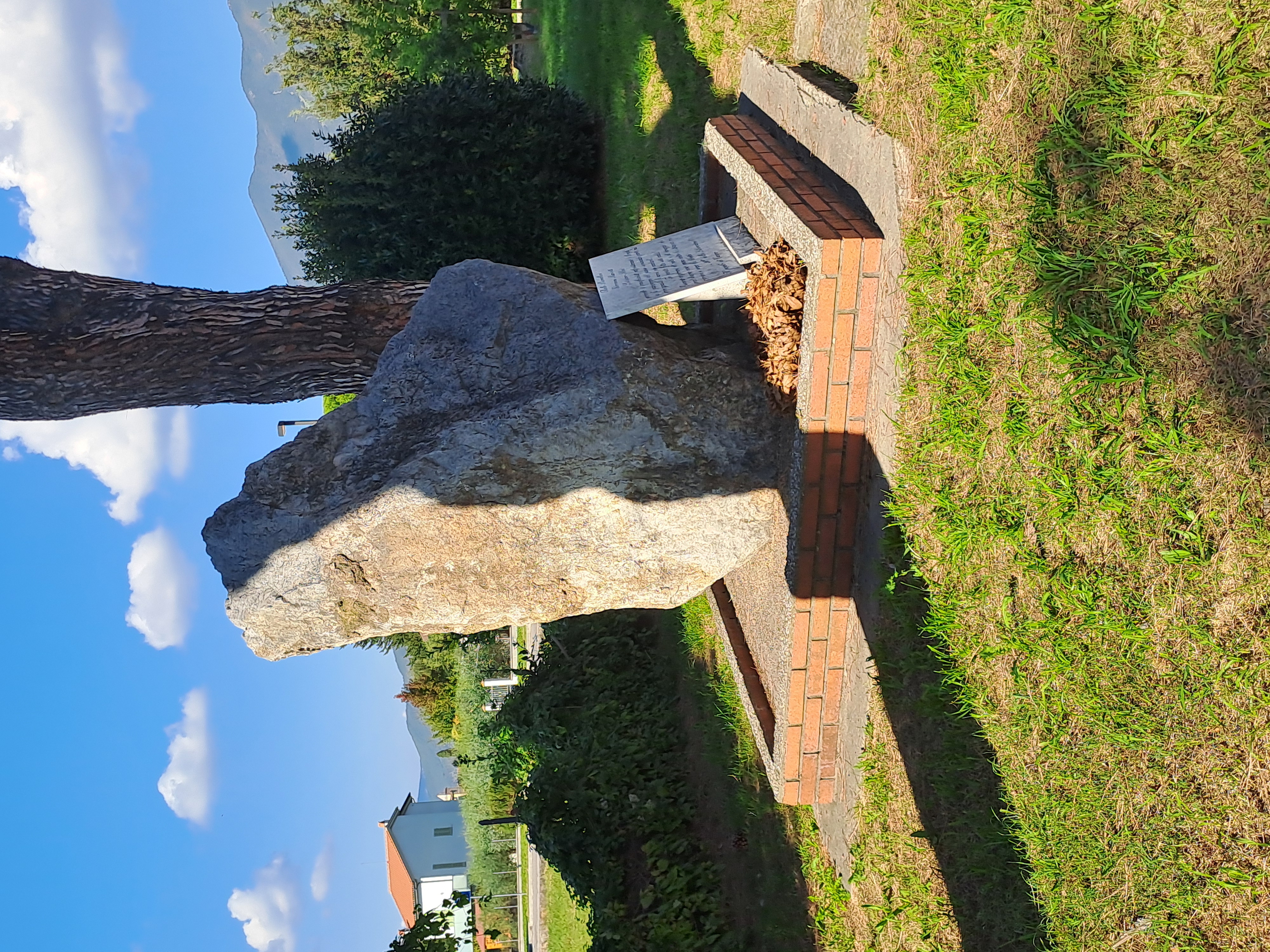 Grande masso irregolare in pietra grigia, dalla superficie ruvida e venata, accostato a un tronco d’albero e collocato su una piattaforma rettangolare pavimentata e delimitata da un basso cordolo in mattoni rossi. Davanti al masso è appoggiata una lastra rettangolare di pietra chiara con testo inciso in corsivo.