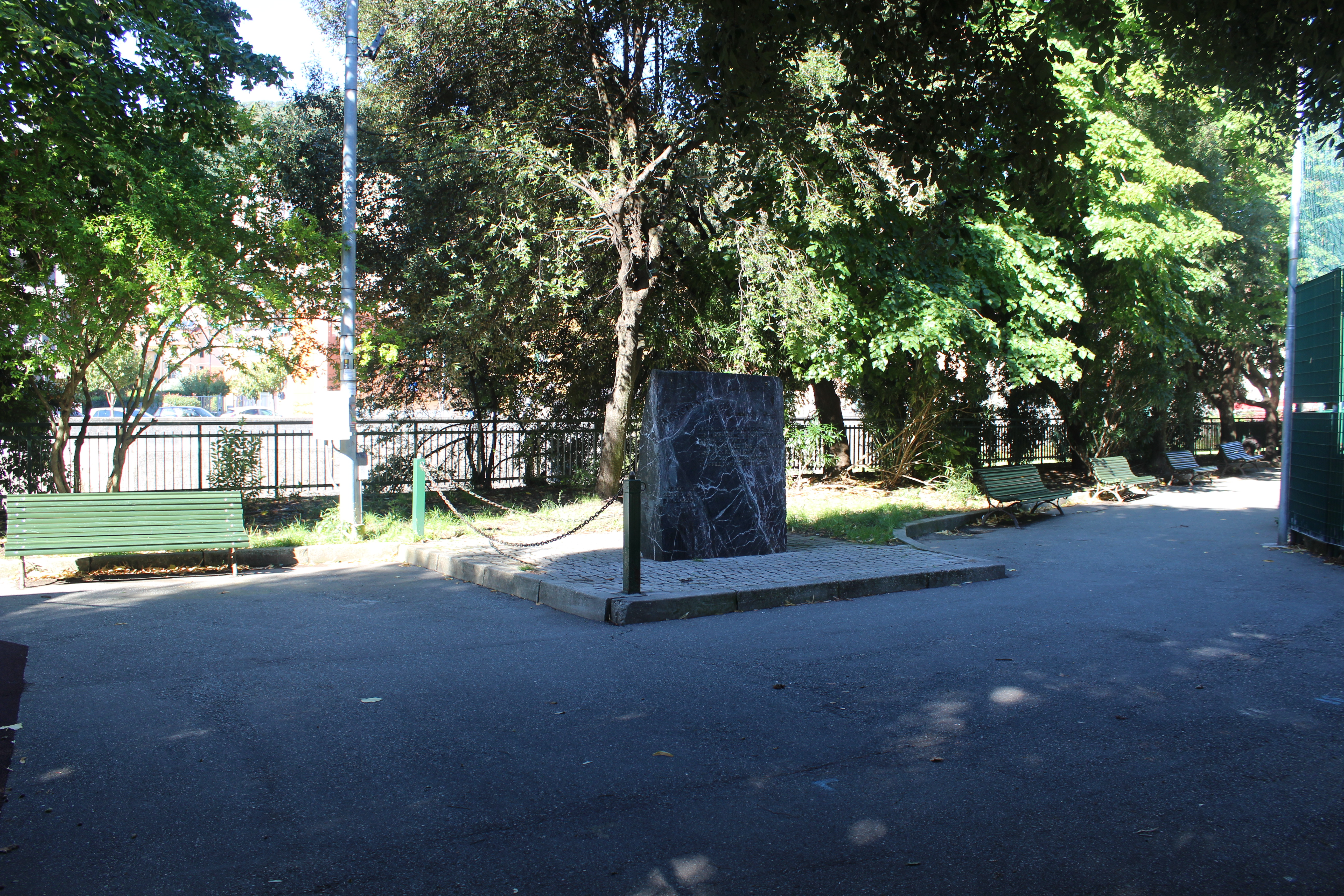 Blocco monolitico in marmo scuro, attraversato da fitte venature bianche, di forma rettangolare con superfici levigate e spigoli netti. Sulla faccia frontale compaiono iscrizioni incise, con alcune parole disposte in diagonale nella parte alta. Il monumento è collocato su una piattaforma leggermente rialzata in betonelle, delimitata da paletti verdi uniti da catene.
