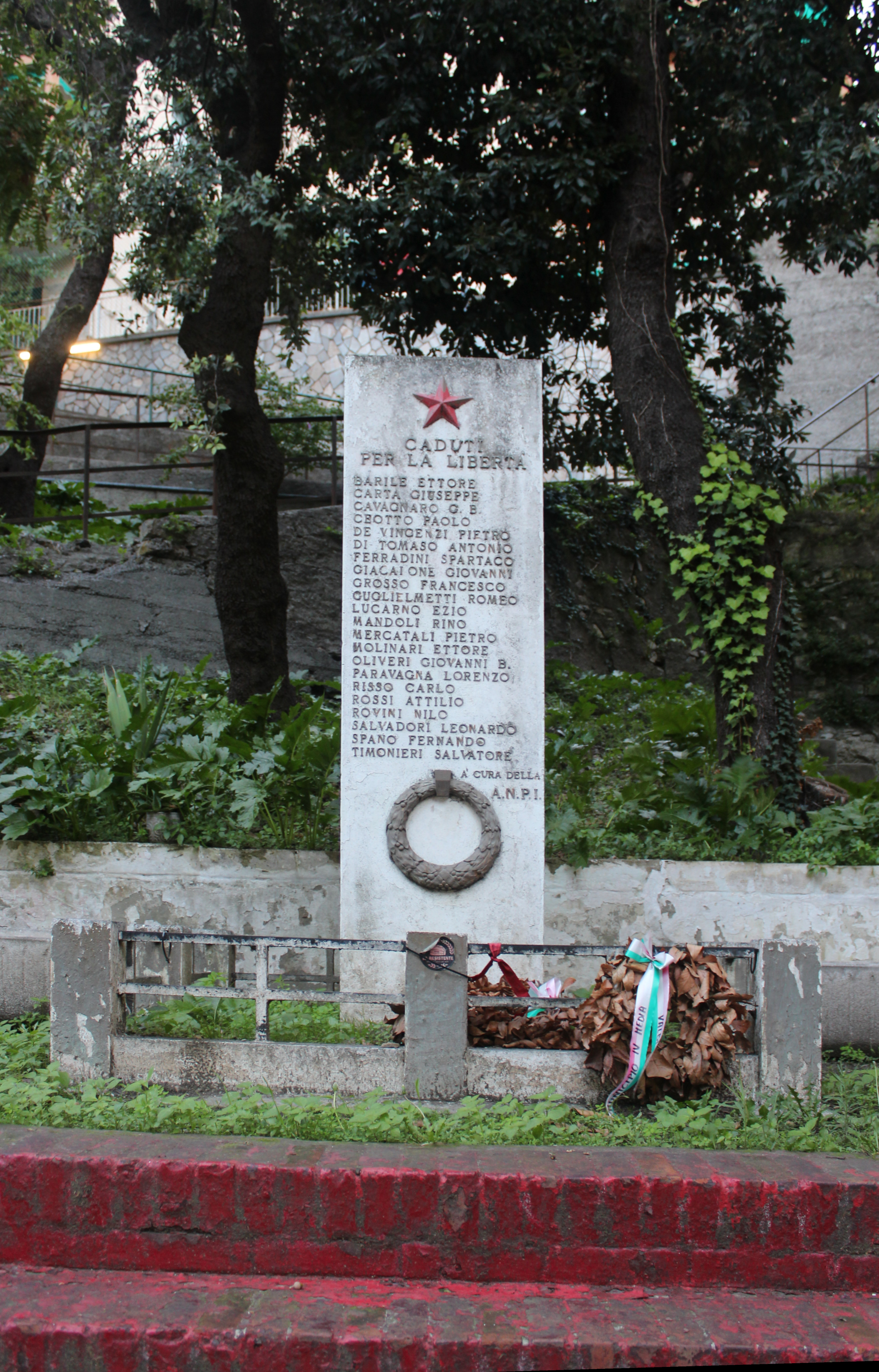 Monumento ai Martiri della Benedicta di Bosio Bosio (AL) Campo della Gloria Alessandria (AL) Lapide ai ferrovieri caduti per la Libertà Genova (GE) Lapide ai caduti del Molo Genova (GE) Lapide ai caduti per la Libertà di Sampierdarena Genova (GE) Lapide ai caduti per la Libertà di San Marcellino Genova (GE) Lapide ai caduti per la Libertà di San Teodoro Genova (GE) Lapide ai caduti per la Libertà Sampierdarenesi Genova (GE) Sacrario dei Partigiani di Sampierdarena Genova (GE) Lapidi ai caduti di Oregina Genova (GE) Monumento ai caduti per la Libertà di Oregina Genova (GE) Lapide ai partigiani caduti di Promontorio Genova (GE) Lapide ai caduti per la Libertà dell'istituto Galilei Genova (GE) Lapidi ai caduti di San Fruttuoso Genova (GE) Lapide ai caduti partigiani di Castelletto Genova (GE) Sacrario del Ponte Monumentale Genova (GE) Lapide ai caduti per la Libertà di Marassi Genova (GE) - Bra, 24.08.1944