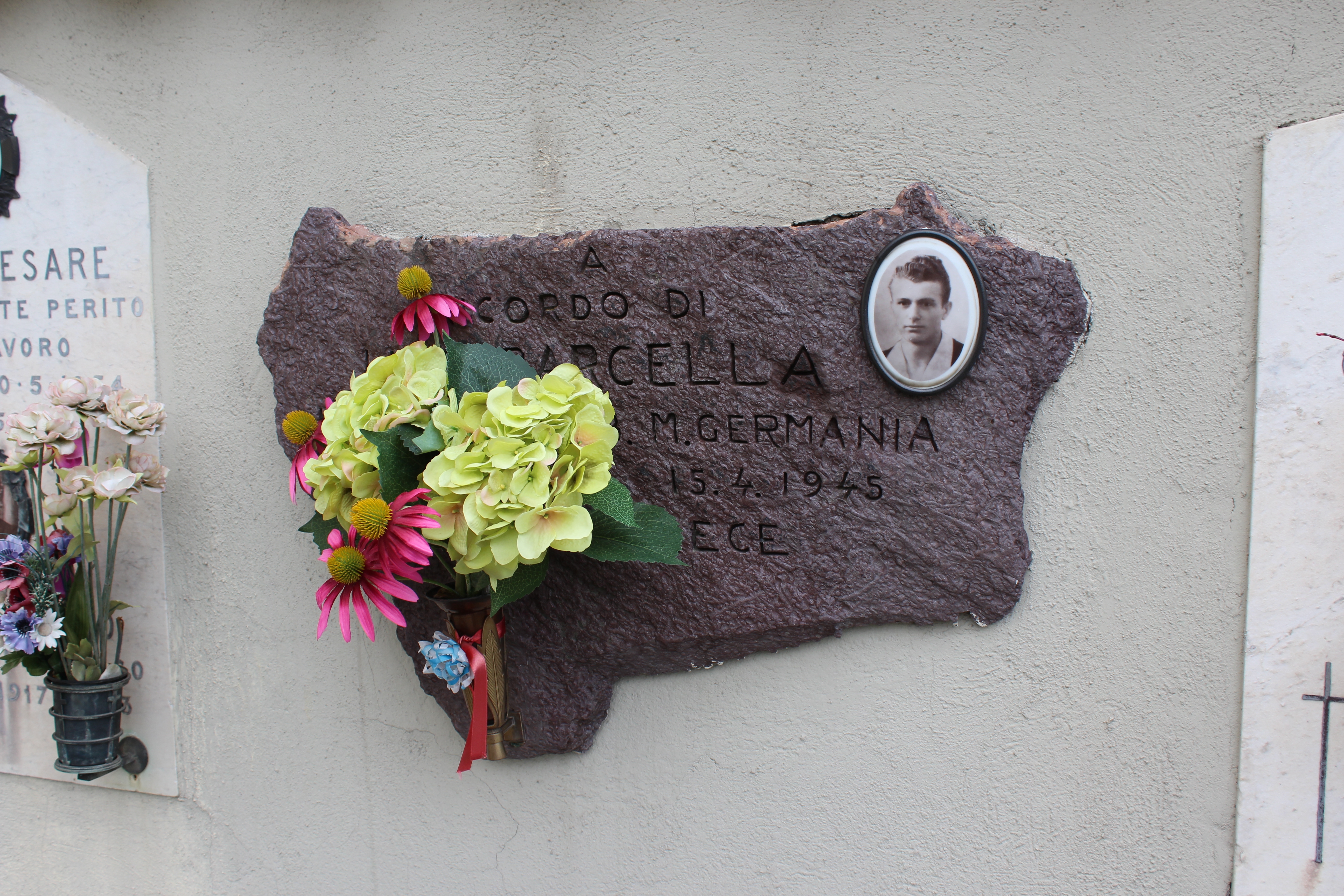 Lastra commemorativa in pietra scura, irregolare e ruvida, fissata a una parete. Presenta iscrizioni e un piccolo portacero metallico in basso a sinistra e, a destra, un medaglione ovale con ritratto fotografico in bianco e nero.