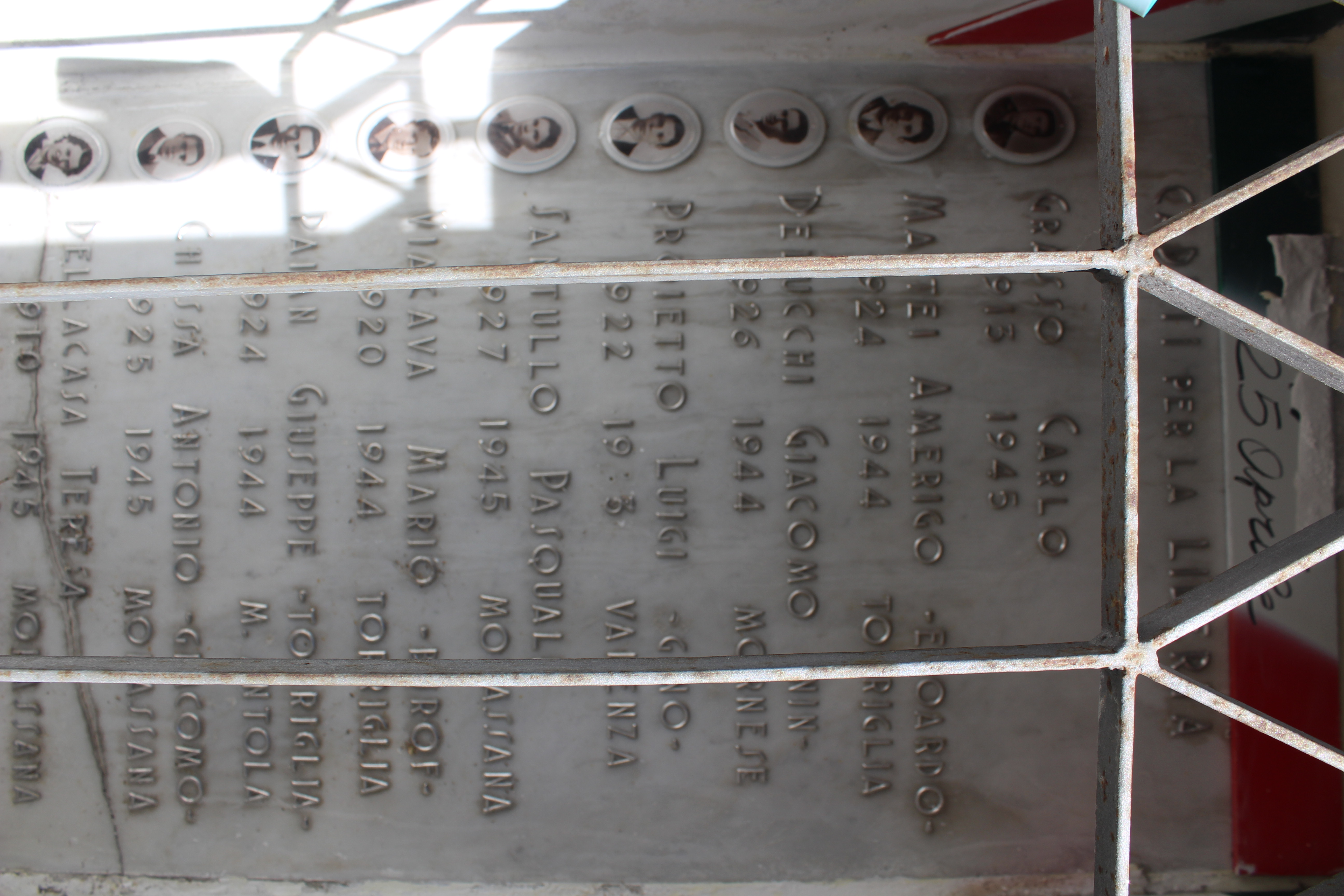 Piccola edicola memoriale incassata in un muro, con facciata in pietra chiara e coronamento a timpano. L’accesso è chiuso da un cancello metallico decorato da una stella centrale, barre ritorte e nastri tricolori. All’interno si vede una lastra in marmo con iscrizioni incise e piccoli ritratti. Ai lati del vano ci sono due stelle metalliche e vaschette porta-fiori. Si trova all’aperto, lungo una strada, delimitata da una catena e un piccolo parapetto.