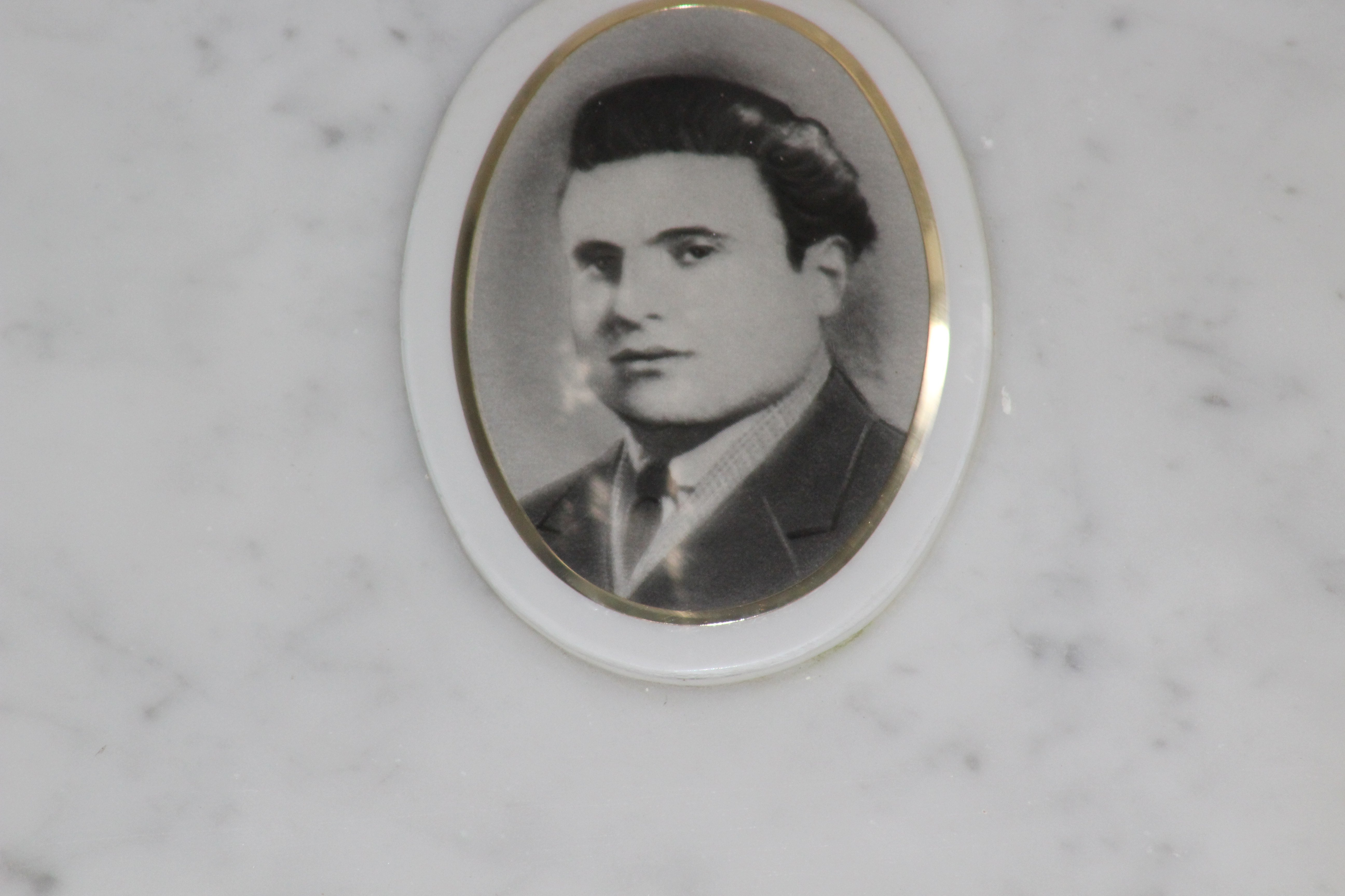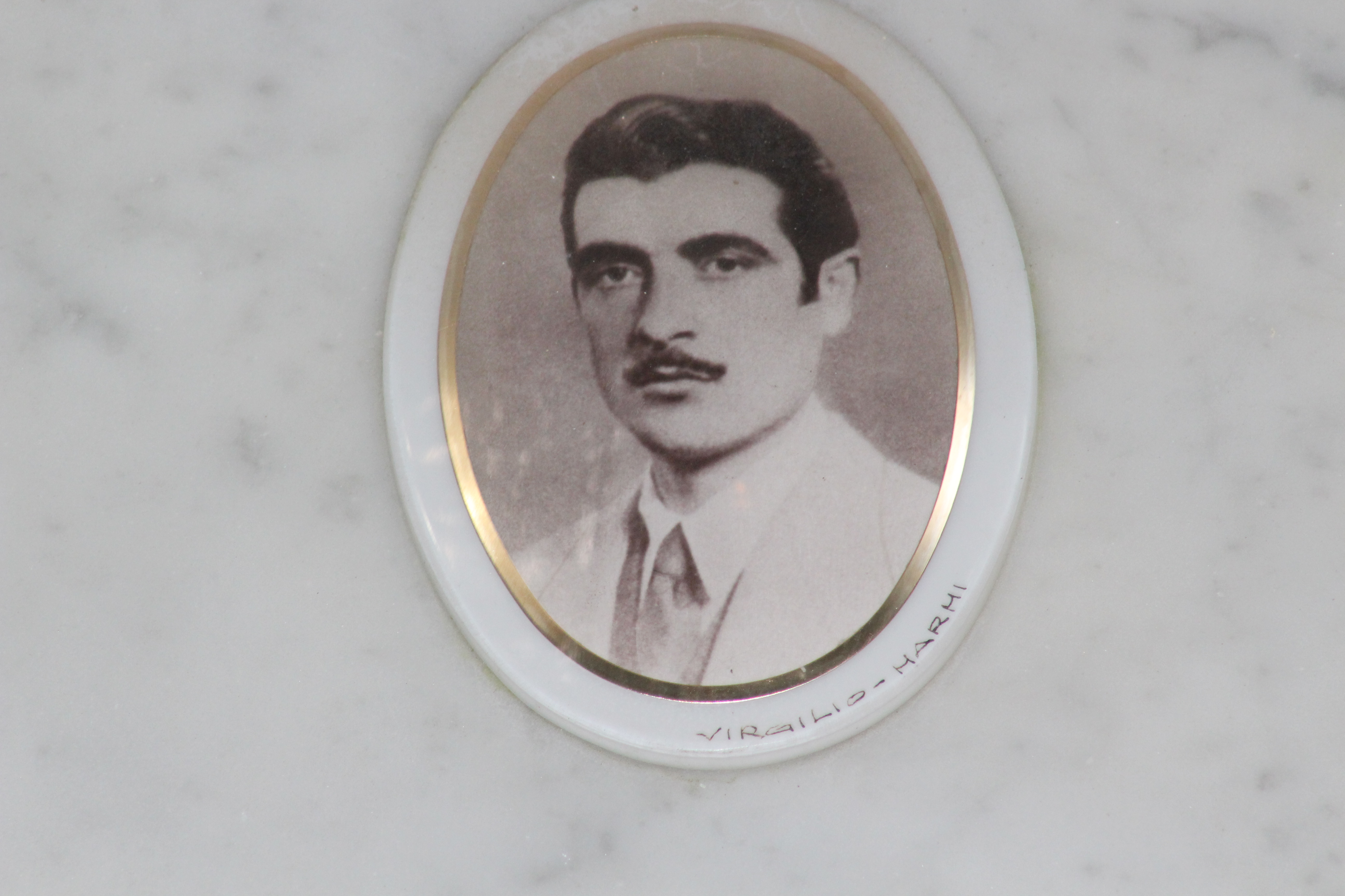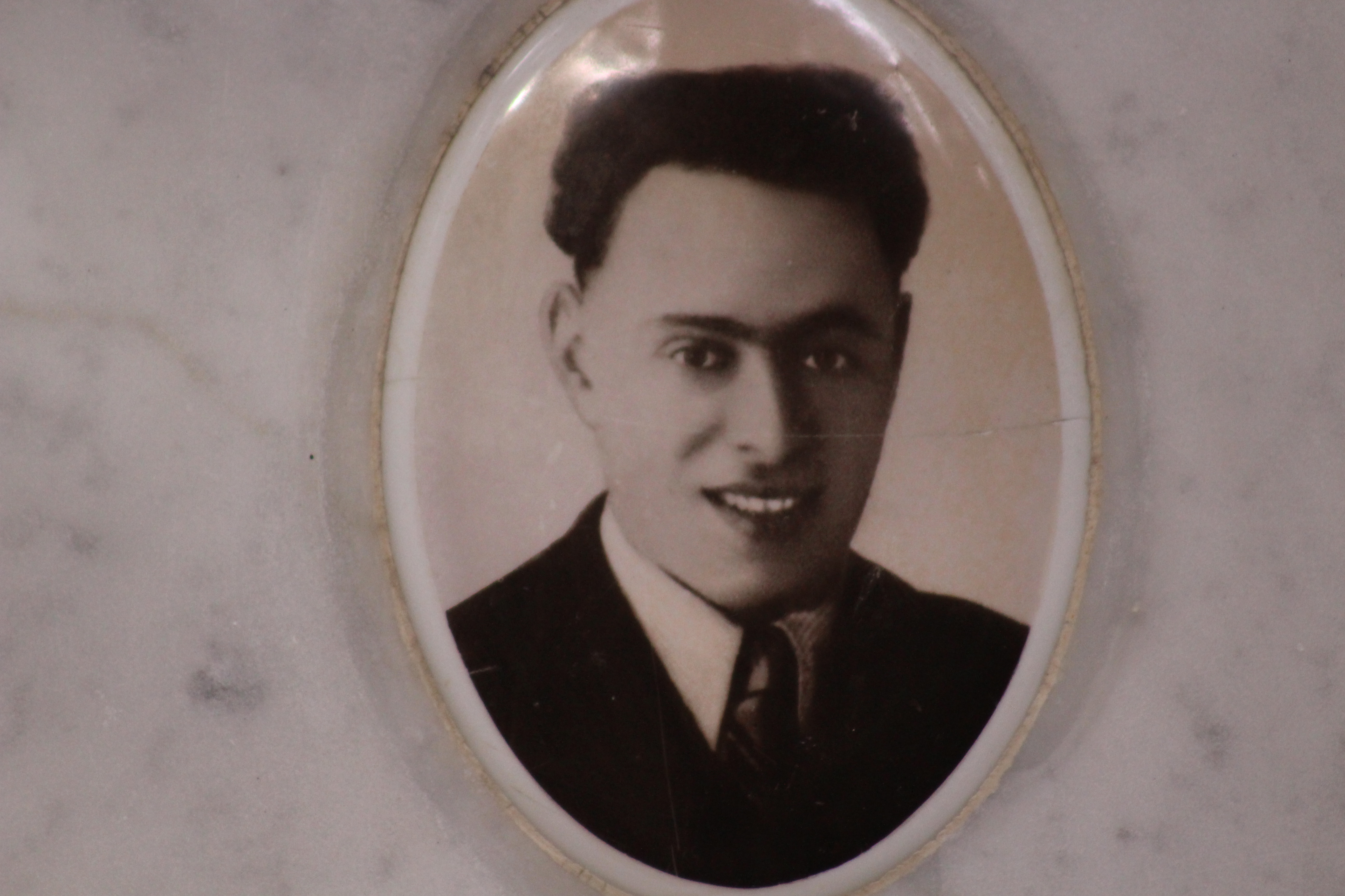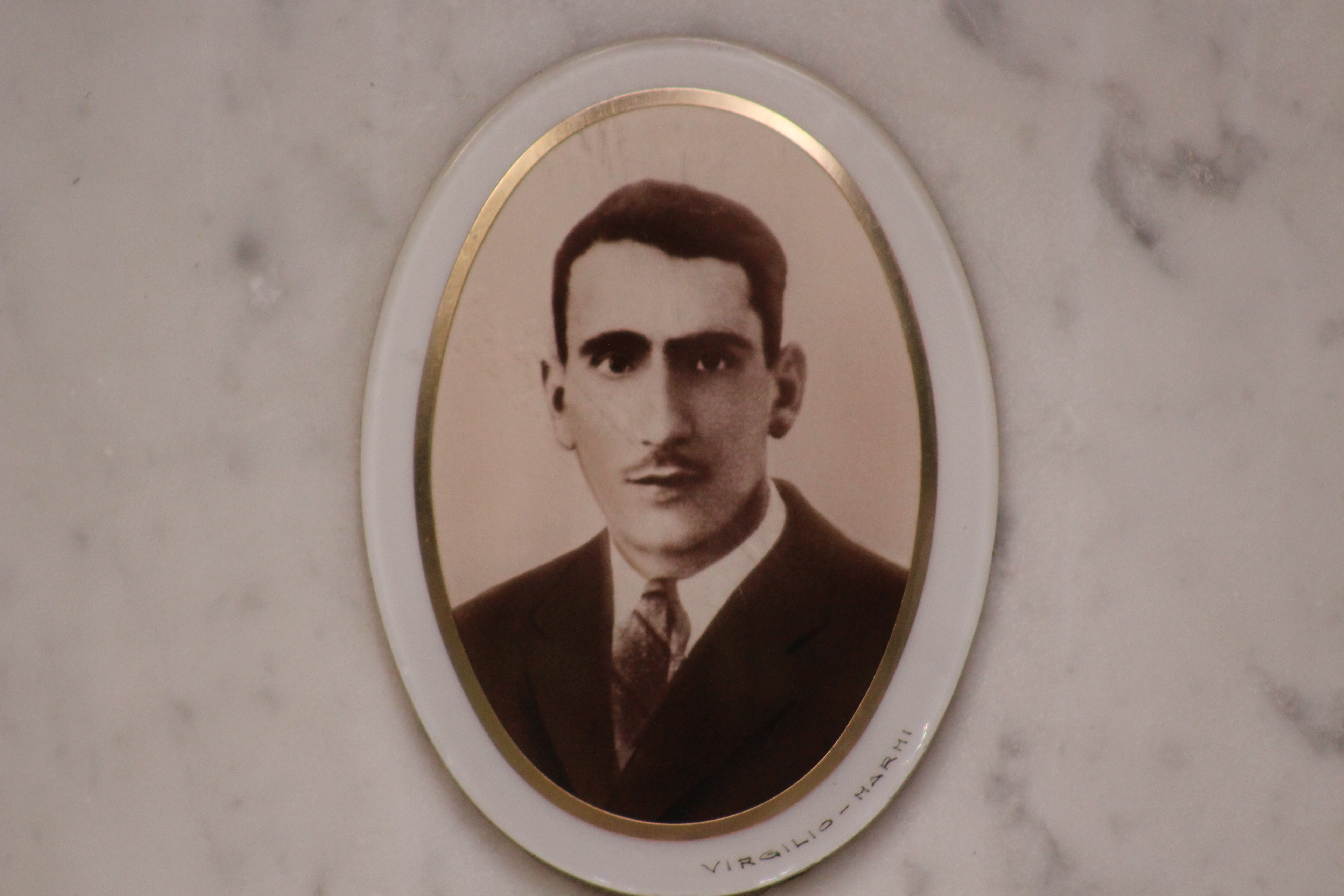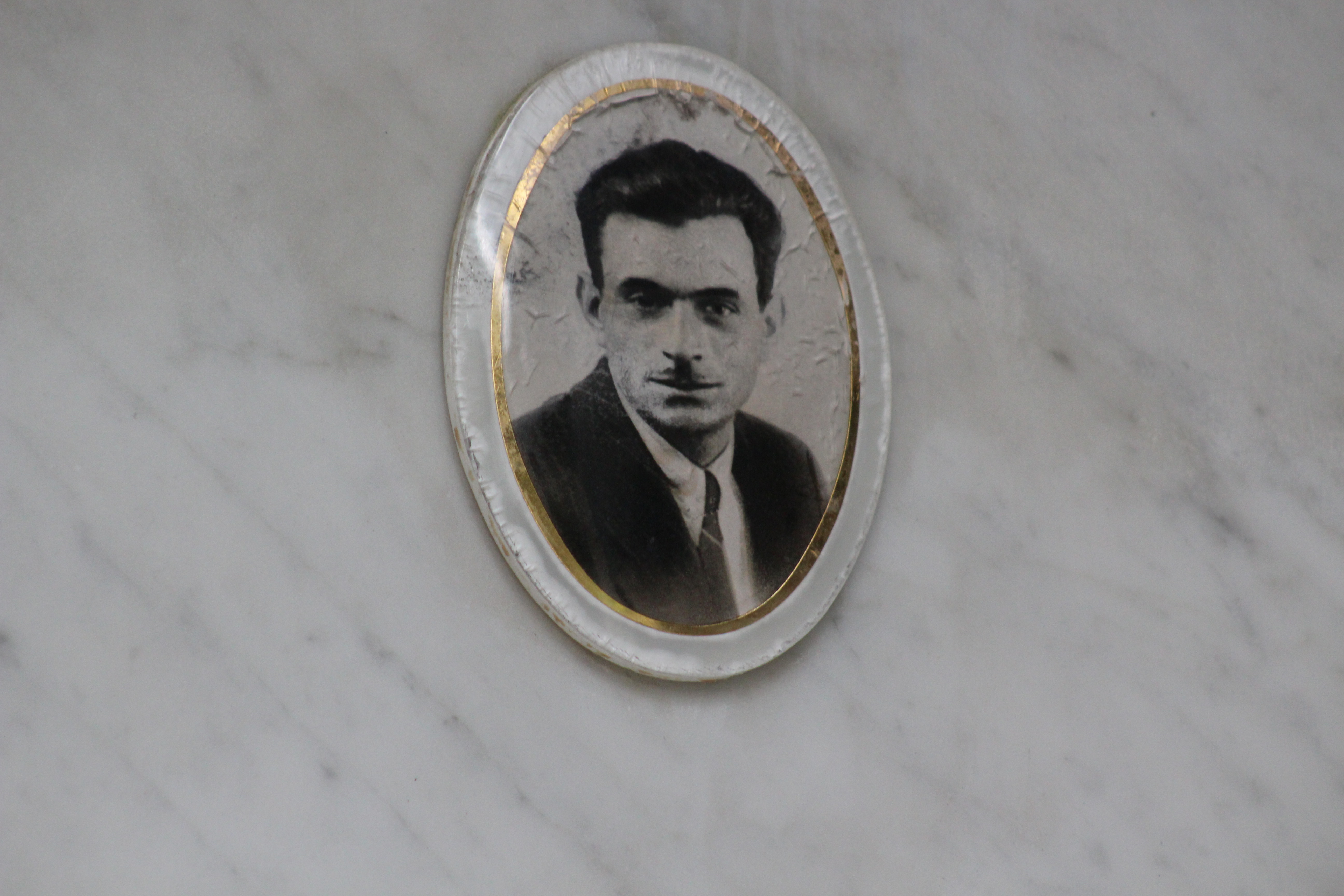 Struttura commemorativa a portico in pietra e cemento, di colore grigio, con trabeazione orizzontale e pilastri squadrati che incorniciano una parete di nicchie rivestite da lastre marmoree chiare. Sulla trabeazione corre un’iscrizione in rilievo. Al centro, su un basamento, una piccola statua in bronzo. Le lapidi presentano testi incisi e piccoli ritratti ovali. Collocato in ambito cimiteriale tra alberi alti.